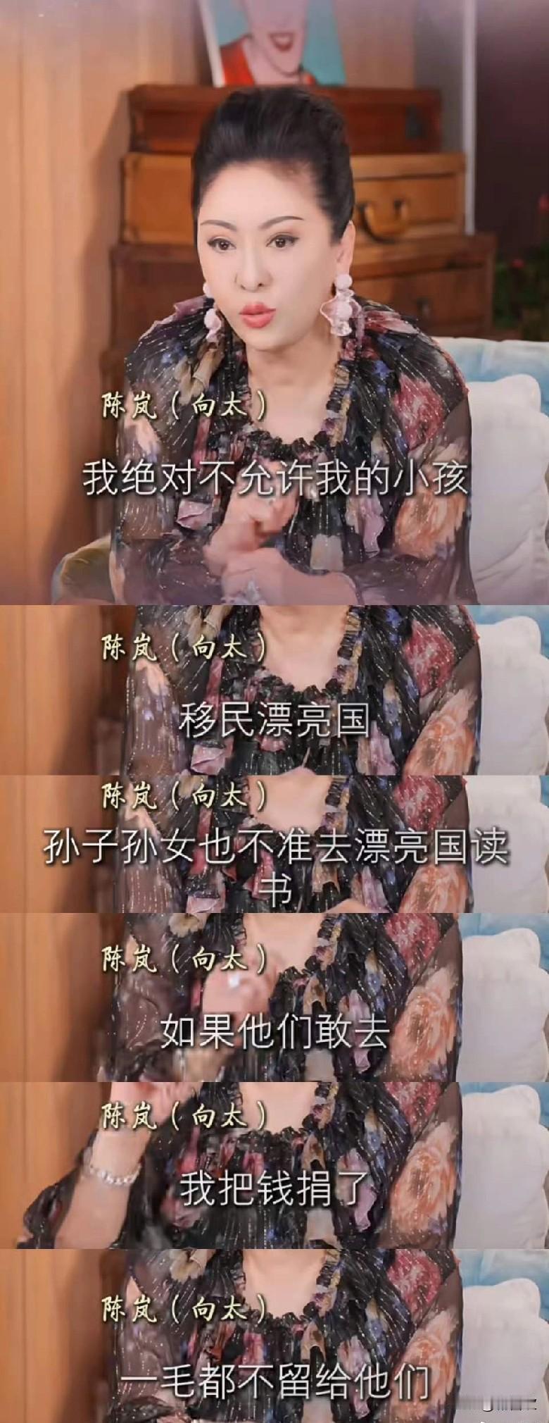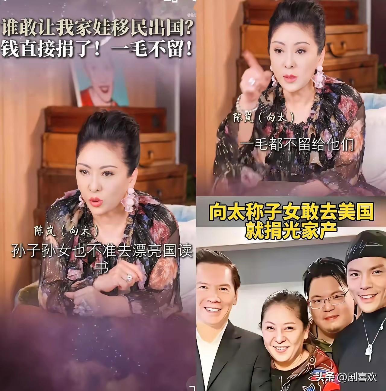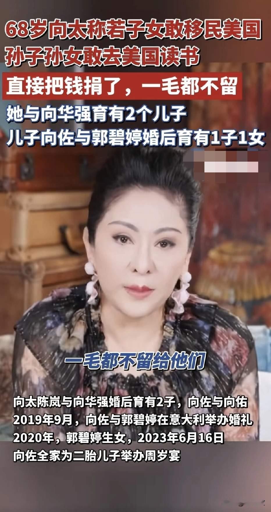 向太一句话炸出“双标富人”? 宗馥莉刘亦菲沉默,真相太戳心! 向太这发言真够狠!放话子女 敢移民美国就捐光家产, 连孙辈赴美读书都不准, 直言国内安全、名校多,不比国外差。这话一出口,连宗馥莉、刘亦菲都没吭声,反倒把不少有钱人的底给扒了。 关键不在狠话多霸气,而在它戳中了大伙的痛点:多少明星企业家赚着国人的钱,喊着爱国口号,转头就偷偷移民。向太敢把态度摆上台面,对比那些“当面一套背后一套”的,确实显得清醒。 但也有人说她是拿捏了流量密码, 毕竟自家孩子也在其他国家读过书。 可不管咋说,她点破的“国外月亮不圆”的道理,倒是打了不少崇洋媚外者的脸。爱国从不是口号,真扎根在哪,比啥都实在。 你觉得向太这话是真心清醒, 还是蹭流量?