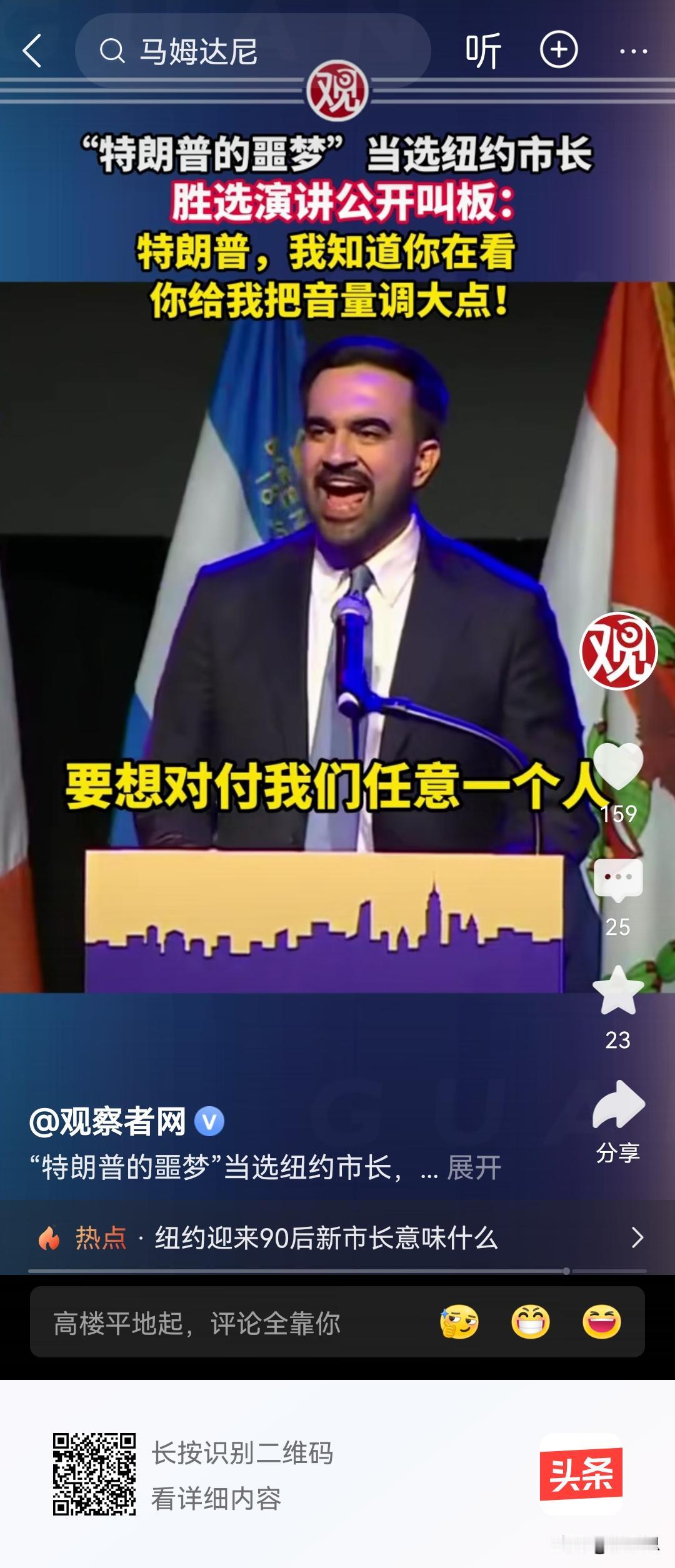 特朗普的噩耗啊,新当选的自称是印度裔穆斯林的纽约新市长公开叫板特朗普,叫他把音量开到最大 ,在美国啊,要想赢得选举,必须要音量大,必须会夸夸其谈,滔滔不绝,必须会煽动演讲,必须会忽悠选民,这一点特朗普是这么过来的,这个,这个新当选的市长也是靠着特朗普的演讲技巧成功了。 但是他跟特朗普不对付,因为特朗普污蔑他是共产党。但是马姆达尼也是个投机分子,他是的父母是印度锡克族裔(就是那种戴裹头巾的),是锡克教徒!却又自称是穆斯林,还声称是民主社会主义者!他吃透了美国政治的漏洞,编织选民喜欢听的话,利用选民对共和民主两党的失望,画出天大的大饼!他是印度人在美国的特洛伊木马!但有一点,他跟印度莫迪应该是不对付的。这一点他可能成为莫迪和特朗普共同的敌人。