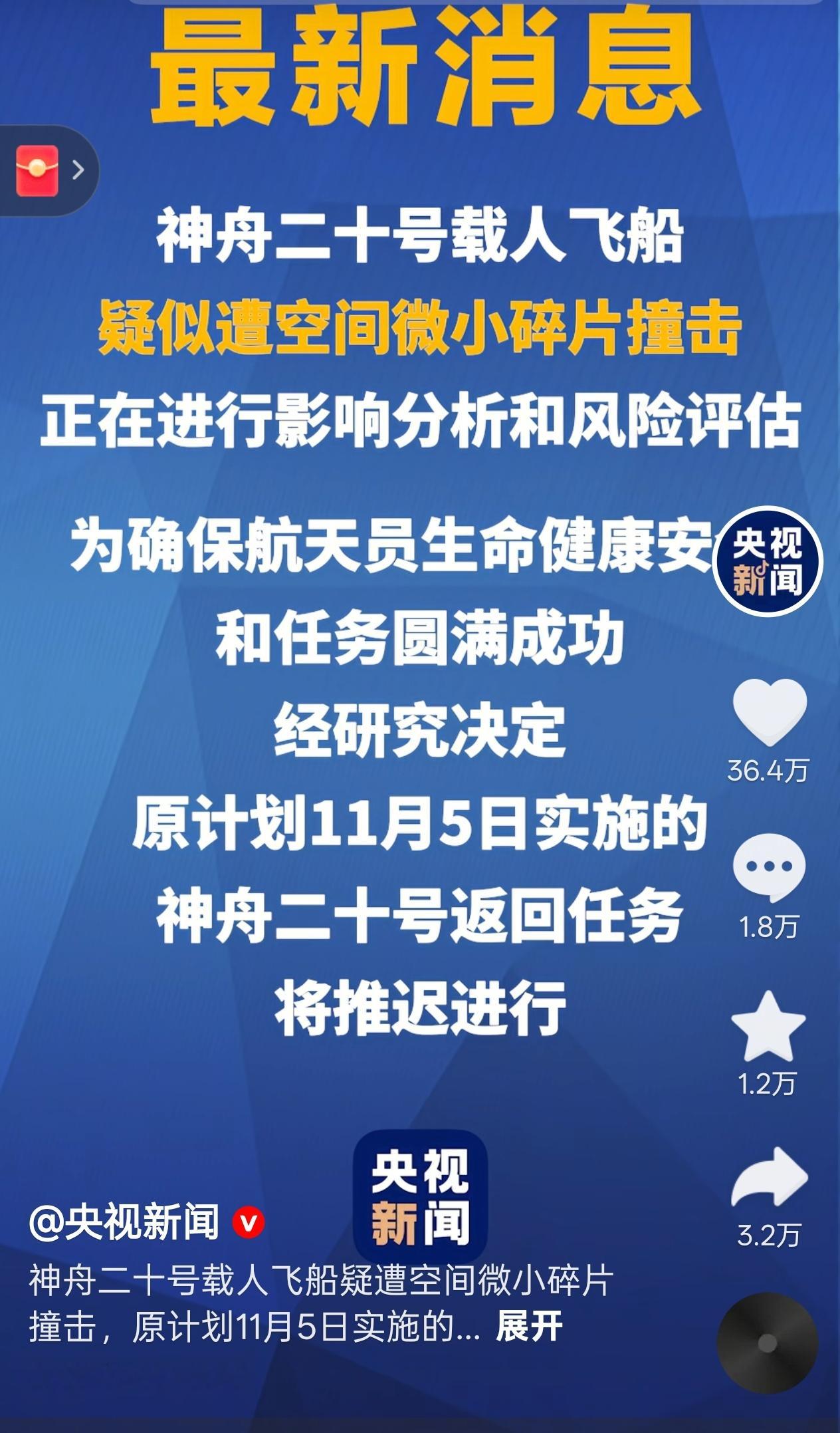 什么情况,神舟十二号遭空间微小碎片撞击了?! 晚点回来没关系,一定要回来[祈祷]