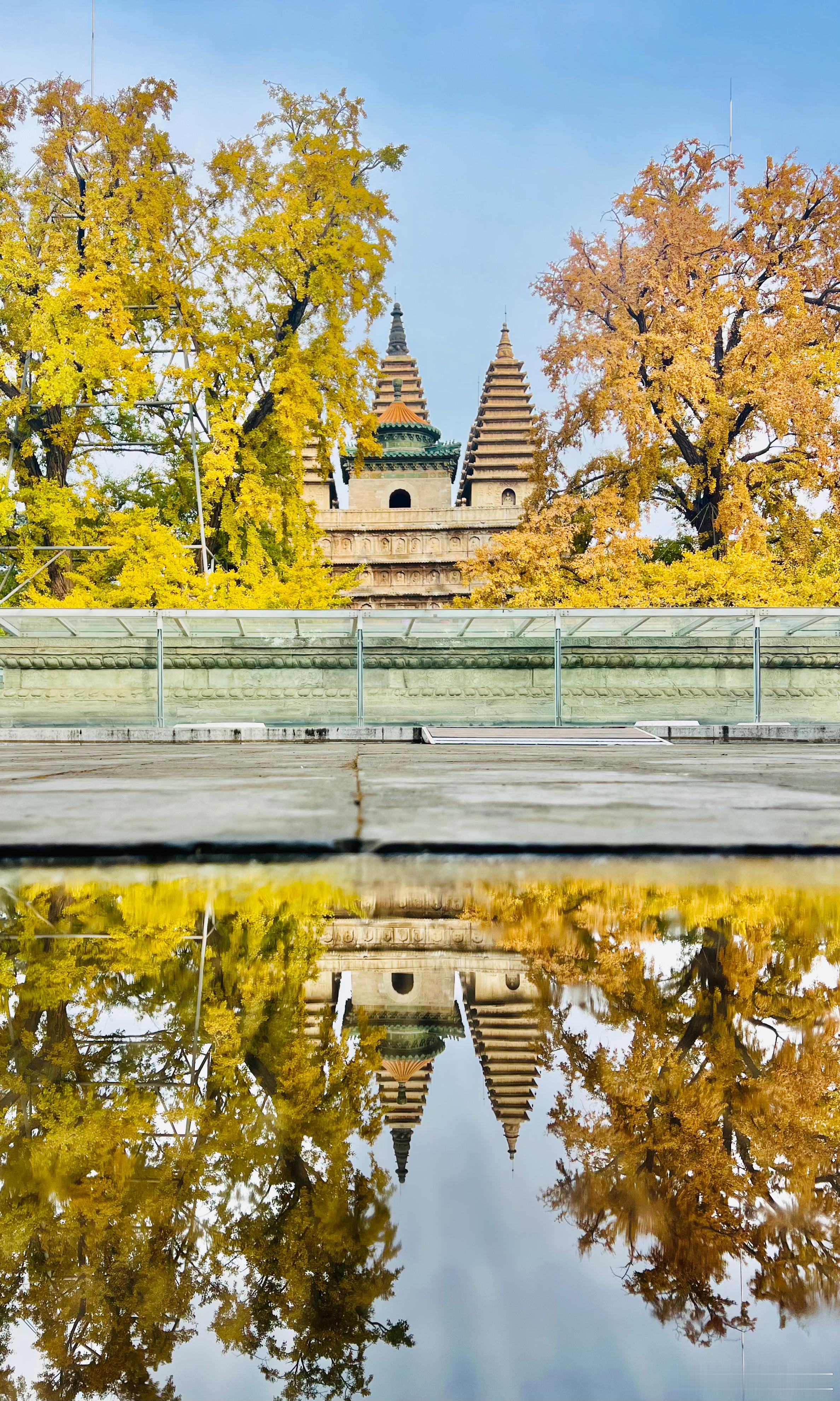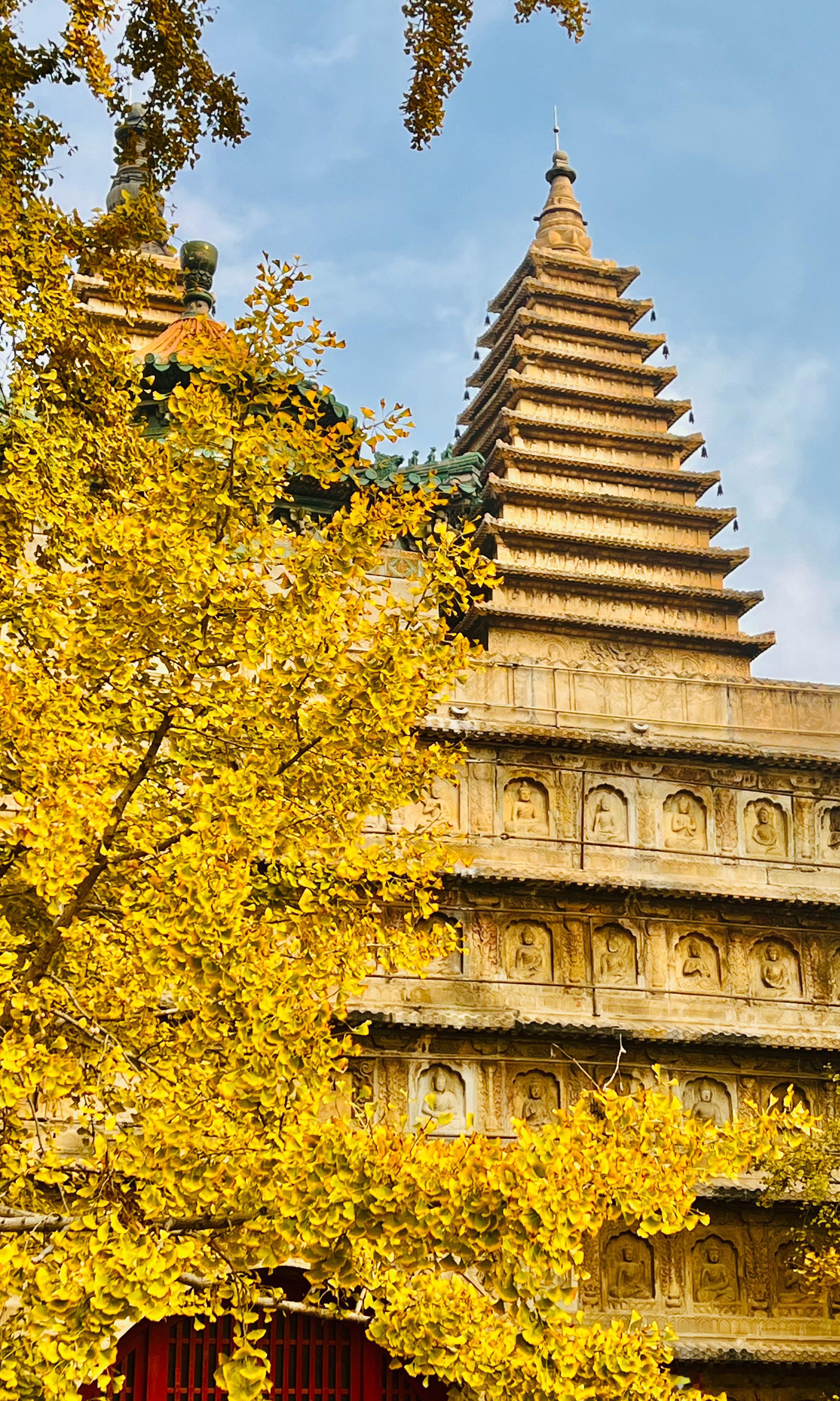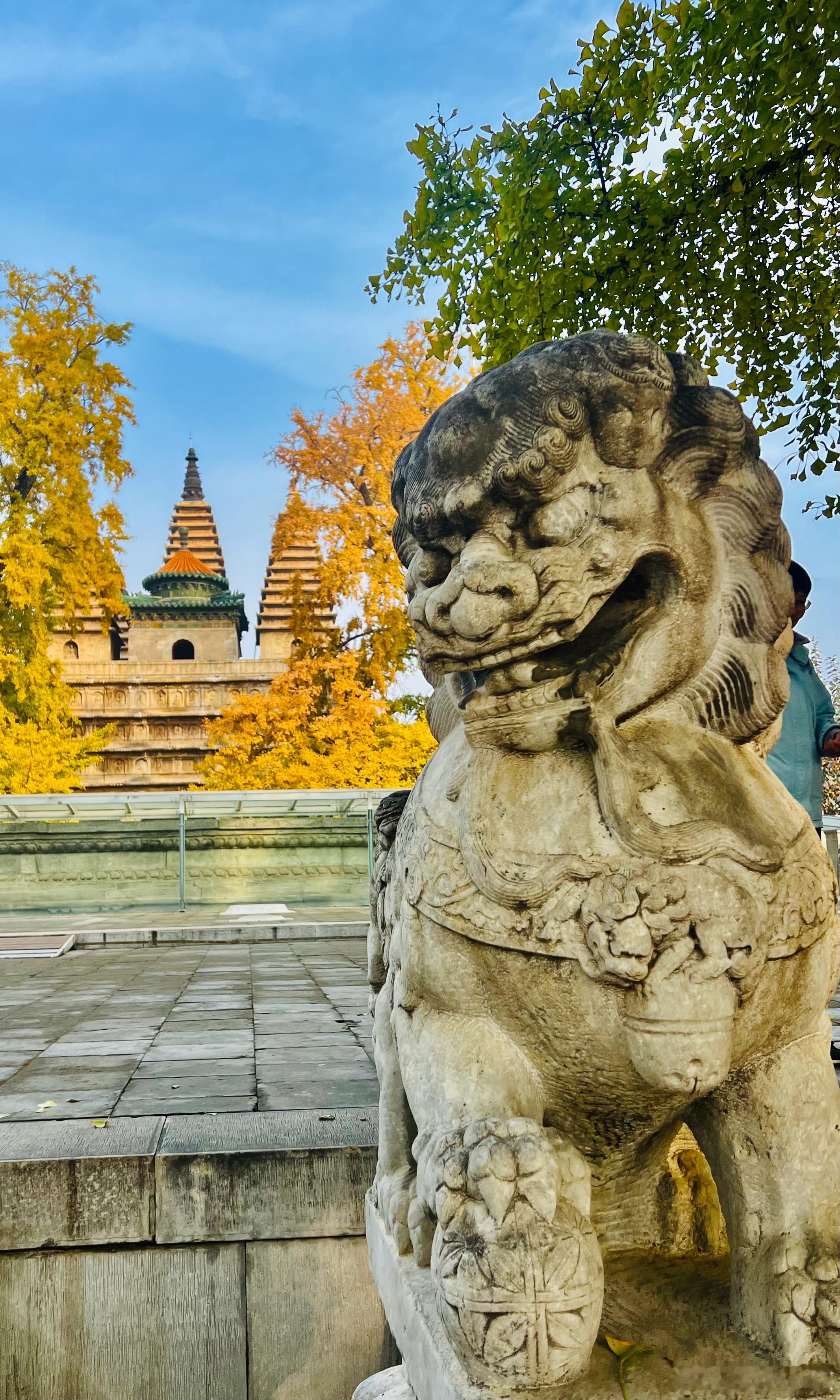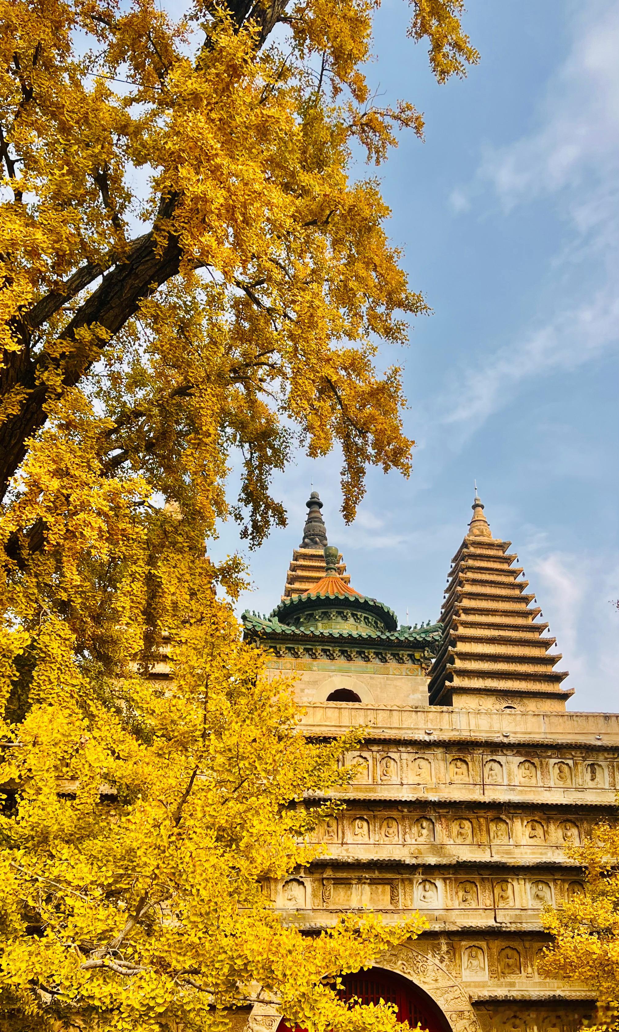【五塔寺】古寺塔如笔,银杏画秋章。客来阶下立,仰见柿子黄。摄影