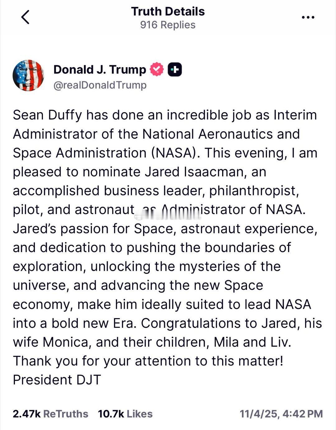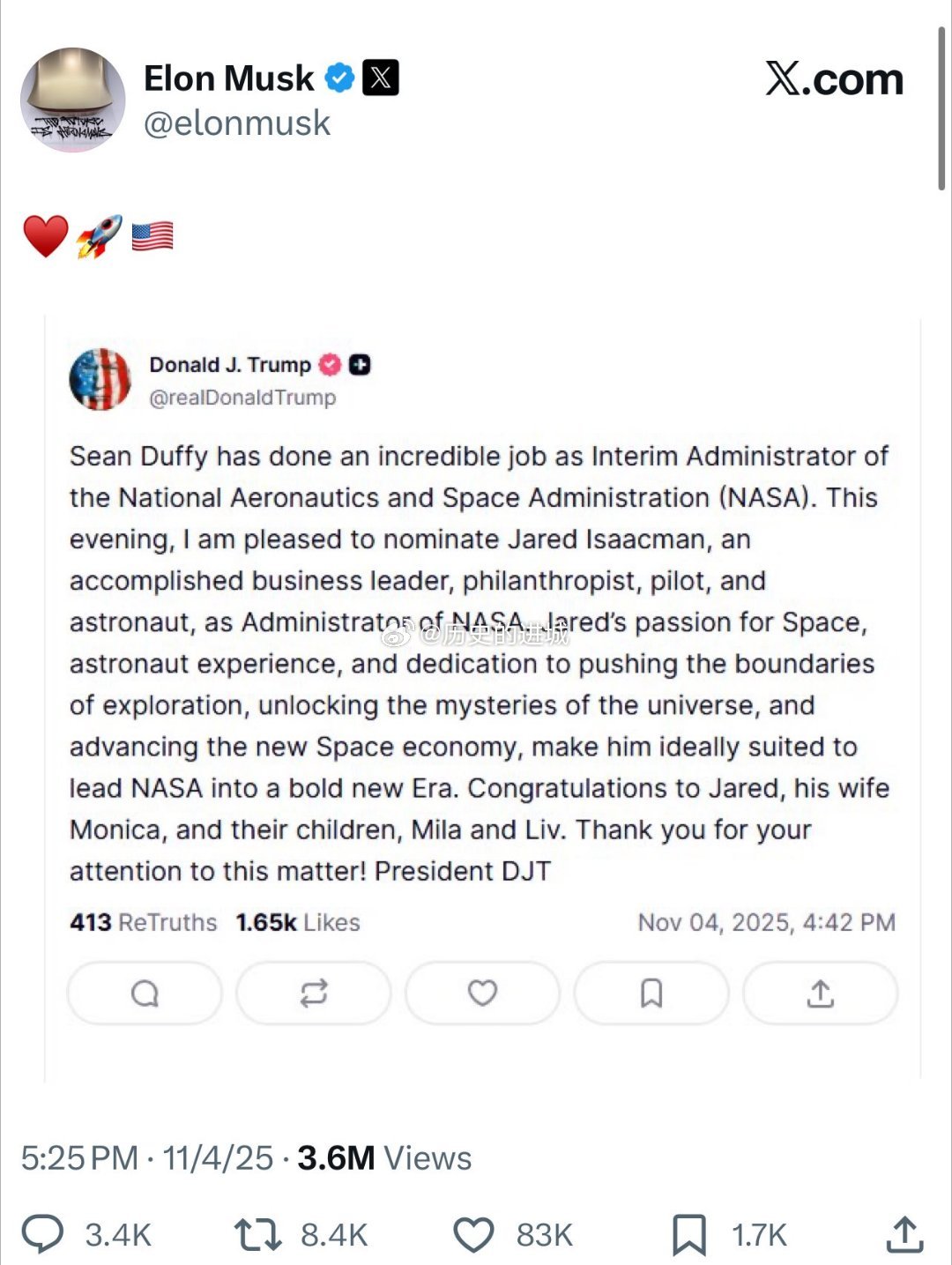 今日特朗普正式和马斯克达成和解,特朗普同意任命马斯克挚友,华盛顿亿万富翁企业家、私人宇航员贾里德·艾萨克曼担任NASA局长。现在马斯克在NASA左手是甲方,右手是乙方,赢麻了。