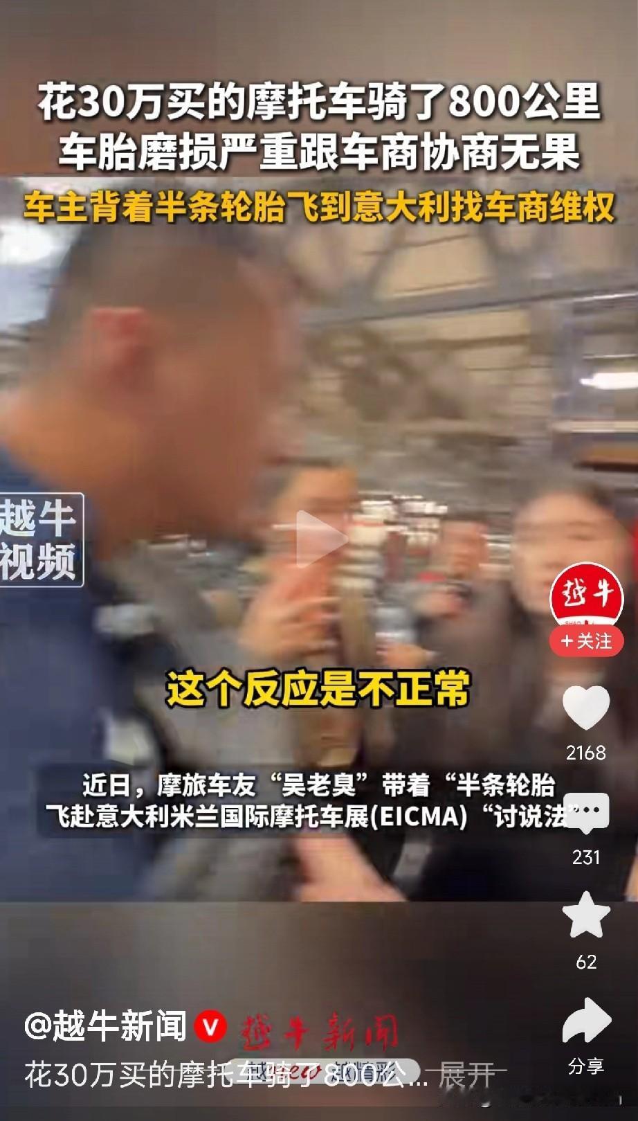 这才是真硬核维权! 最近摩友圈炸锅了——车友“吴老臭”花30万买的爱车,才骑800公里轮胎就磨成光头胎! 找车商理论反被踢皮球,普通人可能就自认倒霉了,但这位大哥直接扛着半条磨损轮胎,买张机票直奔意大利摩托车展现场讨说法! 要知道这可不是从城东跑到城西,是直接杀到品牌方老巢! 在米兰国际展馆里,他举着证据直面厂商的视频瞬间刷屏。网友怒赞:“当代较真侠!”“这机票钱比维权律师费管用!” 这件事最解气的是什么? 是打破“消费者弱势”的固有剧本! 当某些品牌还想着“冷处理”时,有人用行动证明:全球化时代,每一个较真的消费者都是监督者。你敷衍问题,我就让问题在世界舞台曝光! 为什么一条轮胎引发全民声援? 因为大家苦“产品质量甩锅”久矣!30万不是小数目,800公里的磨损更非正常。车企可以讲情怀谈配置,但最基本的质量底线不容突破。 这位车主背着的何止是半条轮胎? 分明是千万消费者的尊严重量! 期待后续能给所有支持者一个交代! (文章素材来自越牛新闻,侵删)