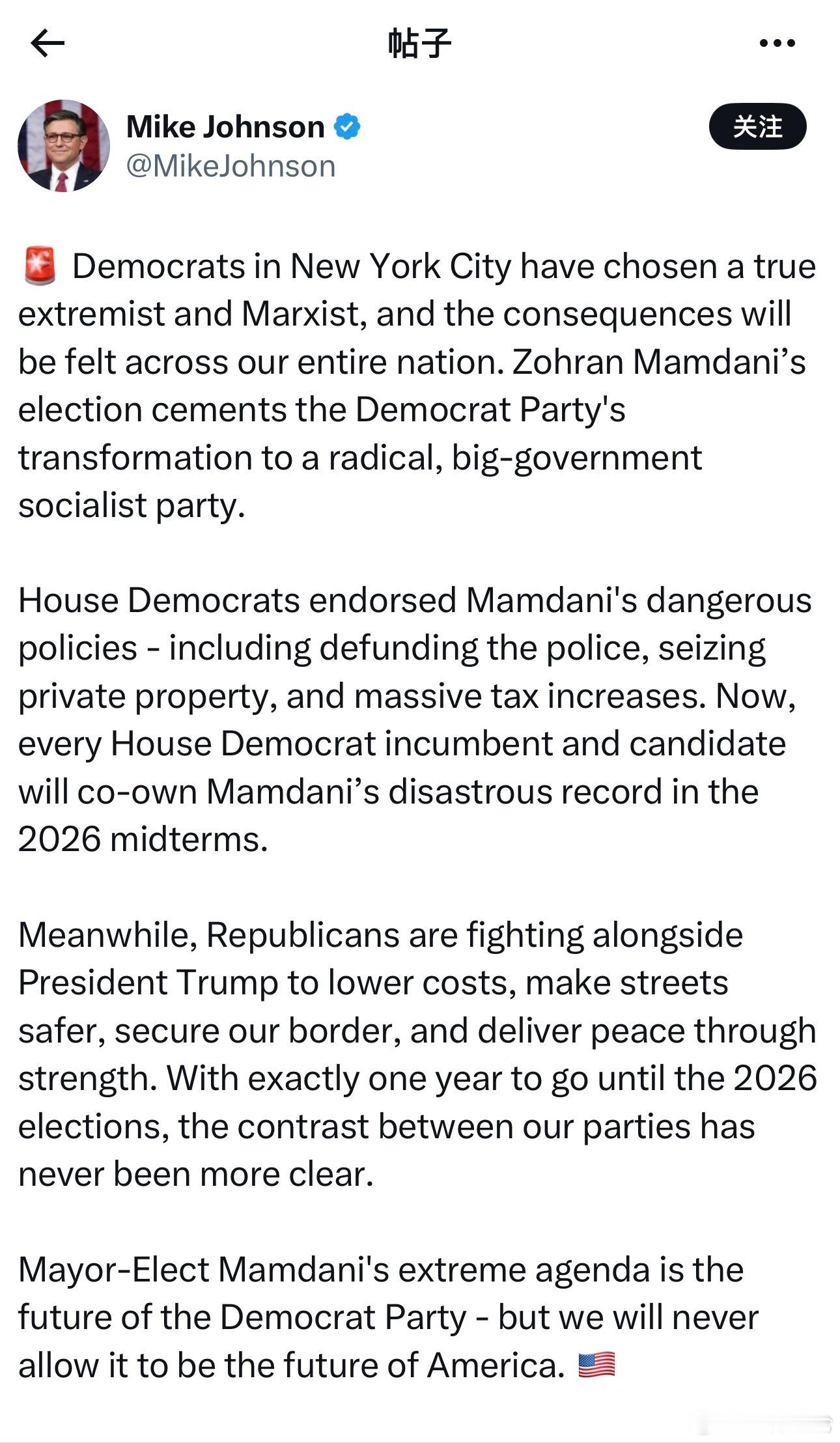 众议院民主党人支持了曼达尼那些危险的政策——包括削减警力、没收私产和大幅增税。现在,每一位现任及竞选的众议院民主党人都将在2026年中期选举中与曼达尼的灾难性记录共同承担责任。📉🏛️