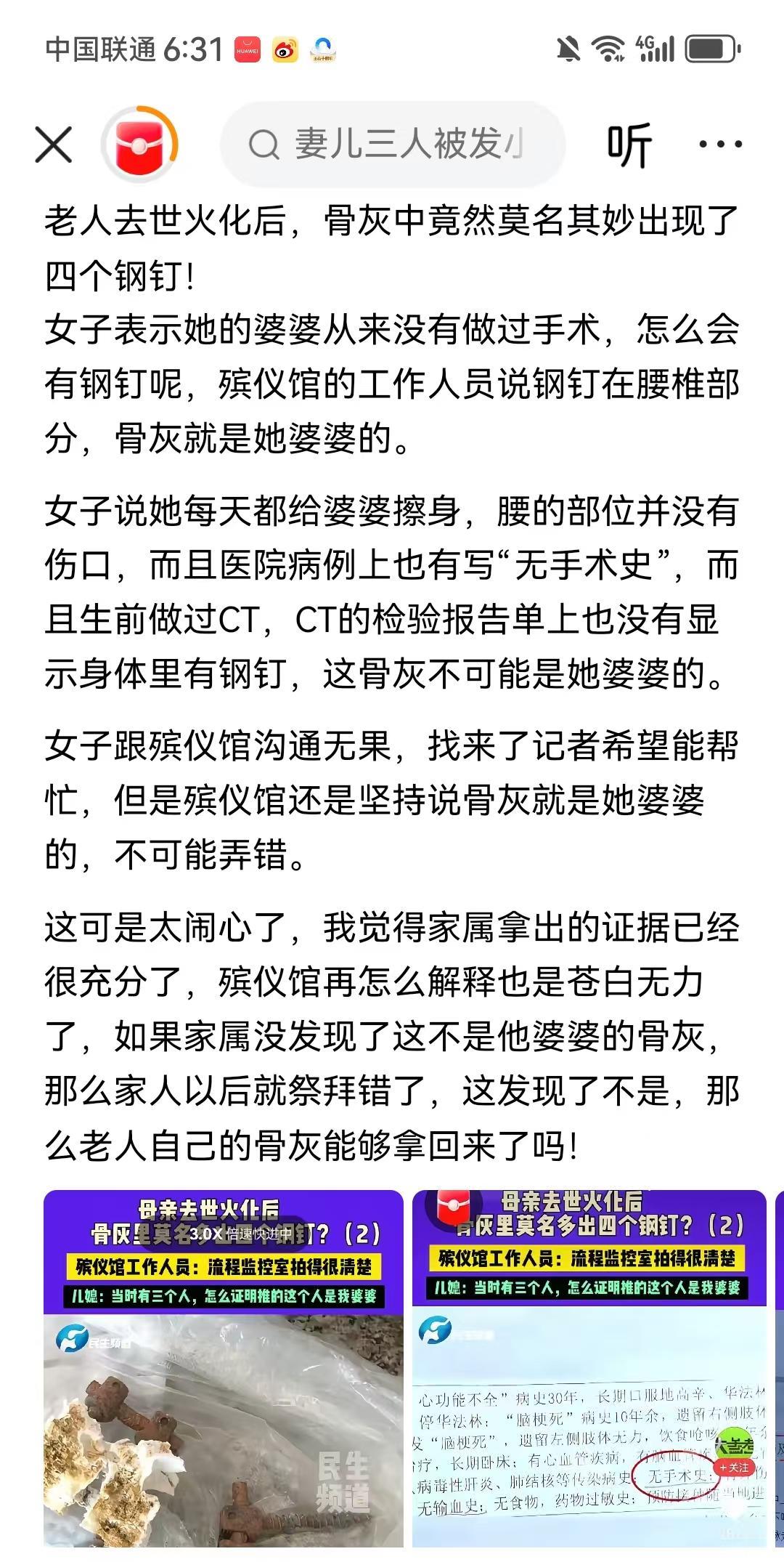 老人去世火化后,骨灰中竟然莫名其妙出现了四个钢钉!非常简单。如果是当天火化的骨灰,查一下哪个先人生前做过这种骨折后的手术(估计先人生前应该是坐轮椅),不就结了么?这是两个人的骨灰搞错了。 是的,里面不可能扫干净,有前面残留的很正常。 都在一个炉里火花然后铲一盒灰给你,你说这灰是不是都是你家的。 殡仪馆不承认自己有错,就是不愿意赔偿损失。普通炉都是混着烧的,豪华炉单独烧贵。