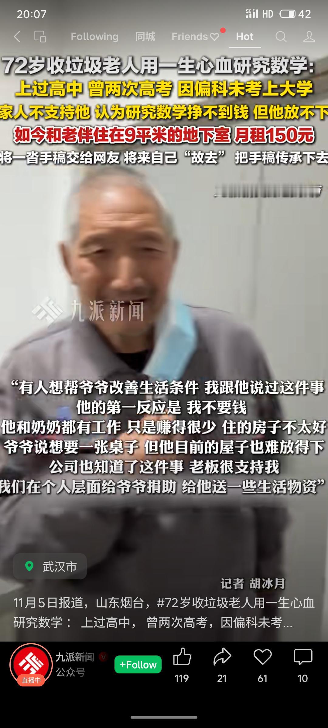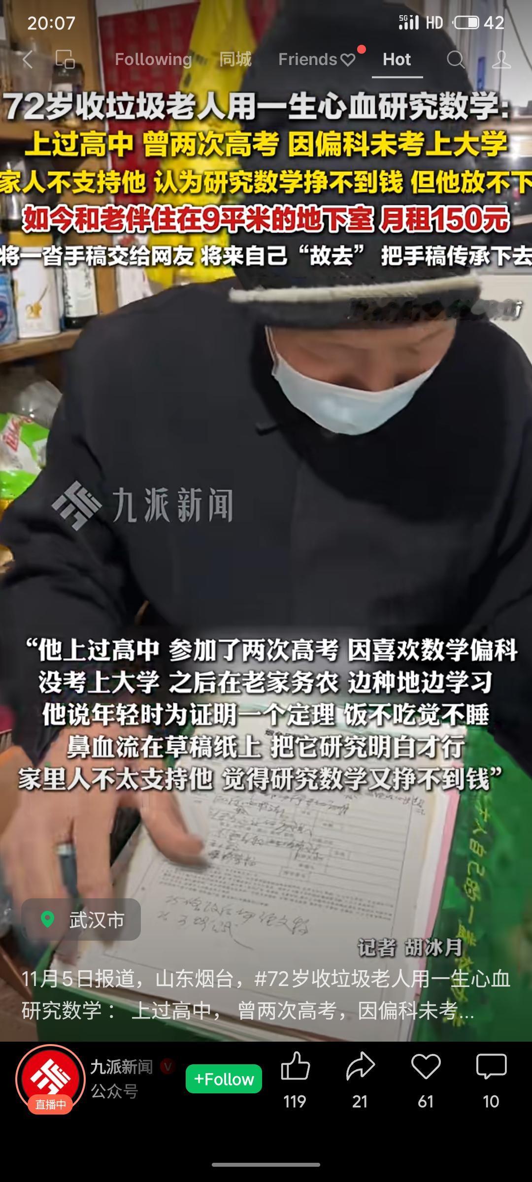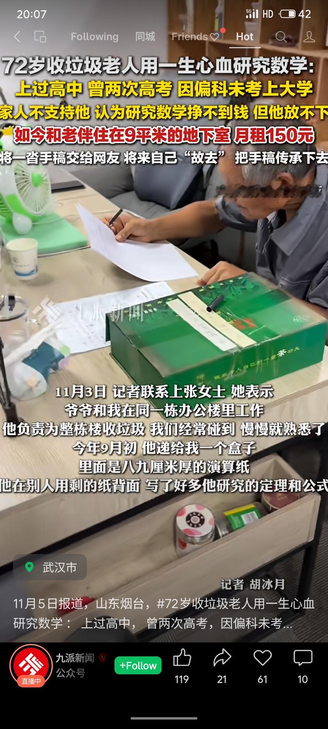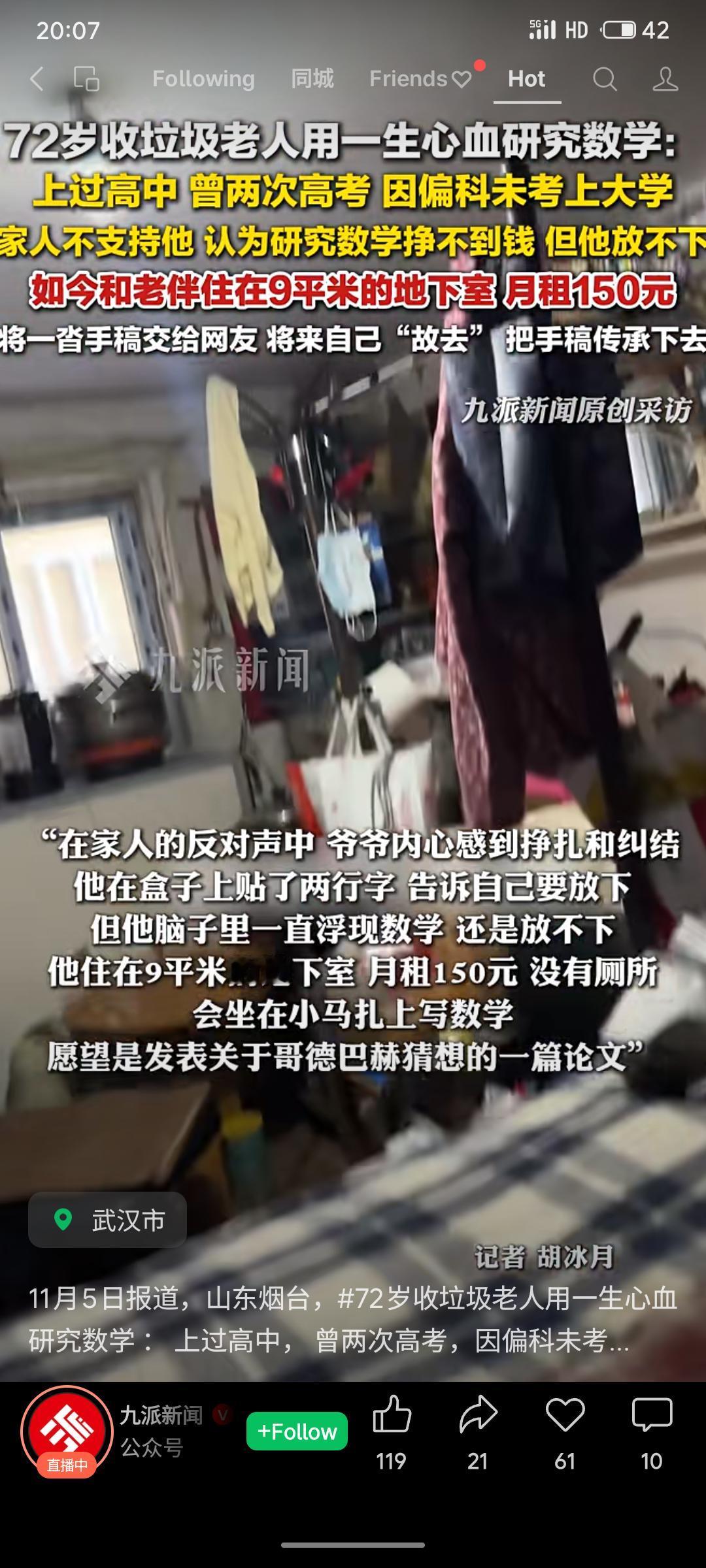 72岁收垃圾老人毕生痴迷数学研究,曾两次高考因偏科未上大学。家人反对其研究,他与老伴蜗居9平米地下室,月租150元。近日将厚达八九厘米的手稿托付他人,希望自己"故去"后研究成果得以传承。老人最大愿望是发表关于哥德巴赫猜想的论文。