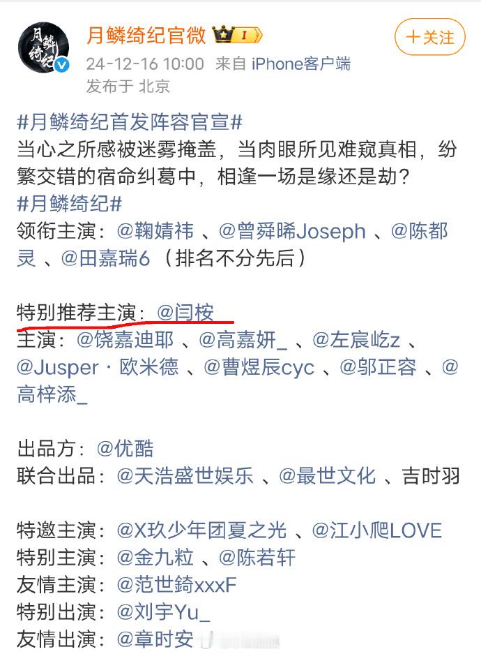 月鳞绮纪是鞠婧祎陈都灵的男三。资本真的太疯狂了,只播了一部剧+男配专业户,就这样顺顺利利当上田曦薇的男主了[无聊][无聊]我发现闫桉粉丝有点子搞笑[允悲]这样子很拉好感!粉丝也是过于谦卑了哈哈哈 这是真盼着他进组啊