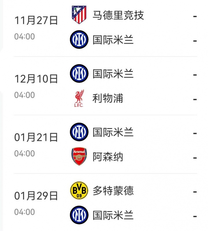 虽然第一阶段前四场比赛全胜,但国米接下来的欧冠赛程凶险异常。本阶段下半程,国米将先后对阵马竞、利物浦、阿森纳和多特,其中对阵马竞(第5轮)和对阵多特(最后一轮)是客场作战。