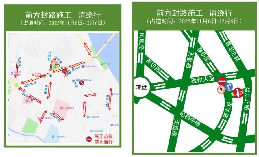 关于市中区嘉州大道与春华路交会处南侧路口断道施工的通告为实施嘉州大道排水防涝改造工程,现决定对嘉州大道与春华路交会处南侧路口断道施工,时间为2025年11月6日至12月6日。断道期间,机动车禁止通行,非机动车及行人可经路口两侧临时通道通行。施工给您带来不便,敬请谅解支持,请注意出行安全。乐山市住房和城乡建设局乐山市公安局乐山市市中区人民政府2025年11月5日