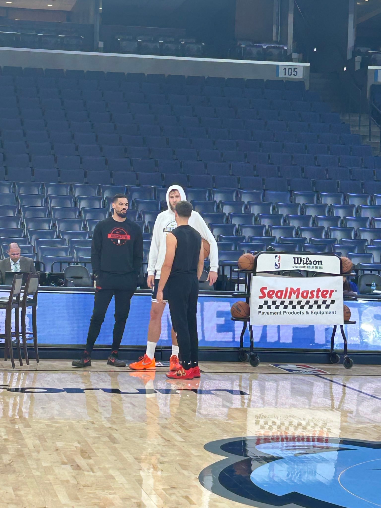 里德·谢泼德和助理教练加勒特·杰克逊正与前火箭球员乔克·兰代尔叙旧,后者现效力于孟菲斯灰熊队。