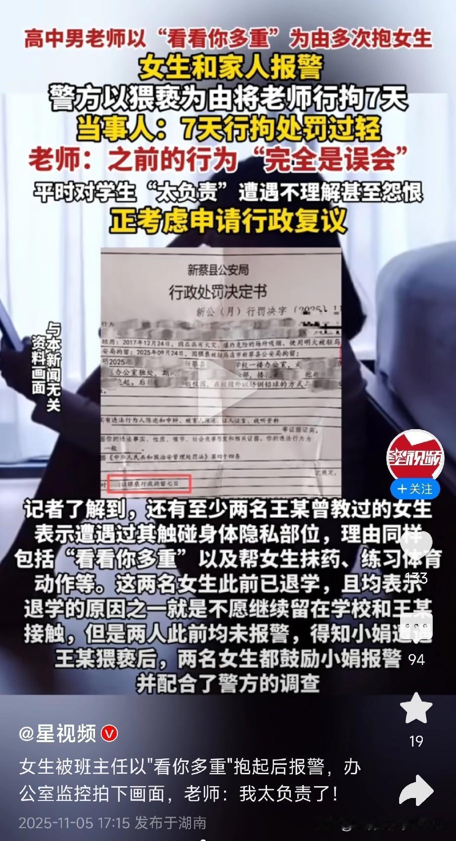 “我就是想看看你多重!” 当一位高中男老师对女学生说出这句话并伸手抱起时,谁都没想到,这竟成了他猥亵行为的惯用伎俩。 近日,某高中王某老师因多次以“称体重”为由拥抱女学生,被警方行政拘留7天。 然而事件远未结束——更多受害女生站了出来:有人曾被以“抹药”名义触碰隐私部位,有人因体育课辅导遭不当接触,更有两名女生因此退学! “完全是误会!” 面对指控,王老师竟辩解自己“太负责”遭怨恨,正考虑行政复议。 而事实是,那些被迫离开校园的女生,只因不愿再与他同处一所学校。 “女大避父,儿大避母”,古训早已提醒我们身体界限的重要性。 一个教书育人的老师,却利用职务之便行龌龊之事,这是对学生信任的背叛,对教师身份的亵渎! 7天刑拘实在太轻! 这种行为给花季少女带来的心理阴影可能伴随一生。 我们必须呼吁: 教育部门立即吊销其教师资格 学校加强师德师风建设 家长们一定要教会孩子勇敢说“不” 恶魔在人间,但绝不配站在三尺讲台!支持严惩,还校园一片净土! (文章素材来自星视频,侵删)