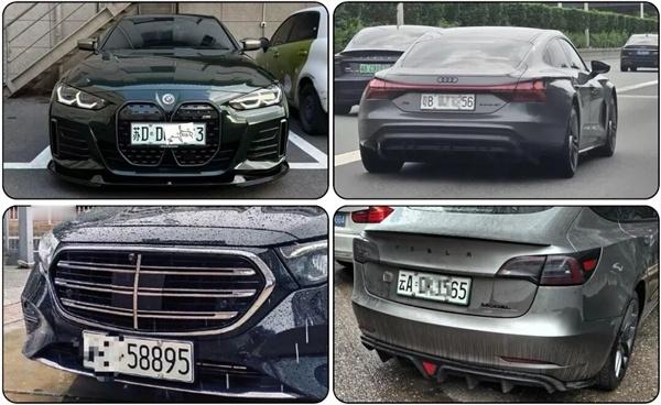博主展示的图片显示,有特斯拉、奔驰E级插电、宝马/奥迪新能源车型,悬挂底色为白色的新能源车牌,除了底色不同外,其它与新能源车牌完全一致。