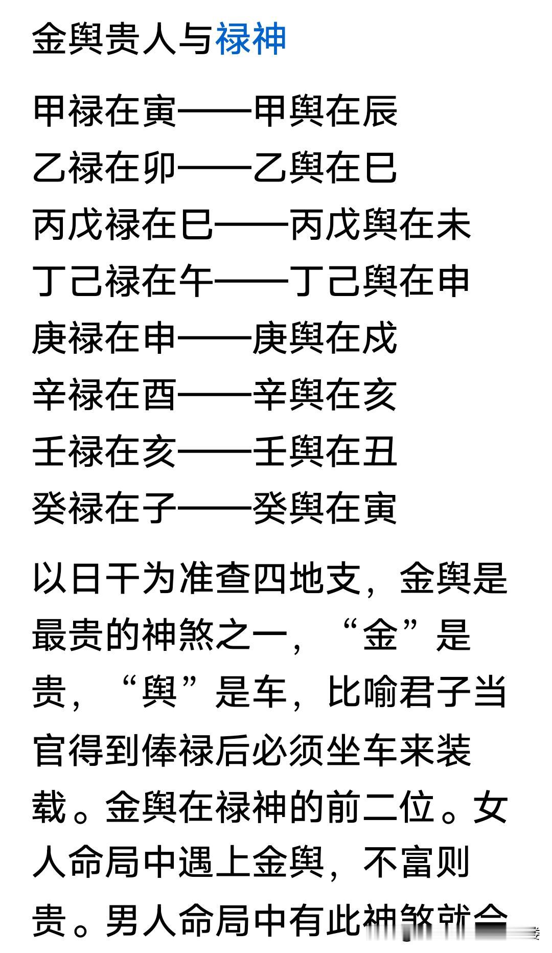八字中禄神,有明禄和暗禄之分。明禄就是日干在地支的临官之位,像甲木见寅,这是显性的吉兆,代表福气、俸禄和稳定收益。暗禄则是隐性福气,比如地支相合得禄、拱禄或者暗藏天干等方式获得。暗禄象征着隐性机遇,命主可能关键时刻会有贵人相助或意外收获,还能逢凶化吉。 再说金舆贵人,它常位于禄位前第二个地支,像甲子年生人禄在寅,辰就是金舆。命带金舆,性格温和、举止庄重。女人遇到非富即贵,男人会有很多妻妾且有阴德福气。生日、生时遇到最佳,能让家人平安,子孙兴旺。