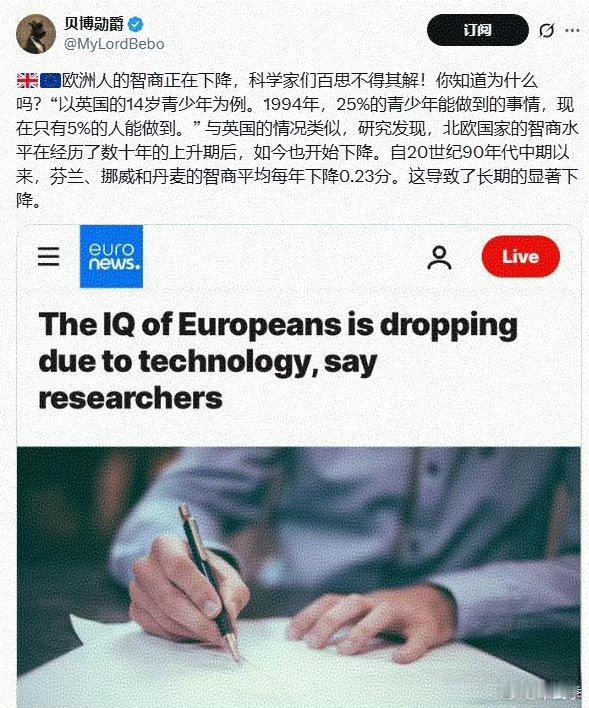 欧洲青少年从上世纪90年代起,长年显著下降。欧洲人会不会全部变智障?