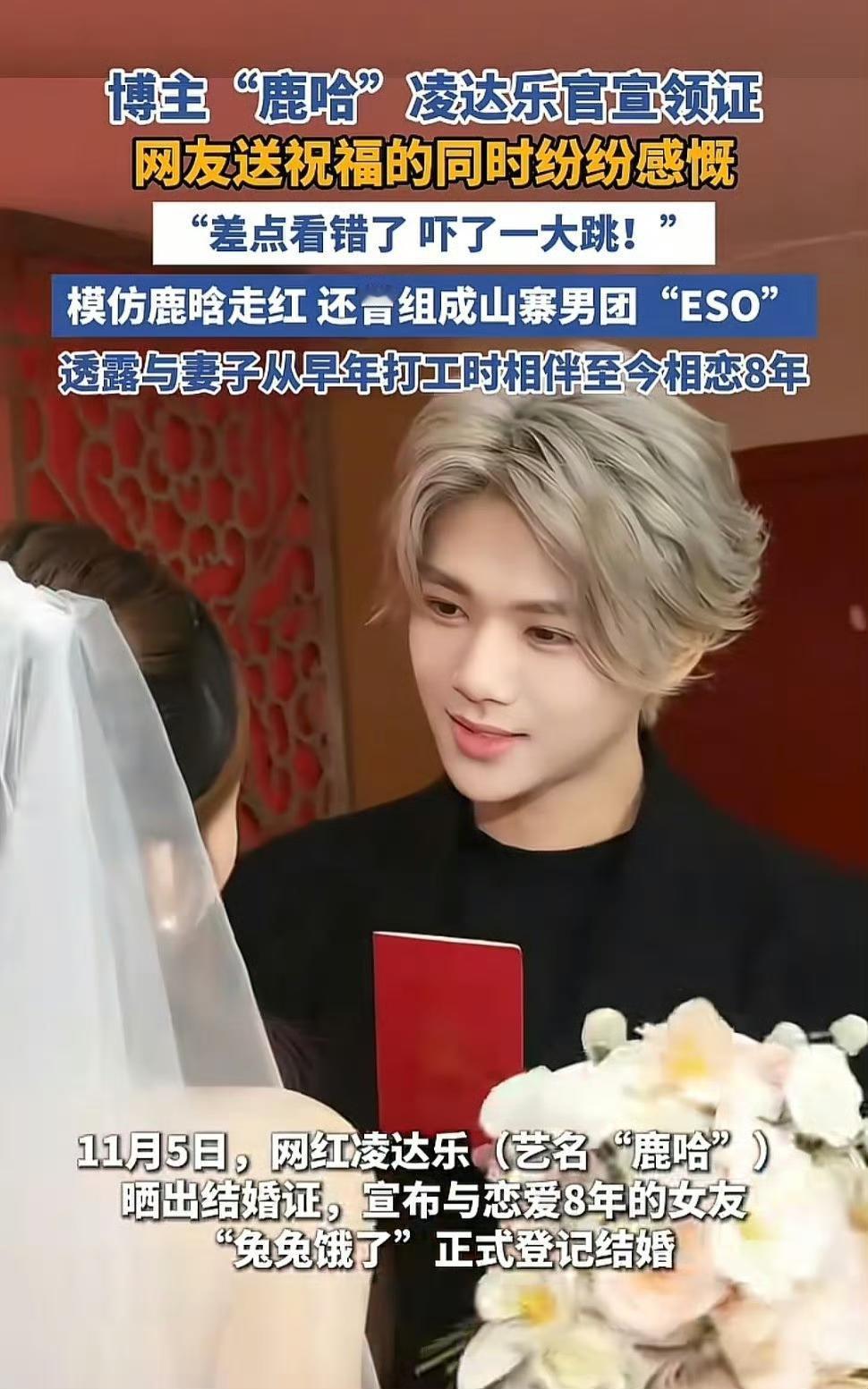 [捂脸][捂脸]我还以为是鹿晗呢!笑不活了!鹿哈领证竟把鹿晗送上热搜?刷到“鹿哈领证”热搜,我差点一口奶茶喷出来——第一反应:鹿晗终于和关晓彤官宣了?点进去仔细一看,好家伙,原来是“撞名界天花板”鹿哈持证上岗了!这波乌龙直接把网友整懵了😮 两年前还是电子厂打工仔,靠着模仿鹿晗走红后,没止步于“山寨标签”,直播7个月就狂赚3500万,硬生生从打工人熬成成功人士。更高情商的多次公开感谢鹿晗是“人生恩人”,还在鹿晗直播间豪刷礼物表心意。 这次和女友兔兔从校服走到婚纱,领证文案“不是一时兴起,是深思熟虑的一辈子”!网友一边送祝福,一边不忘催婚鹿晗关晓彤:“鹿哈都领证了,鹿哥你啥时候跟上?”毕竟这对相恋八年的情侣,每次断更生日祝福都让粉丝操碎了心。 鹿哈官宣领证 鹿晗关晓彤恋爱现状 网红逆袭名场面 来评论区聊聊,你有没有过把鹿哈认成鹿晗的乌龙时刻?你觉得鹿晗关晓彤啥时候会官宣好消息?