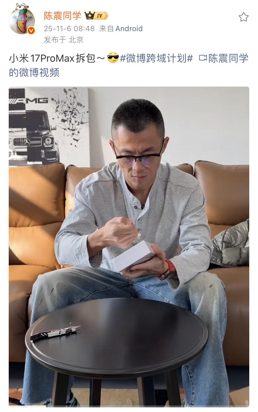 陈震:小米17ProMax拆包~[酷] 陈震和小米闹掰了,果然是谣言,这不又为小米的手机打广告吗? 陈震的拆箱视频特别的简单,就是把手机的包装盒一撕,然后把手机的包装扔到垃圾桶里面,这样收获的流量比很多博主精心的测评流量还要高。 各位是怎么看的?欢迎评论区留言。