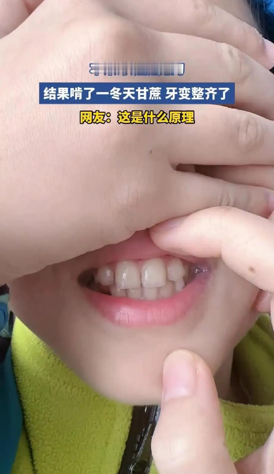 吃甘蔗是真的有用,刚看到一个宝妈说她家孩子牙齿不齐,牙缝太大,结果啃了一冬天的甘蔗,牙齿居然变齐整了,牙缝也消失了。 看完只想说终于有人发现了,我家俩娃最爱啃甘蔗,牙齿真是很整齐,尤其是换牙期的时候可以多啃点甘蔗,这样牙齿就能及时松动掉落。 现在好多孩子都长双排牙齿,恒牙都长出来了,乳牙还迟迟不掉,就是因为吃的太精细化了,牙齿没有咬过硬东西,所以多啃甘蔗,平时水果也不要切块,苹果,梨,桃子就让孩子啃着吃,可以很好的锻炼牙齿。 不过要注意的是,甘蔗很甜吃完记得漱口刷牙,预防蛀牙,还有孩子牙缝宽是好事,它是为了给新牙预留位置,恒牙长好了,就整齐了,牙缝太窄,很容易造成“拥堵现象”,恒牙反而容易长歪了。对此,大家有什么看法呢? 网友评论: 挤压原理,甘蔗硬,需要牙齿的咬合力才能咬动,牙齿受力后慢慢就会自行矫正。 过去的孩子也没用谁特别的去补钙,吃东西都是自己啃咬,所以牙齿问题不大。现在的孩子吃东西精细,啥都切成碎片怕噎着,所以牙齿功能丧失,反而长得不好看。 不一定非要甘蔗,苹果,梨子,只要是能啃的水果等其他硬的食物都可以。