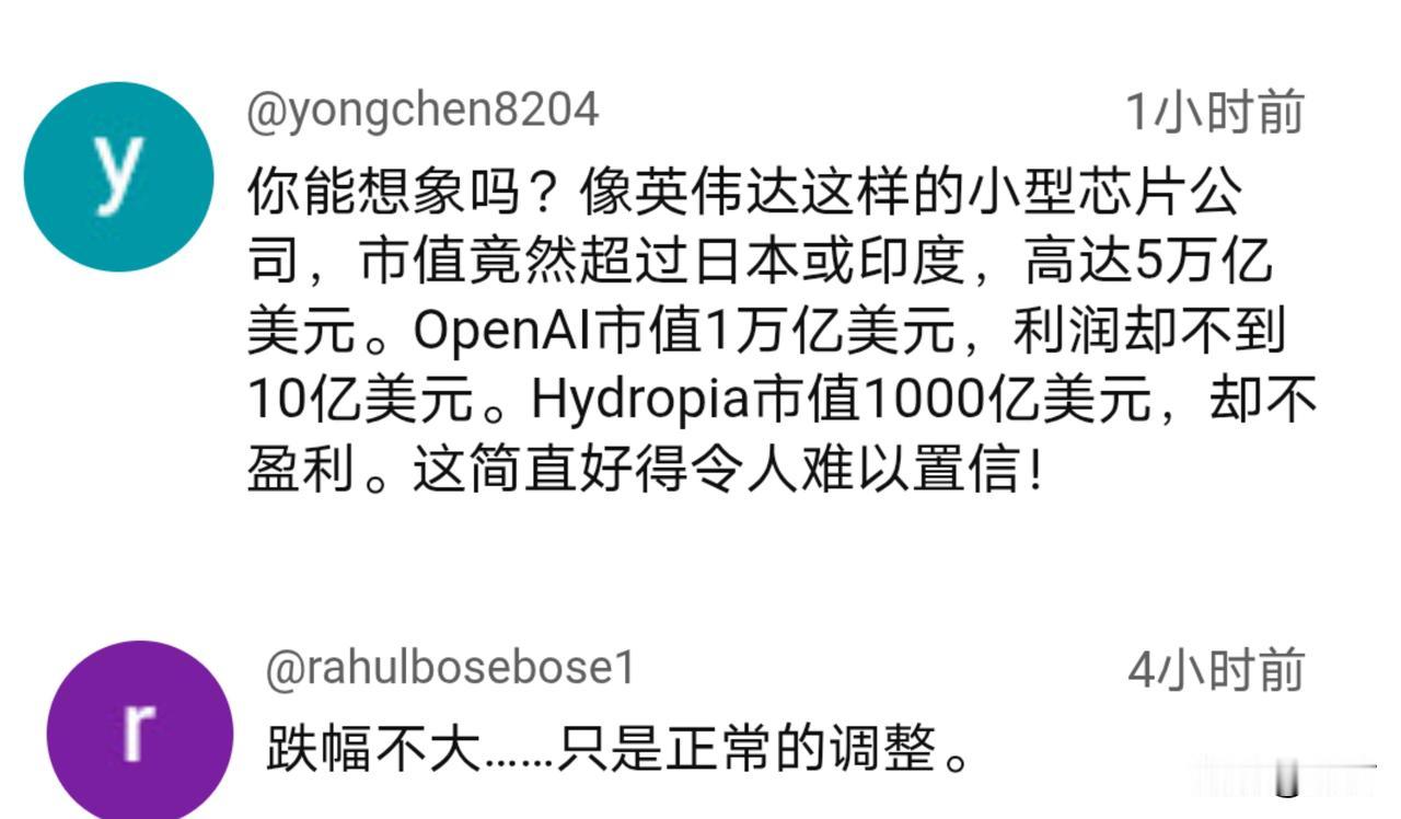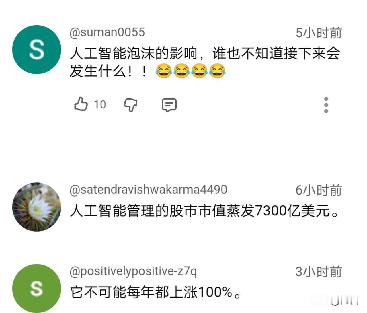 印媒:美科技股一夜之间蒸发了7300亿美元。 11月5日印媒在报道中表示,过去几个月大量投资者押注人工智能及相关产业,令股价一路飙升。但今日却迎来了大幅度的下跌,以英伟达为首的大型科技公司在短短一日内市值蒸发了7300亿美元。 当前,英伟达的市值达到了4.8万亿美元,超过了日本GDP的总和。印媒认为,除了英伟达在盈利外,其他公司几乎都在赔钱,人工智能热或就此降温。 消息传出后引发热议,印度网友的声音也是不一。 根据最新的消息,除了英伟达和与微软下跌1%外,其他大型科技股普涨,如谷歌涨超2%,英特尔3%等。印媒就此得出人工智能热降温的结论,恐怕还为时过早…