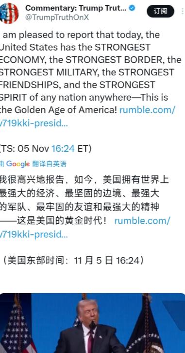 [微风]特朗普今天(北京时间11月6日)表示:“我很高兴地报告,如今,美国拥有世