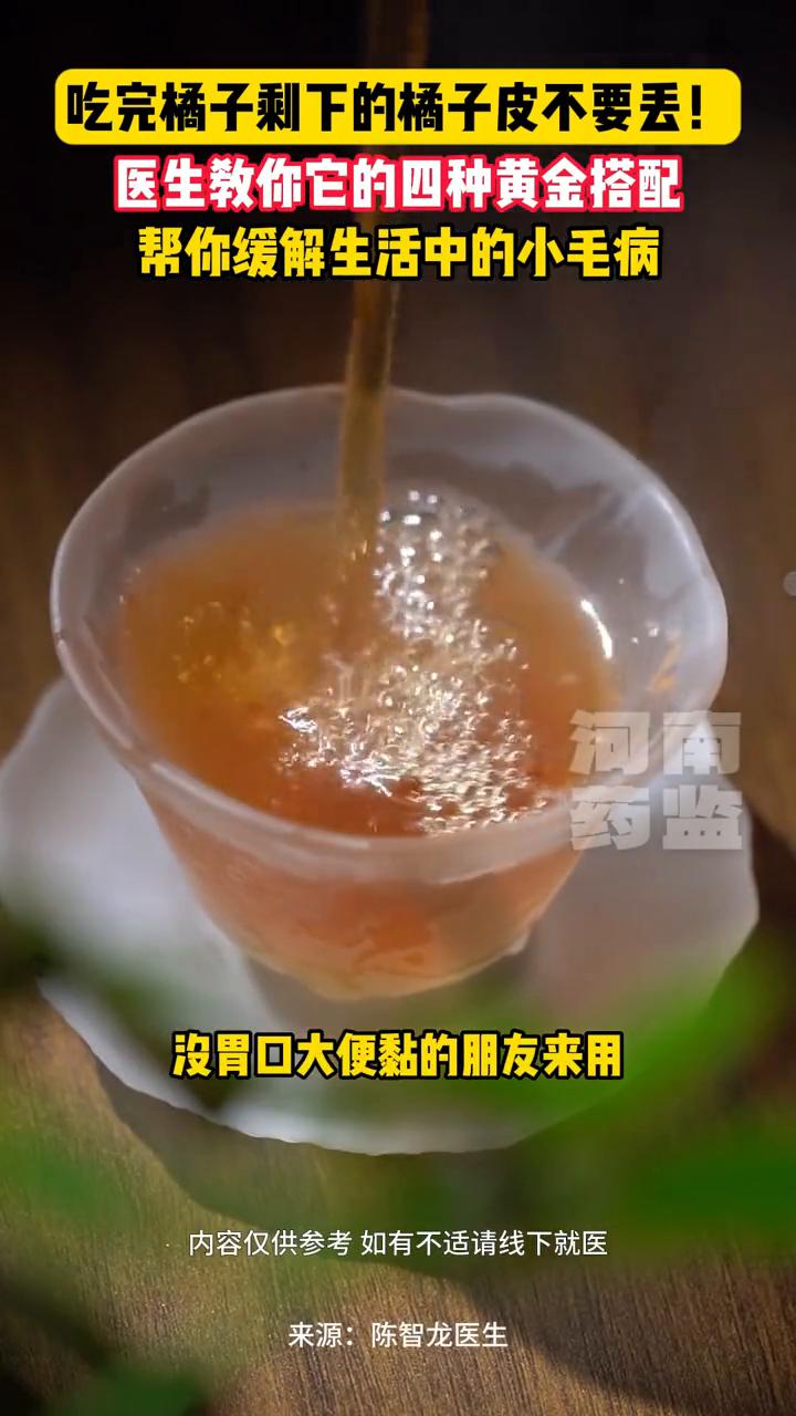 吃完橘子剩下的橘子皮不要丢,医生教你它的四种黄金搭配。 黄石市中医医院心病科陈智龙医生。 吃完橘子剩下的橘子皮不要丢,今天就教你它的四种黄金用法。 ·一、加红枣一起煮水喝,可以补中益气,适合气血不足、爱上火的朋友来用。 ·二、加山楂一起煮水喝,可以行气开胃、健脾消食,适合肚子胀、没胃口、大便黏的朋友来用。 ·三、加菊花一起煮水喝,可以清热解毒、清肝明目,适合眼红肿痛、口苦口干、脾气暴躁的朋友来用。 ·四、加生姜一起煮水喝,可以解表散寒、燥湿化痰,适合手脚冰凉、四肢乏力、平时会恶心呕吐的朋友来用。