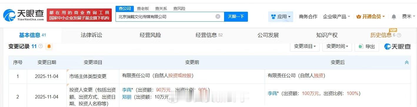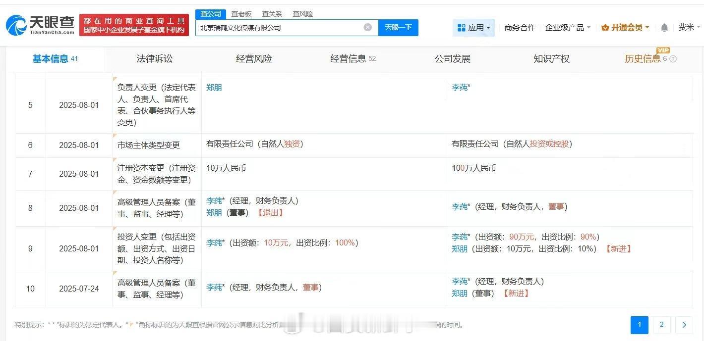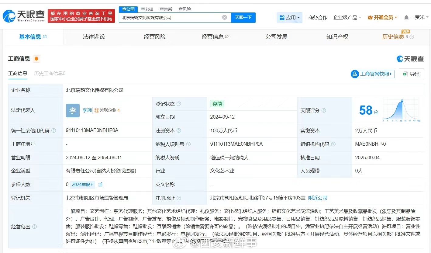 北京瑞鹤文化传媒有限公司成立于2024年9月,法定代表人为李莼,注册资本100万人民币,经营范围包括文艺创作、票务代理服务、其他文化艺术经纪代理等。股东信息显示,该公司现由李莼全资持股。变更记录显示,今年8月,该公司发生工商变更,郑朋(梓渝)卸任法定代表人、董事,由李莼接任,同时新增郑朋(梓渝)为股东,注册资本由10万人民币增至100万人民币。