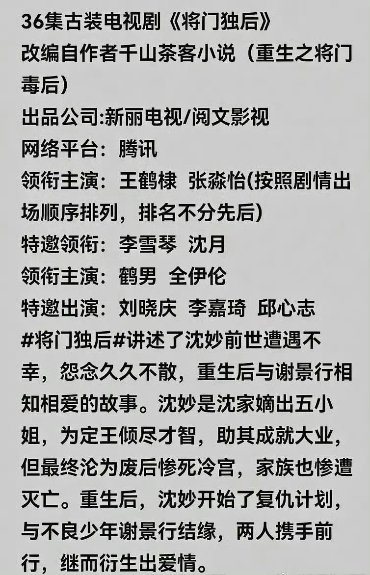 网传将门毒后女主张淼怡对接确认王鹤棣出演将门毒后