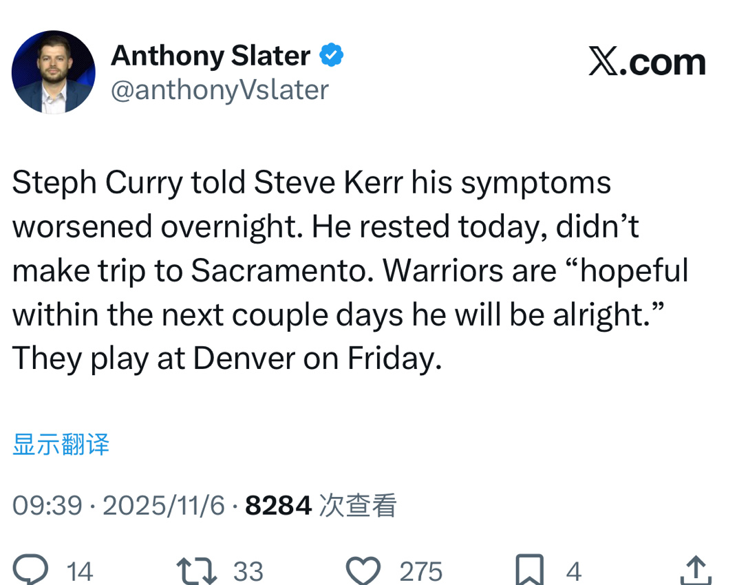 勇士“希望他能在未来几天内康复” 将于周六客场挑战掘金勇士vs国王