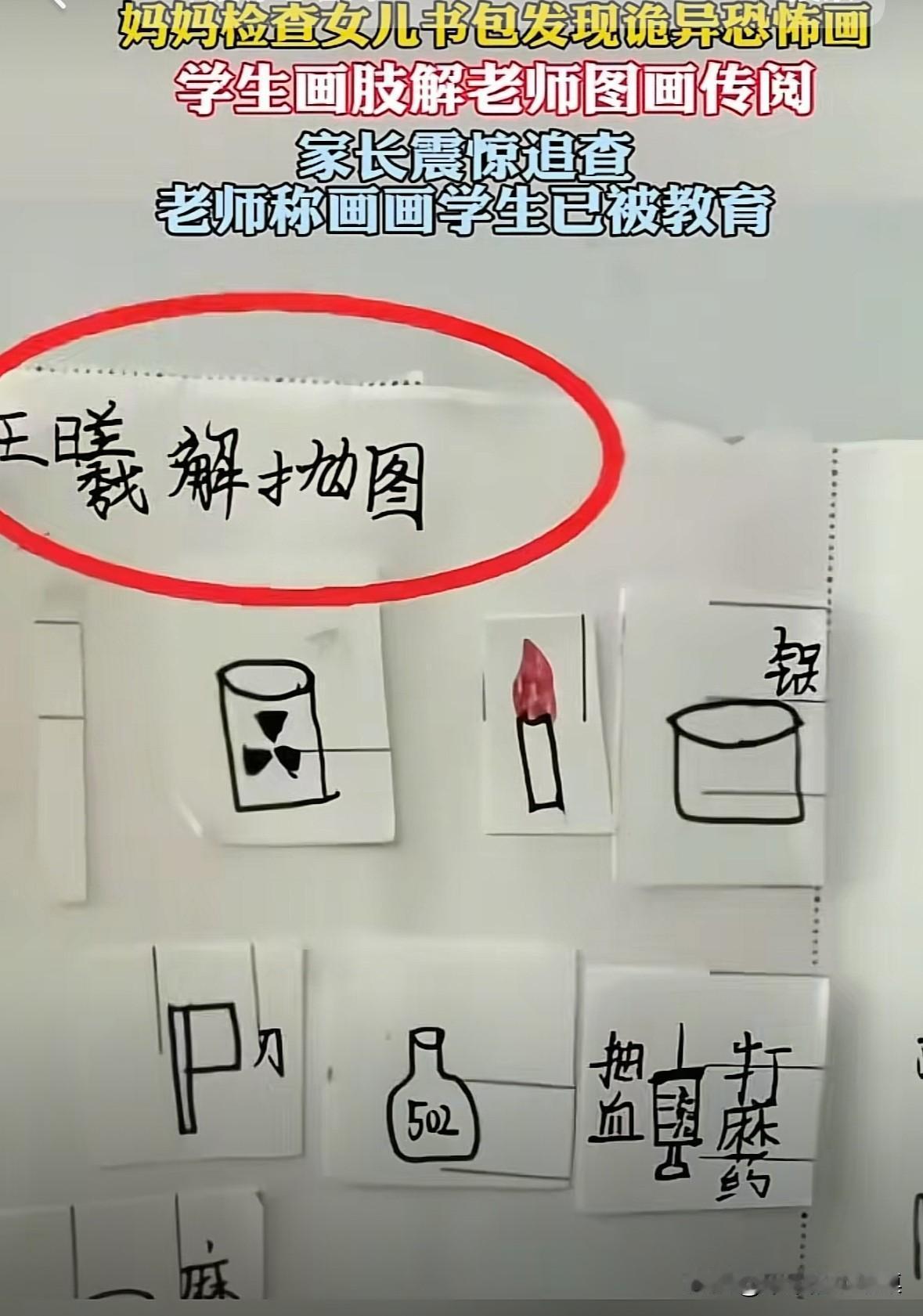 江苏南通一位妈妈在给女儿整理书包时,发现了一张解刨图,当场吓得头皮发麻。 上面详细画出和讲解了人体解刨步骤,而且上面画的是个女孩子! 妈妈问女儿:“这是不是你画的?” 女儿说:“不是,是同学给我的!” 妈妈联系了女儿说的同学妈妈,对方也一头雾水。 太恐怖了,我觉得报警处理吧,彻查看看班上有没有人失踪。 另外赶紧转学,现在有的小孩真的很坏,如果真的对你女儿恨之入骨,这些事情不是做不出来。画画