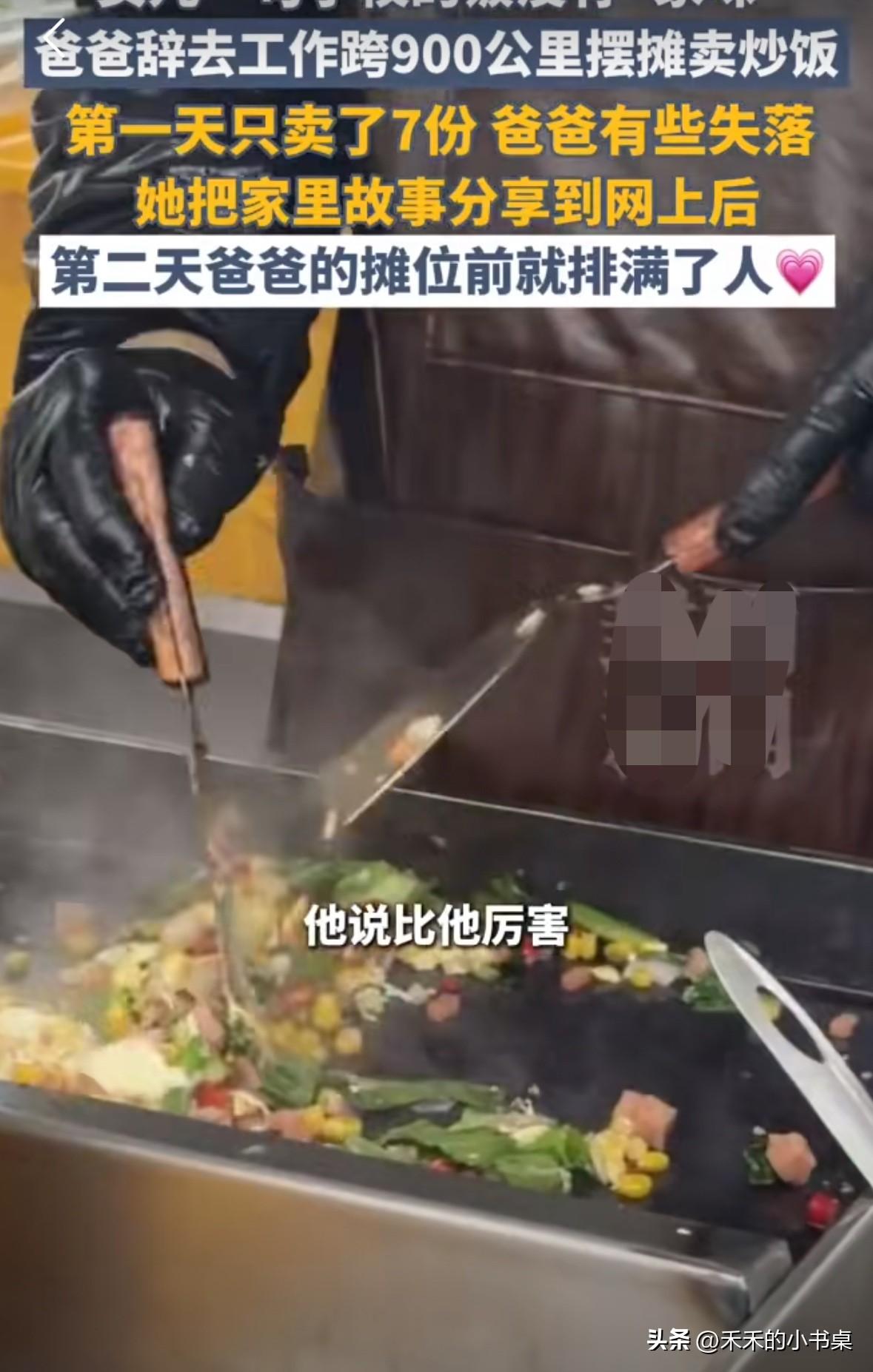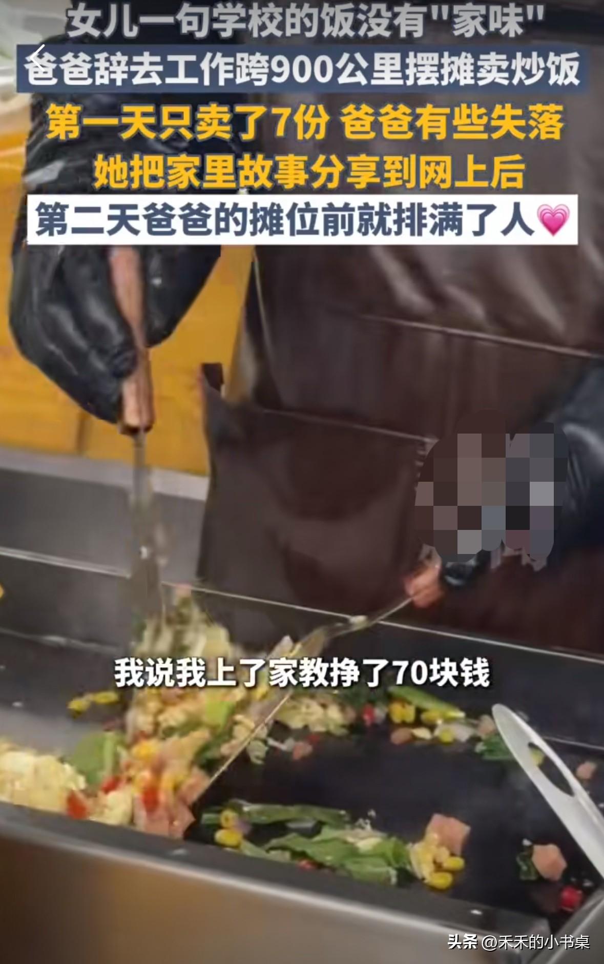女儿说大学里的饭没有“家味”,父亲立即辞去工作,跨900公里,在女儿的城市摆摊卖炒饭。 第一天出摊,父亲对女儿说:“我今天只卖出去七份。” 女儿说:“我今天干家教挣了70块钱。” 父亲说:“比我厉害,我一天都没挣上70块钱。” 然后女儿就在某平台上写了自己与父亲的经历,第二天父亲的摊位前排满了人! 父亲很开心的对女儿说:“今天卖出去了很多很多份。”女儿感动的哭了。 女儿说:他今天一天都没说冷,他的心是热的,他身上就不会觉得冷了! 教育在此刻形成了闭环,爸爸心疼女儿,女儿更爱爸爸,我相信你们的日子会越来越好,你的家庭也会越来越幸福!