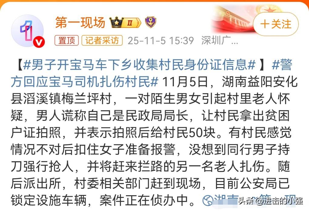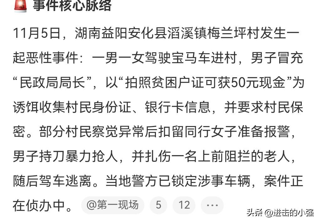 这真的是太恶劣了,竟然还敢拿刀伤人。 11月5日湖南益阳,一对陌生男女竟然收集村民的身份证信息。 说给50块钱,让他们别告诉别人。 老人察觉不对,要扣留这女子,没想到这男子竟然持刀伤人。 一定要抓住这对骗子,严惩这个行凶男,真是无法无天了。光天化日竟然还持刀伤人。 这男子冒称行政局局长,在这里招摇撞骗,好大的胆子。