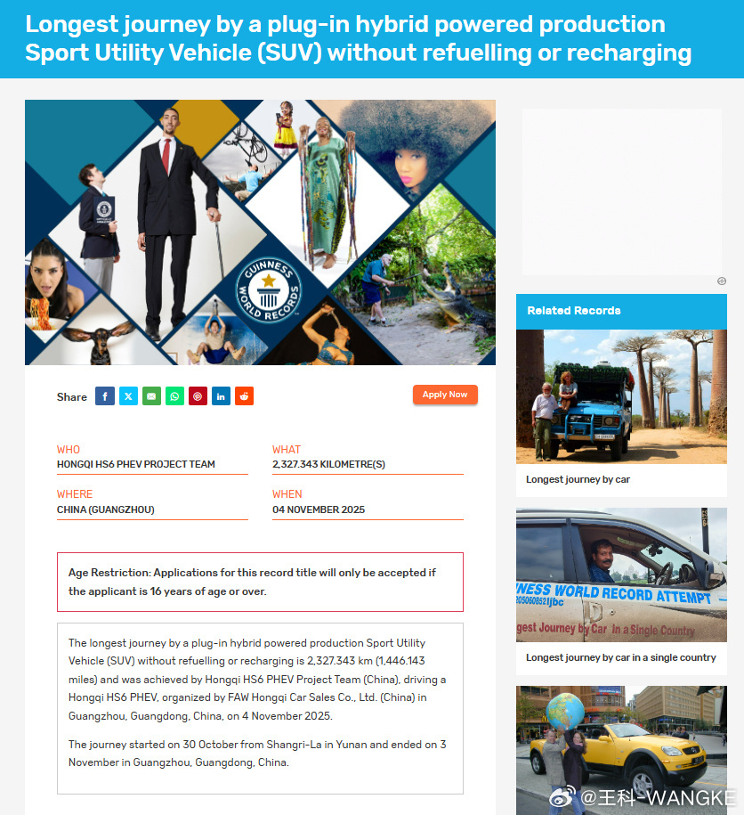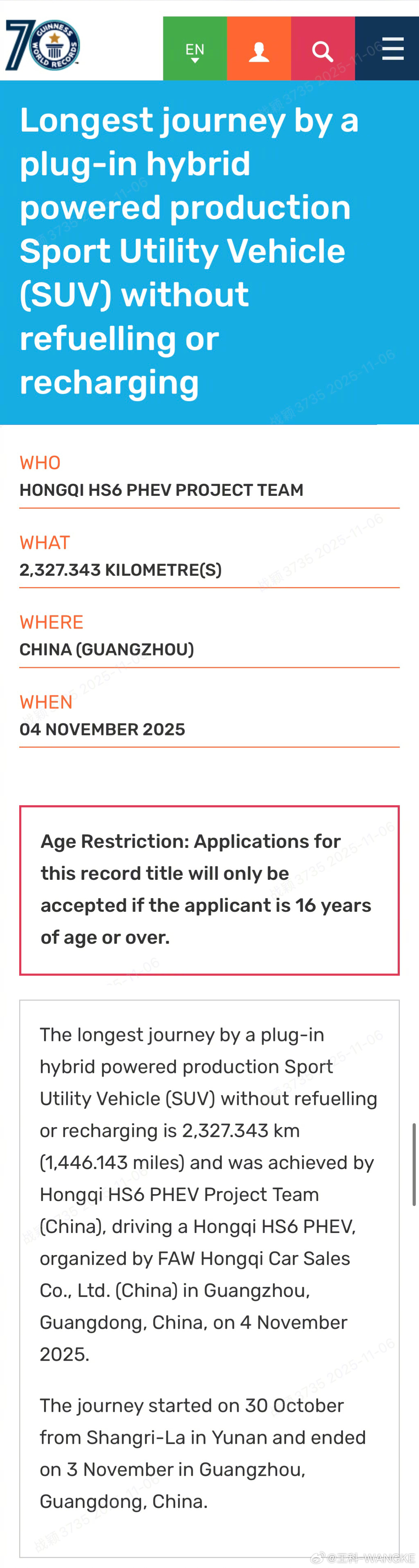 中国混动破世界纪录 红旗HS6 PHEV这次真的用实力说话了!直接拿下吉尼斯“驾驶插电混动SUV满油满电零补能行驶最远距离”纪录,一口气跑了2327.343公里,从香格里拉干到广州,全程不加油不充电,这续航实打实地硬核。说实话,很多电动车标称续航动不动打折扣,但红旗HS6 PHEV直接玩了一波“反向虚标”——官方综合续航标1650公里,结果实测飙到2300多公里,这波操作属实良心。