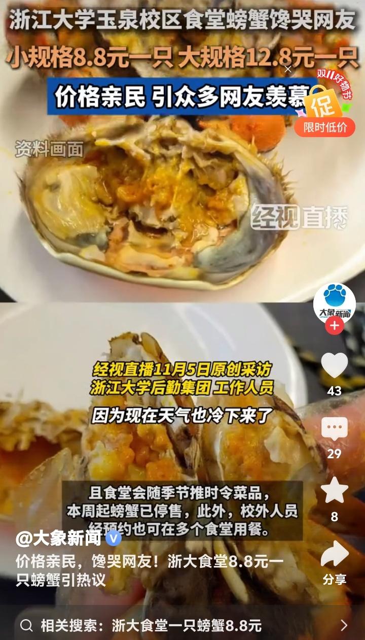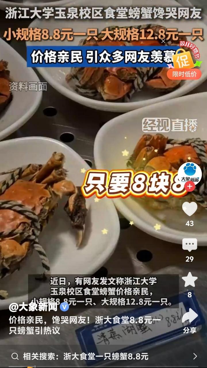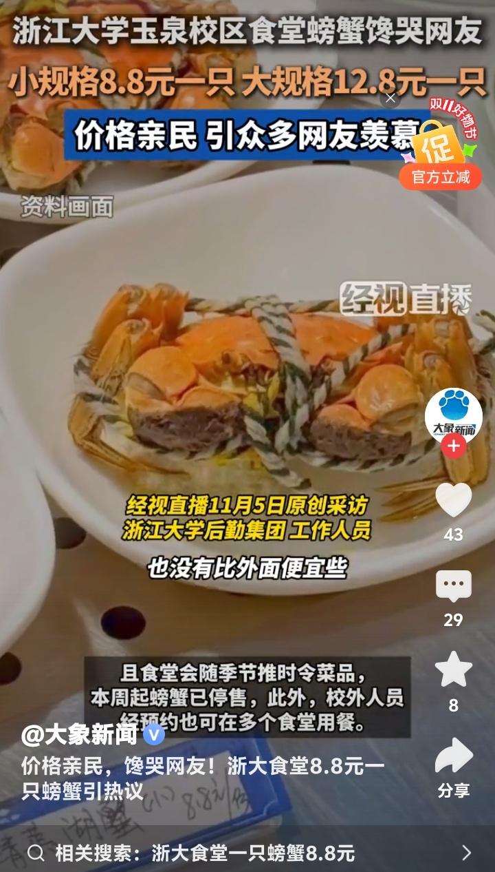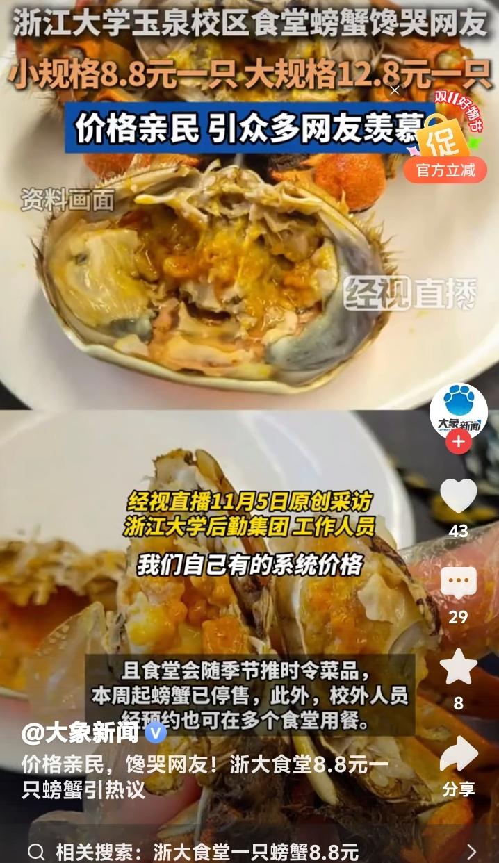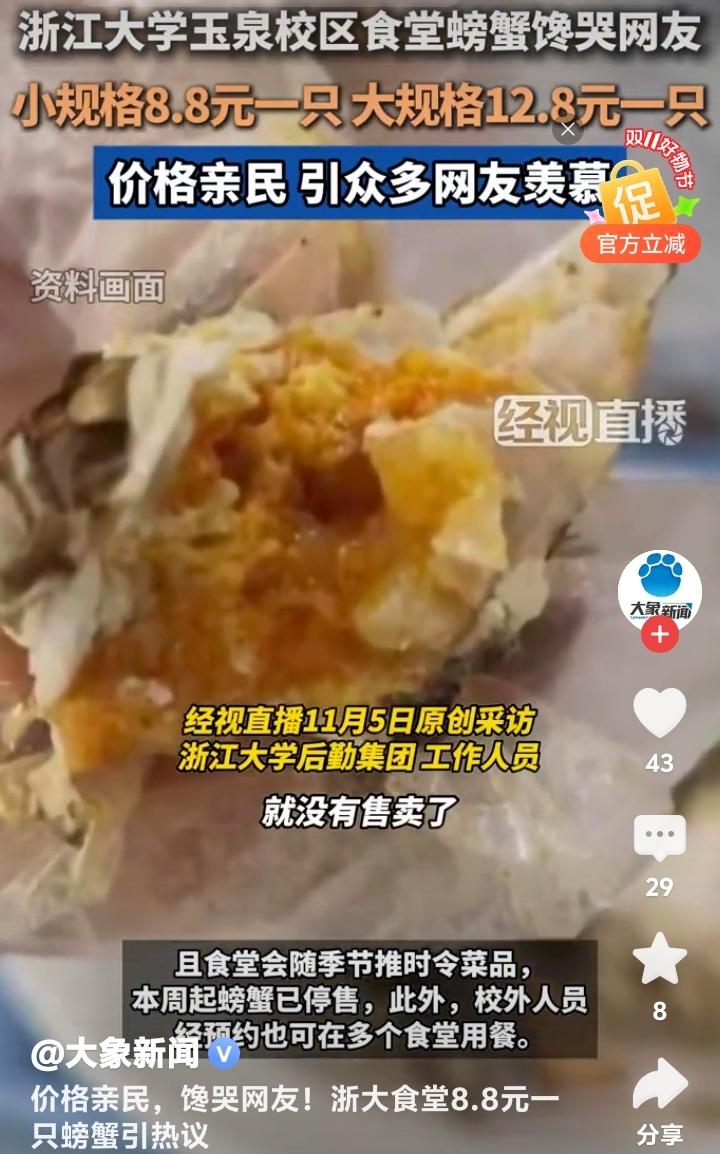 杭州浙大玉泉校区食堂惊现8.8元黄金蟹!学生党狂喜晒餐盘,网友哭诉:现在退学还来得及吗? 当秋风卷起银杏叶铺满杭州曙光路,浙江大学玉泉校区的食堂窗口前正上演着让全网瞠目结舌的场景。不锈钢餐盘里躺着膏黄肥美的螃蟹,小只仅需8.8元,大只不过12.8元,这组数字像投入湖面的石子,在社交平台漾开层层酸涩的涟漪。 无数打工人攥着手机发出灵魂拷问:在商圈餐厅标价288元的清蒸大闸蟹,为何在顶尖学府的食堂竟比一杯奶茶还便宜?有网友晒出食堂小票调侃:“这价格连蟹腿上的绒毛都买不到!”更有人翻出菜场价目表作对比,发现同等规格的螃蟹市场价早已突破40元大关。 透过食堂玻璃窗氤氲的水蒸气,能看见学子们从容夹起橙红蟹壳的日常。这份从容背后,藏着高校后勤体系的温情逻辑。后勤工作人员轻描淡写的一句“主要服务学生”,恰似冬日暖阳照进现实。原来真正的人文关怀,从来不需要华丽辞藻装点。 当都市白领对着外卖软件里动辄百元的蟹宴套餐犹豫不决时,浙大学子正用校园卡轻松解锁秋日限定美味。这种反差精准刺中了当代年轻人的生存焦虑——我们拼命奔跑追求的体面生活,是否早已在象牙塔里触手可及? 有毕业生在评论区写下长文:“十年前总抱怨食堂饭菜,离校后才懂那份8元红烧肉的分量。”这条获赞过万的留言,像钥匙打开了集体记忆的闸门。那些年错过的不仅是便宜螃蟹,更是被温柔托底的青春时光。 更令人动容的是,这场螃蟹狂欢中不见哄抢与囤积。随着气温骤降,食堂如期撤下时令菜品,如同自然更替般从容。这种克制的温柔,恰是高校后勤最动人的浪漫——不追求爆款流量,只守护四季三餐。 或许我们羡慕的从来不是螃蟹本身,而是那个愿意为年轻人兜底的世界。当知识圣殿连味蕾都悉心呵护,当社会还在为“第一学历”争论不休,浙大食堂早已用8.8元完成了最生动的育人课:所谓名校风骨,是让每个追逐星光的人都能吃饱肚子。 此刻翻涌的网络情绪,何尝不是对纯粹美好的集体致敬?那些喊着要重新高考的玩笑里,藏着对精神家园最深的眷恋。毕竟能让人永远怀念的,从来不是某道菜的价格,而是那年端着餐盘时,整个宇宙都在为我们让路的笃定。 (来源:经视直播原创采访、浙江大学后勤集团回应、大象新闻综合报道)