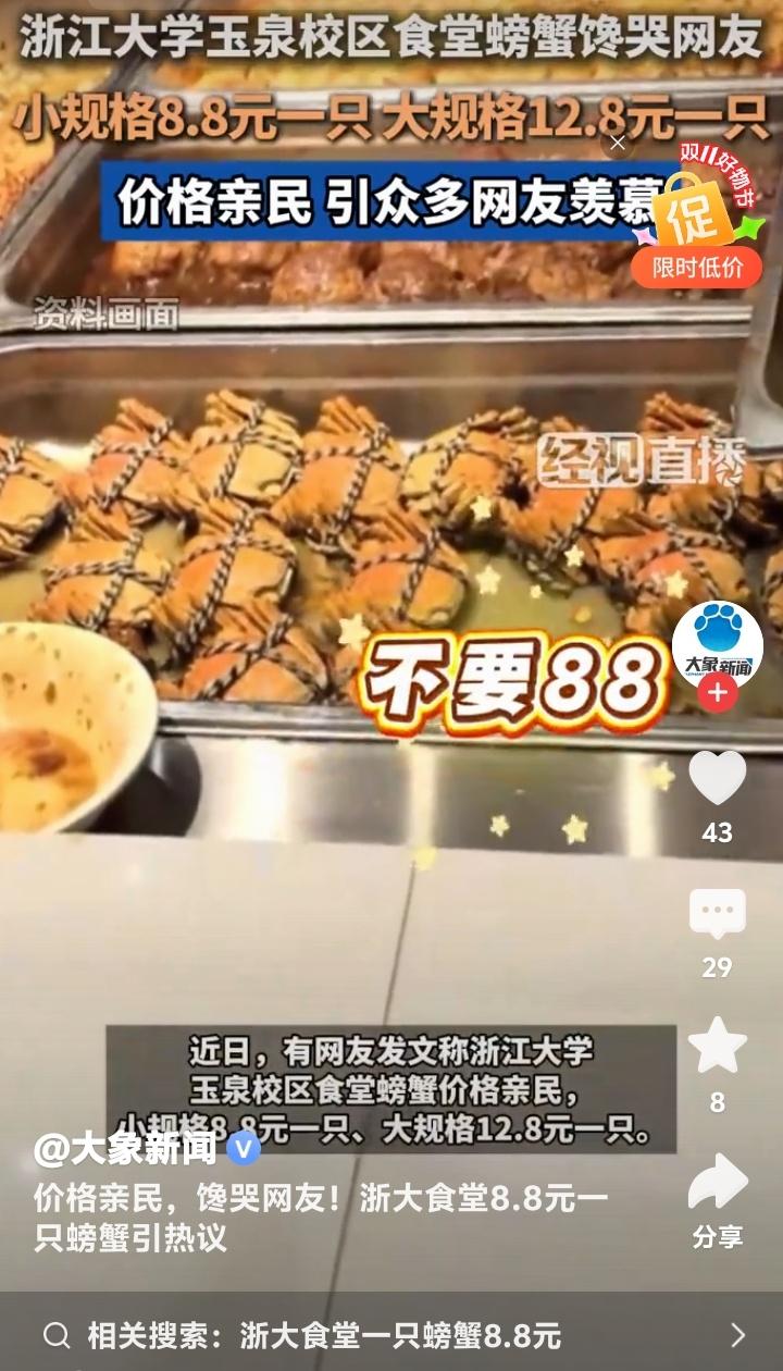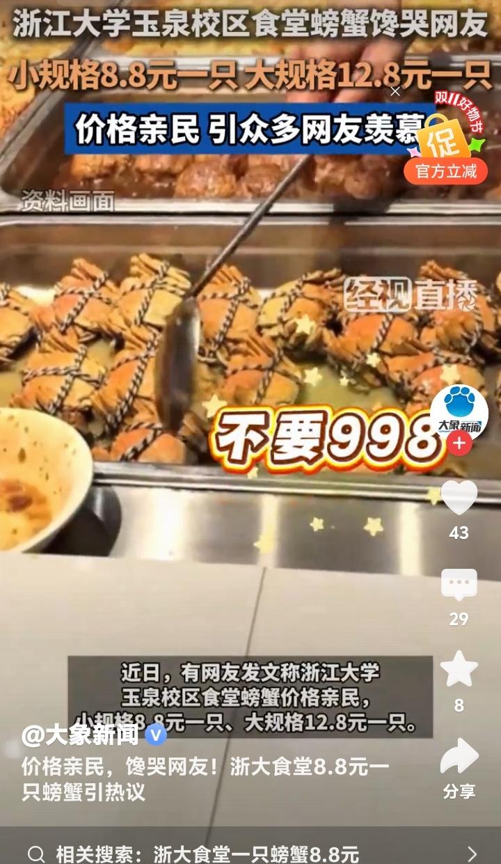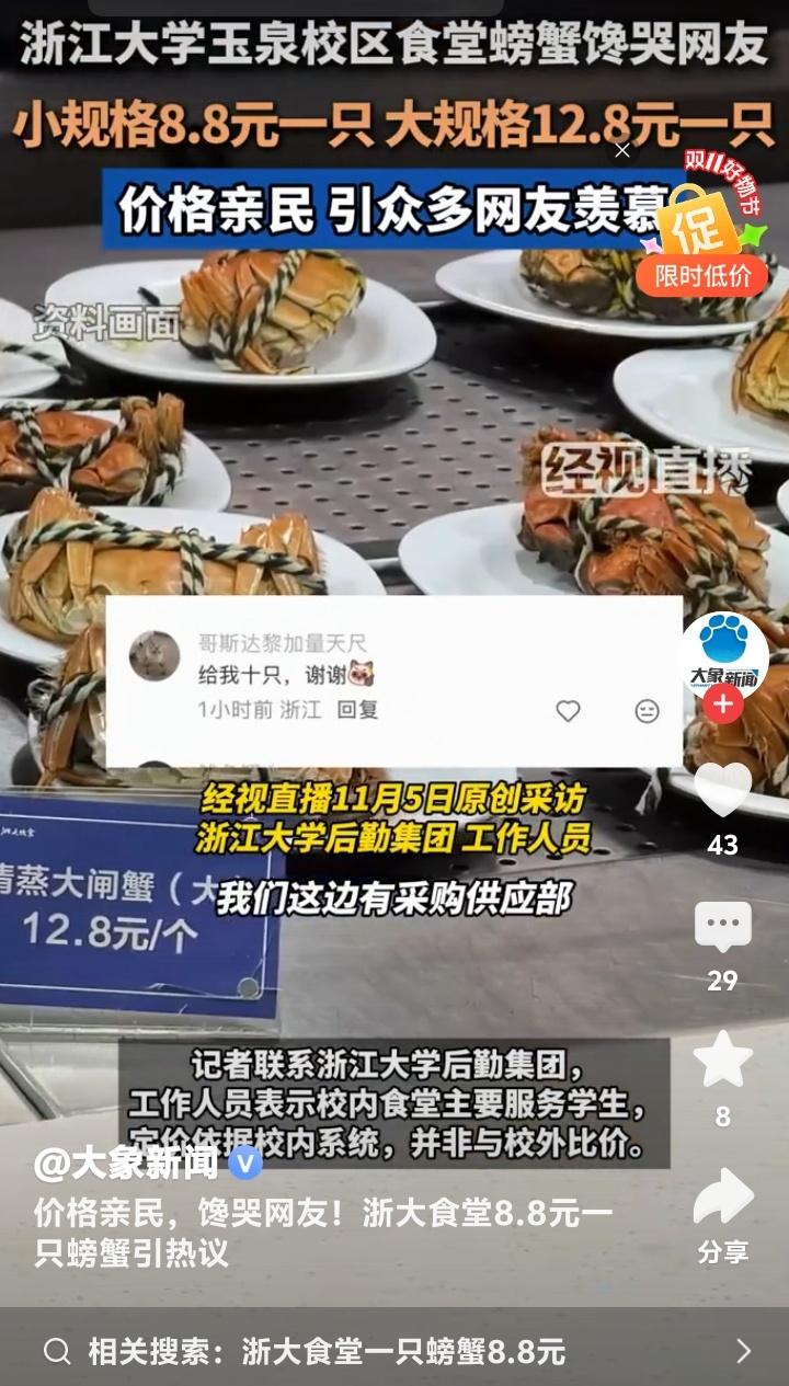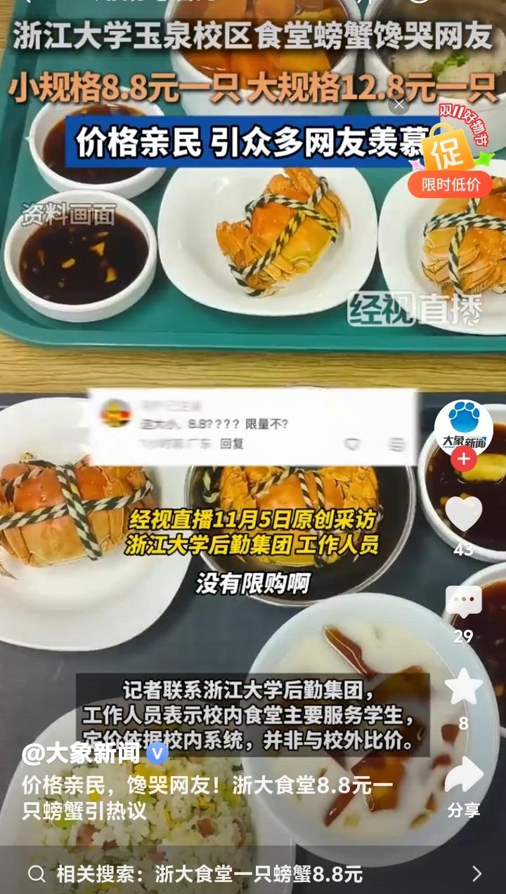 杭州浙大玉泉校区食堂惊现8.8元黄金蟹!学生党狂喜晒餐盘,网友哭诉:现在退学还来得及吗? 当秋风卷起银杏叶铺满杭州曙光路,浙江大学玉泉校区的食堂窗口前正上演着让全网瞠目结舌的场景。不锈钢餐盘里躺着膏黄肥美的螃蟹,小只仅需8.8元,大只不过12.8元,这组数字像投入湖面的石子,在社交平台漾开层层酸涩的涟漪。 无数打工人攥着手机发出灵魂拷问:在商圈餐厅标价288元的清蒸大闸蟹,为何在顶尖学府的食堂竟比一杯奶茶还便宜?有网友晒出食堂小票调侃:“这价格连蟹腿上的绒毛都买不到!”更有人翻出菜场价目表作对比,发现同等规格的螃蟹市场价早已突破40元大关。 透过食堂玻璃窗氤氲的水蒸气,能看见学子们从容夹起橙红蟹壳的日常。这份从容背后,藏着高校后勤体系的温情逻辑。后勤工作人员轻描淡写的一句“主要服务学生”,恰似冬日暖阳照进现实。原来真正的人文关怀,从来不需要华丽辞藻装点。 当都市白领对着外卖软件里动辄百元的蟹宴套餐犹豫不决时,浙大学子正用校园卡轻松解锁秋日限定美味。这种反差精准刺中了当代年轻人的生存焦虑——我们拼命奔跑追求的体面生活,是否早已在象牙塔里触手可及? 有毕业生在评论区写下长文:“十年前总抱怨食堂饭菜,离校后才懂那份8元红烧肉的分量。”这条获赞过万的留言,像钥匙打开了集体记忆的闸门。那些年错过的不仅是便宜螃蟹,更是被温柔托底的青春时光。 更令人动容的是,这场螃蟹狂欢中不见哄抢与囤积。随着气温骤降,食堂如期撤下时令菜品,如同自然更替般从容。这种克制的温柔,恰是高校后勤最动人的浪漫——不追求爆款流量,只守护四季三餐。 或许我们羡慕的从来不是螃蟹本身,而是那个愿意为年轻人兜底的世界。当知识圣殿连味蕾都悉心呵护,当社会还在为“第一学历”争论不休,浙大食堂早已用8.8元完成了最生动的育人课:所谓名校风骨,是让每个追逐星光的人都能吃饱肚子。 此刻翻涌的网络情绪,何尝不是对纯粹美好的集体致敬?那些喊着要重新高考的玩笑里,藏着对精神家园最深的眷恋。毕竟能让人永远怀念的,从来不是某道菜的价格,而是那年端着餐盘时,整个宇宙都在为我们让路的笃定。 (来源:经视直播原创采访、浙江大学后勤集团回应、大象新闻综合报道)
