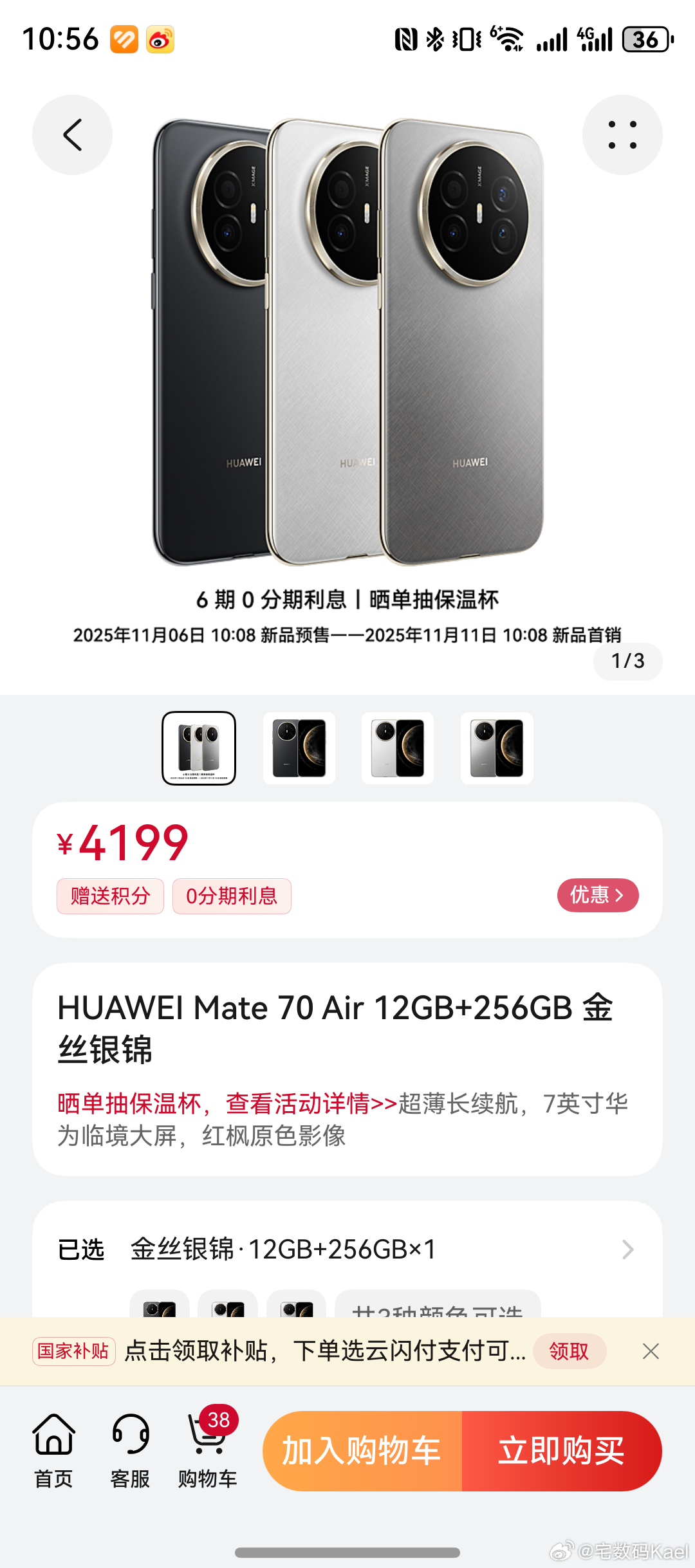 华为Mate 70 Air,直接上架官方商城了,4199元起。