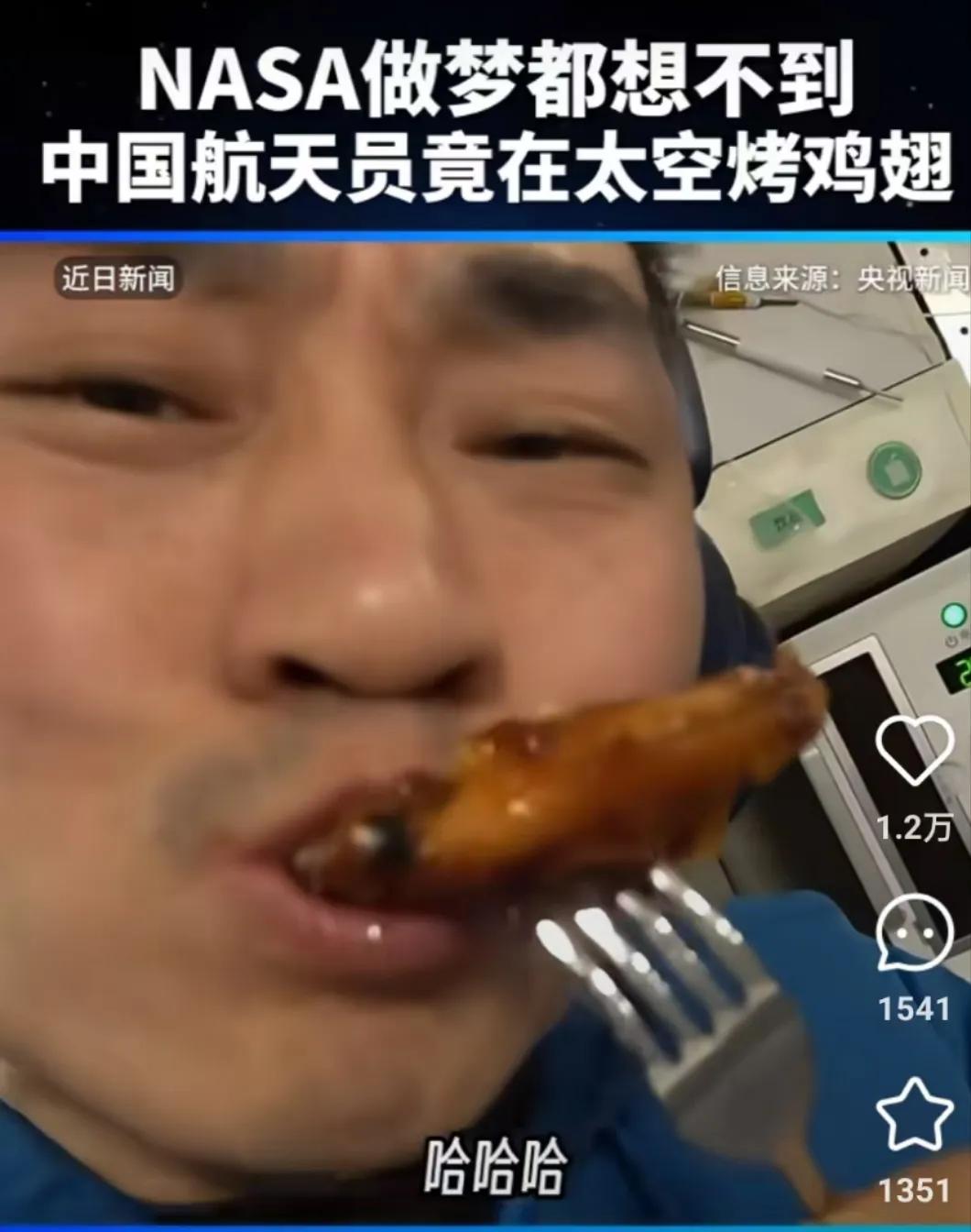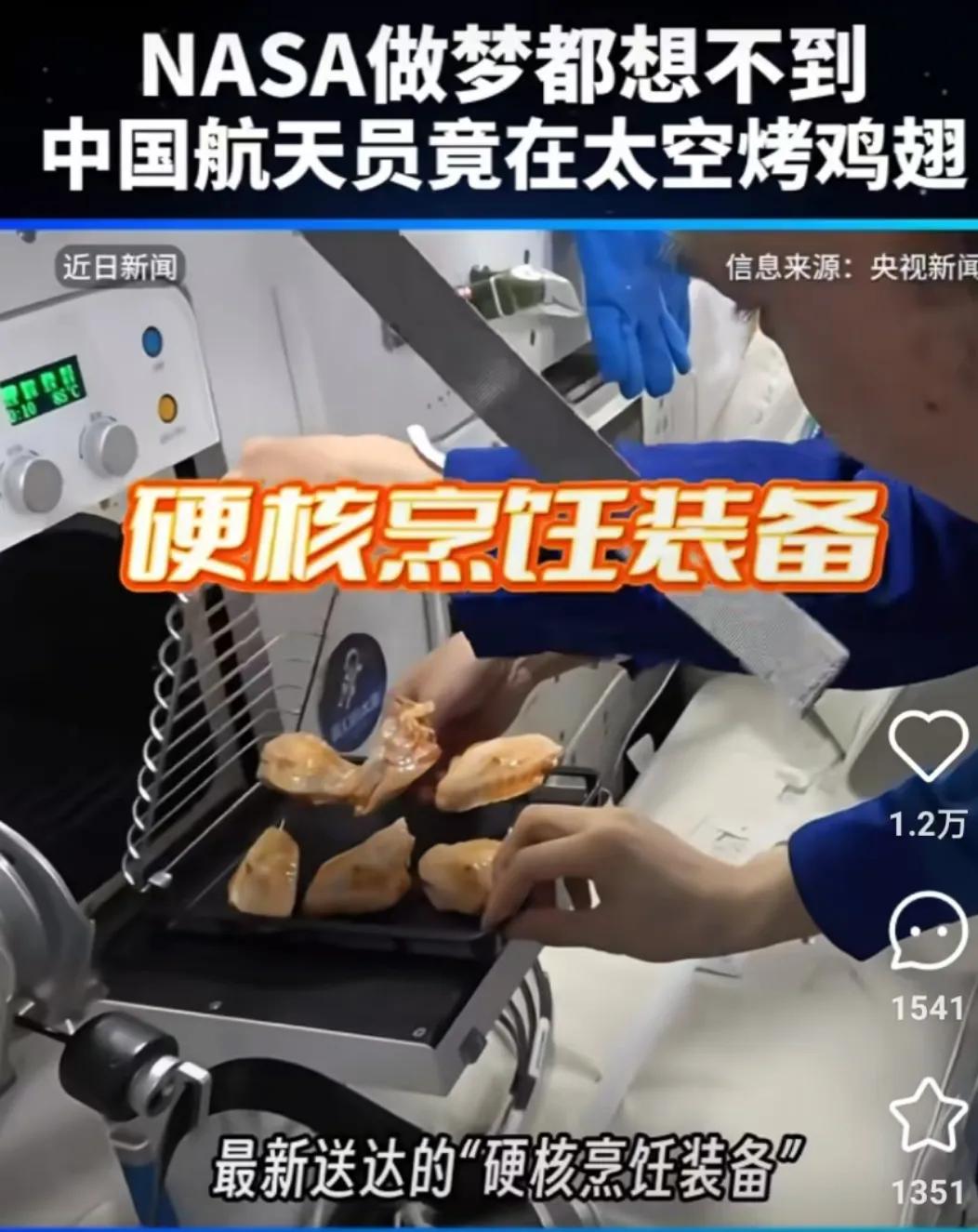 外国网友啊外国网友, 我奉劝你一句, 别光盯着打赌的事儿看。 10月31日神舟二十一号发射成功,航天员进了空间站,这次他们可不一样,头回用上热风烘烤机,在太空家园里吃到了烤鸡翅烤牛排,日子过得有滋有味。 你们有人惊叹不敢信,有人好奇打赌带火锅,可看看美国航天员还在吃冻干面条,咱中国航天就是能把太空生活越整越像样。 这样的中国航天,能不让人跟着骄傲吗? 他们真的做到了!美国人还在空3间站吃冻干面条】外国网友打赌中国会带火锅上太空 10月31日晚发射的神舟二十一号载人飞船为中国空间站送去一台热风烘烤机。 航天员们首次在“太空家园”中,品尝到了烤鸡翅、烤牛排等美味佳肴。 这一幕引发外国网友的广泛讨论,有人惊叹不敢信,有人好奇打赌中国航天会研究带火锅上太空,还有网友对比称美国人仍在空间站吃冻干面条。老外热议中国