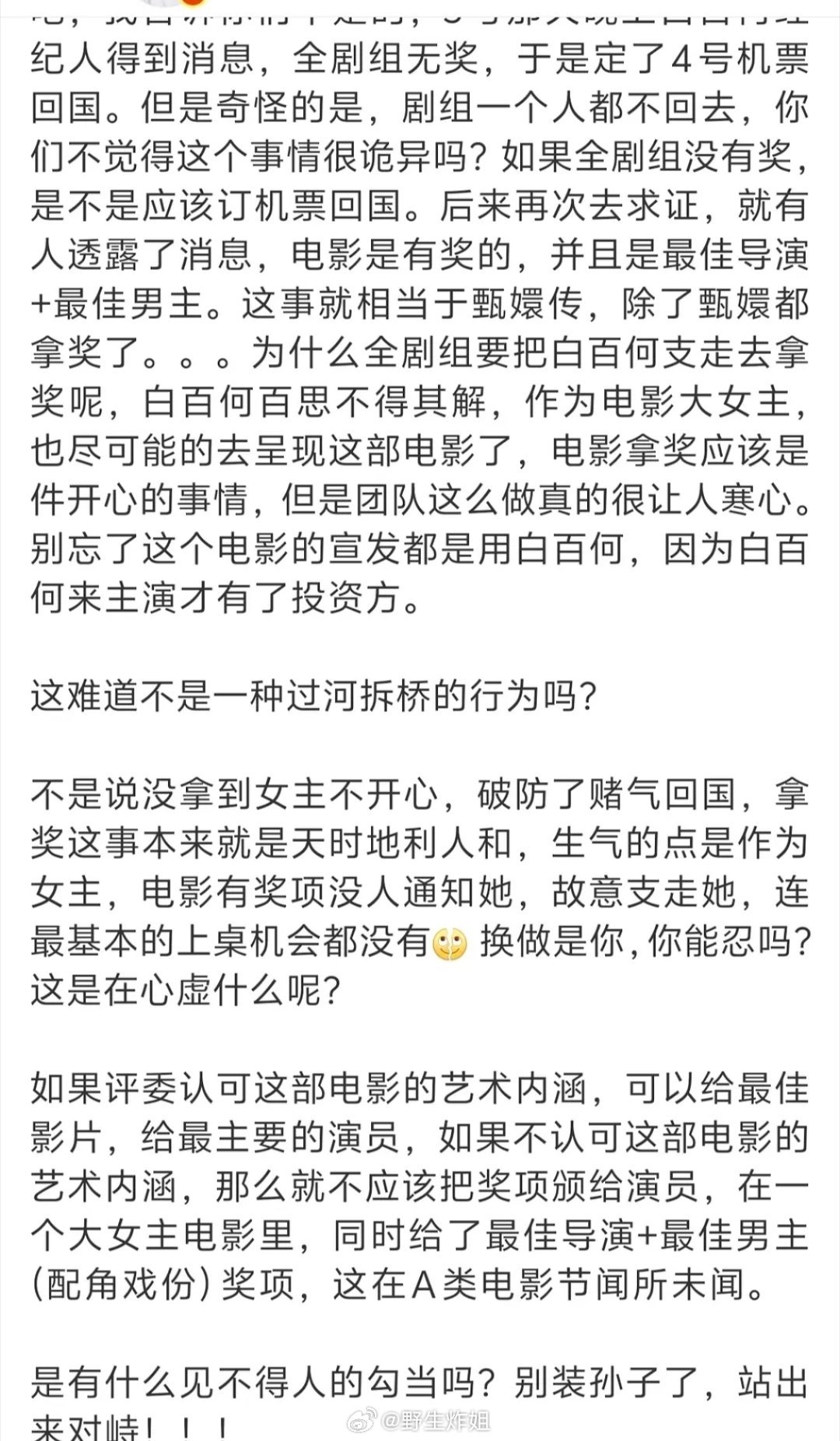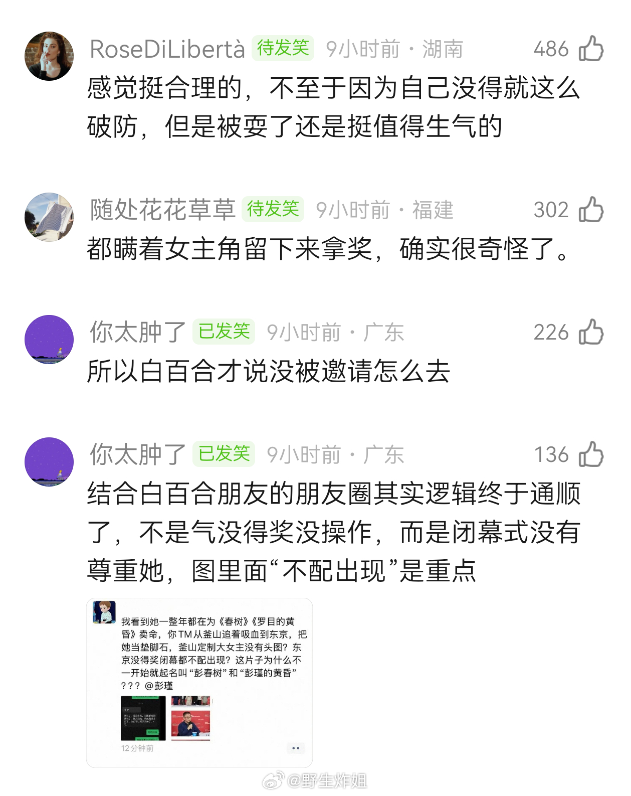 结合白百合朋友的朋友圈其实逻辑终于通顺了,不是气没得奖没操作,而是闭幕式没有尊重她,图里面“不配出现”是重点