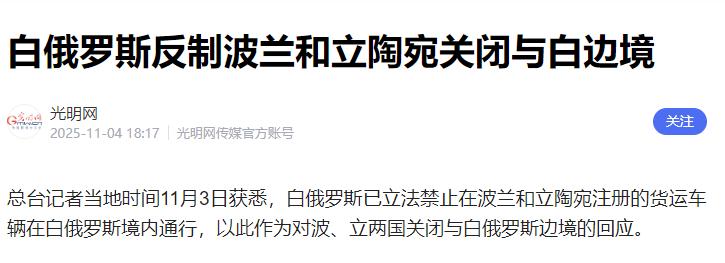 白俄罗斯出手反击了! 11月3日,白俄罗斯已立法禁止波兰、立陶宛注册的货运车辆入境,这波操作直接瞄准两国此前关闭边境的行为,妥妥的对等回应。 这反击绝不是临时起意,波兰和立陶宛早把边境当成了搞政治的筹码,立陶宛10月29日先动的手,拿“走私烟草的气象气球入境”当理由,关了仅剩的梅季尼奈伊和萨尔奇宁凯两处边境口岸。 其中萨尔奇宁凯口岸直接彻底关停,另一处只许特定人员通行,这理由说出来都让人忍俊不禁——用汽车大小的气球运走私香烟,倒不如说这是场精心编排的政治道具秀。 更有意思的是,白俄罗斯外交部早在10月27日就召见了立陶宛临时代办提抗议,显然早看穿了这套路,可对方压根没当回事,铁了心要把边境当成施压工具。 立陶宛刚封关,波兰也赶紧跟上表忠心,10月30日宣布把原定11月初开放的波德拉谢省边境口岸推迟到中旬,理由竟是“支持立陶宛”,合着两国边境管控不是看实际需求,而是看政治站队够不够积极。 这波操作早有前科,2023年波兰就全面禁止白俄卡车入境,连拖车都不放过,当时直接让欧盟东部物流瘫痪,单月损失好几亿欧元,现在算是故技重施玩得越来越溜,今年9月更过分,波兰一句国家安全就封了边境,300多列中欧班列全被堵在路上,牵涉的贸易额高达250亿欧元,合着商家的损失在他们眼里不值一提。 所以看,白俄罗斯这次的回应算是“对等”了,10月31日卢卡申科直接签了法令,11月3日就正式立法禁止波立货运车辆入境,而且一禁就到2027年底,压根没给对方留试探的余地。 细看禁令细则更有意思,欧盟其他国家的货车还能限定路线装卸货后原路返回,波立的车却被死死卡住——波兰车只能用指定边境口岸,立陶宛车更是被精准限制在两国边境范围内,连跨境客运都跟着受影响,这分明就是在精准敲打“带头挑事的”。 要知道,波立两国靠过境运输吃饭的司机数以万计,之前欧盟禁白俄卡车时,他们就已经丢了线路、车都闲在车库里,现在算是尝到自己种下的苦果了。 说到底,这场边境风波就是场没必要的内耗,波立拿“气球走私”当借口,本质是想靠反俄白刷存在感、抱欧盟大腿,却忘了自己的经济命脉还攥在跨境运输上;白俄罗斯的反击看着强硬,实则是被逼到份上的自保,毕竟谁也不想让边境变成别人随意摆弄的政治玩具。 可最终为这场博弈买单的,却是那些靠跑运输养家的司机、盼着货物通关的商户,还有不得不接受涨价的普通消费者,只能说欧盟要是真为“东部安全”着想,倒不如先理顺内部分歧,别让成员国拿着边境当政治筹码瞎折腾,否则这样的“反击-反制”只会没完没了,最后把整个欧洲的物流根基都拖垮,到时候就得不偿失了。