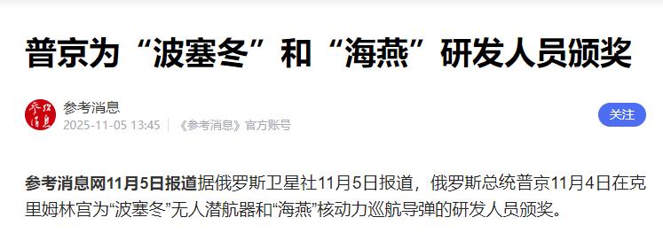 俄罗斯总统普京11月5日宣布:他为“海燕”核动力巡航导弹和“波塞冬”无人潜航器的研发团队授予勋章,并称赞这两款武器是能够确保俄罗斯未来数十年乃至整个21世纪安全与战略平衡的“王牌”。 这授勋仪式,表面看是给“海燕”和“波塞冬”研发团队发奖章,实则是对着全球地缘棋盘下的一步狠棋。 这绝非简单的科研表彰,毕竟三天前刚官宣“波塞冬”试射成功,十天前确认“海燕”完成1.4万公里试飞,如今趁热授勋,每一个时间点都卡得精准。 先看这两款被称作“王牌”的家伙到底有多硬,“海燕”核动力巡航导弹最绝的是那几秒钟就能启动的超小型核反应堆,格拉西莫夫汇报的1.4万公里试飞还没到性能上限,意味着它能绕着地球飞半圈再砸向目标,美国花大价钱搞的“金穹”反导系统根本拦不住。 更狠的是“波塞冬”无人潜航器,1000米下潜深度、每小时115英里的速度,比所有现役水面舰艇都快,美国海军的声呐系统得凑到几公里内才能勉强探测,风暴天更是形同虚设,普京直言它威力远超“萨尔马特”洲际导弹,200万吨当量的核弹头是广岛原子弹的100多倍,别说摧毁航母战斗群,制造放射性海啸让沿海城市报废都不在话下。 而俄罗斯选择这时候亮肌肉,明摆着是冲北约来的,三十年东扩把战线拉到俄罗斯家门口,2025年北约还在荷兰搞大规模核演习,美国又在构筑反导体系,普京这是用硬家伙回话:你们的封锁没用。 有意思的是,美国《外交事务》刚披露政府在讨论取消北约扩张,俄罗斯就紧接着官宣武器捷报,这不就是精准施压?毕竟俄乌冲突耗了这么久,西方援助快顶不住了,美国又忙着转向印太,普京选在这时候授勋,等于告诉欧洲:我的战略威慑力保质期是整个21世纪,你们自己掂量。 更妙的是普京话里藏的后手,说这些技术能用于北极发电、月球站供电,甚至造船和数字基建,这招很高明——既秀了军事肌肉,又暗示军工反哺民生,证明俄罗斯即便被制裁,尖端技术仍能双线突破,佩斯科夫嘴硬说不是军备竞赛,但明眼人都看得出,当“波塞冬”已投入量产、“海燕”在修部署基地时,俄罗斯已经在战略威慑上占了先手。 要我说,这勋章颁得比任何外交声明都管用,北约东扩搞了三十年,把俄罗斯的信任磨成了敌意,现在普京用两款“无法被拦截”的武器划下红线,想动我的安全利益?先问问这俩家伙答应不,美国特朗普喊着“不当”却拿不出对策,北约秘书长空喊集体防御,说到底都是没辙,毕竟面对能绕地球巡航的导弹和深海突袭的潜航器,常规威慑已经失效。 说到底,普京这步棋算得精明,既稳住了国内对军工的信心,又给西方来了记软刀子,只是这招“以武促谈”的风险也藏在里面,特朗普已经下令重启核试验,军备竞赛的潘多拉魔盒一旦打开,21世纪的战略平衡恐怕要在威慑与反威慑中反复拉扯了。