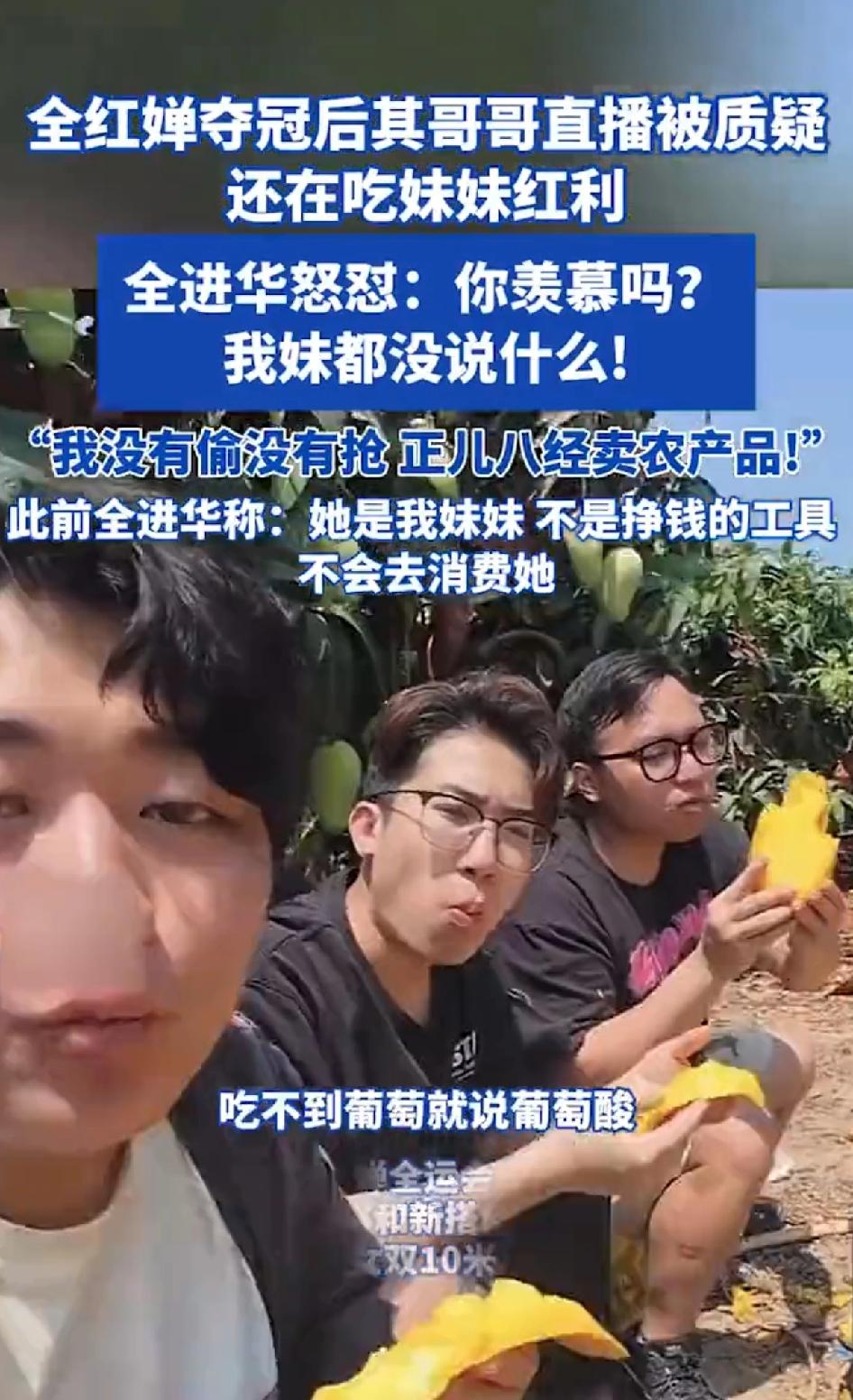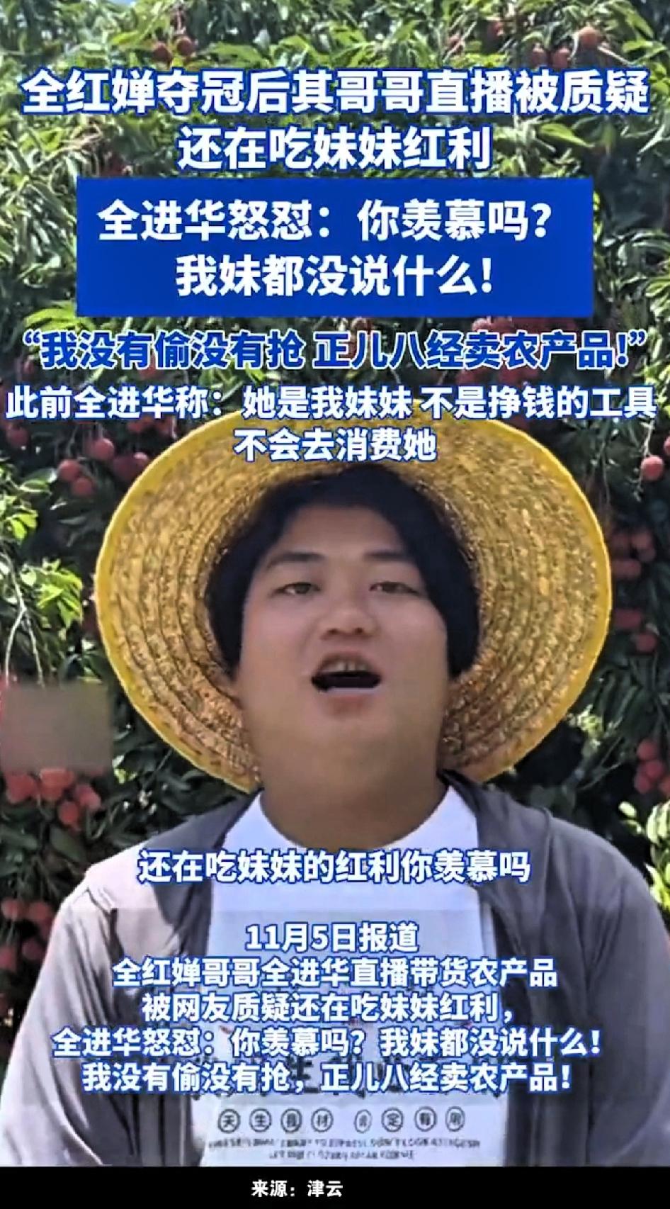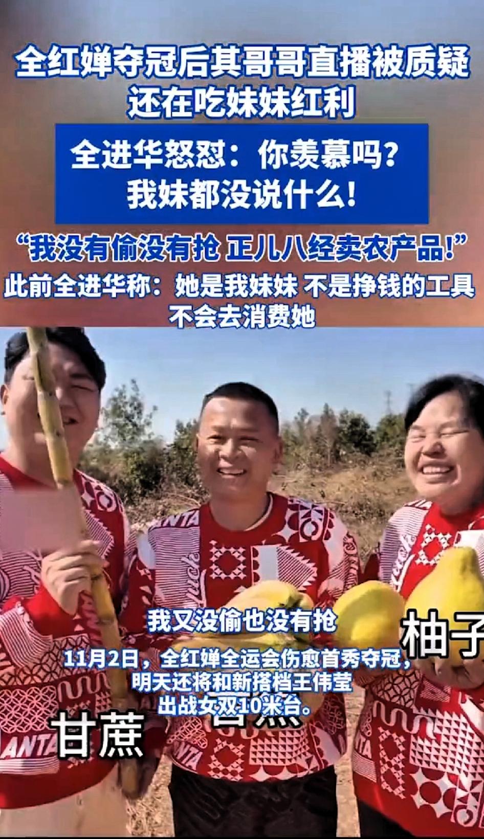 全红婵夺冠后,哥哥全进华直播助农被质疑还在吃妹妹的红利?哥哥听后霸气反击:你羡慕吗?我妹都没说什么! 我又没偷没抢,正儿八经卖货”。 11月2日全红婵伤愈首秀就夺全运会金牌,6日还将出战女双。教练透露她带伤参赛,身上满是肌贴,疼得厉害还坚持。 其实全进华之前参加美食节目就有过争议,被淘汰后不服气回应,最后还道了歉。 学生努力学习、成年人努力工作、不都是为了让自己和家人获得好的生活质量!全进华直播助农产品只要没问题,那还有什么好质疑的? 人家的热度来源于妹妹全红婵,多正常的事。整个迈合村的热度都是靠全红婵带起来的! 更何况全红婵的家人,他说不会消费妹妹,可他现在的热度确实和全红婵名气有关。但不管怎样,只要是正经做事,卖的产品质量好,也没啥可挑刺的。 如果真是看不惯可以不买!不用阴阳怪气的。