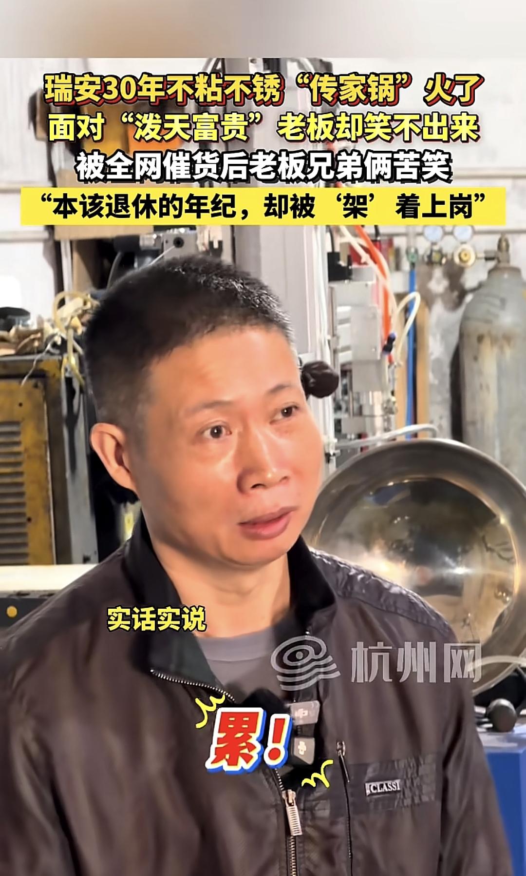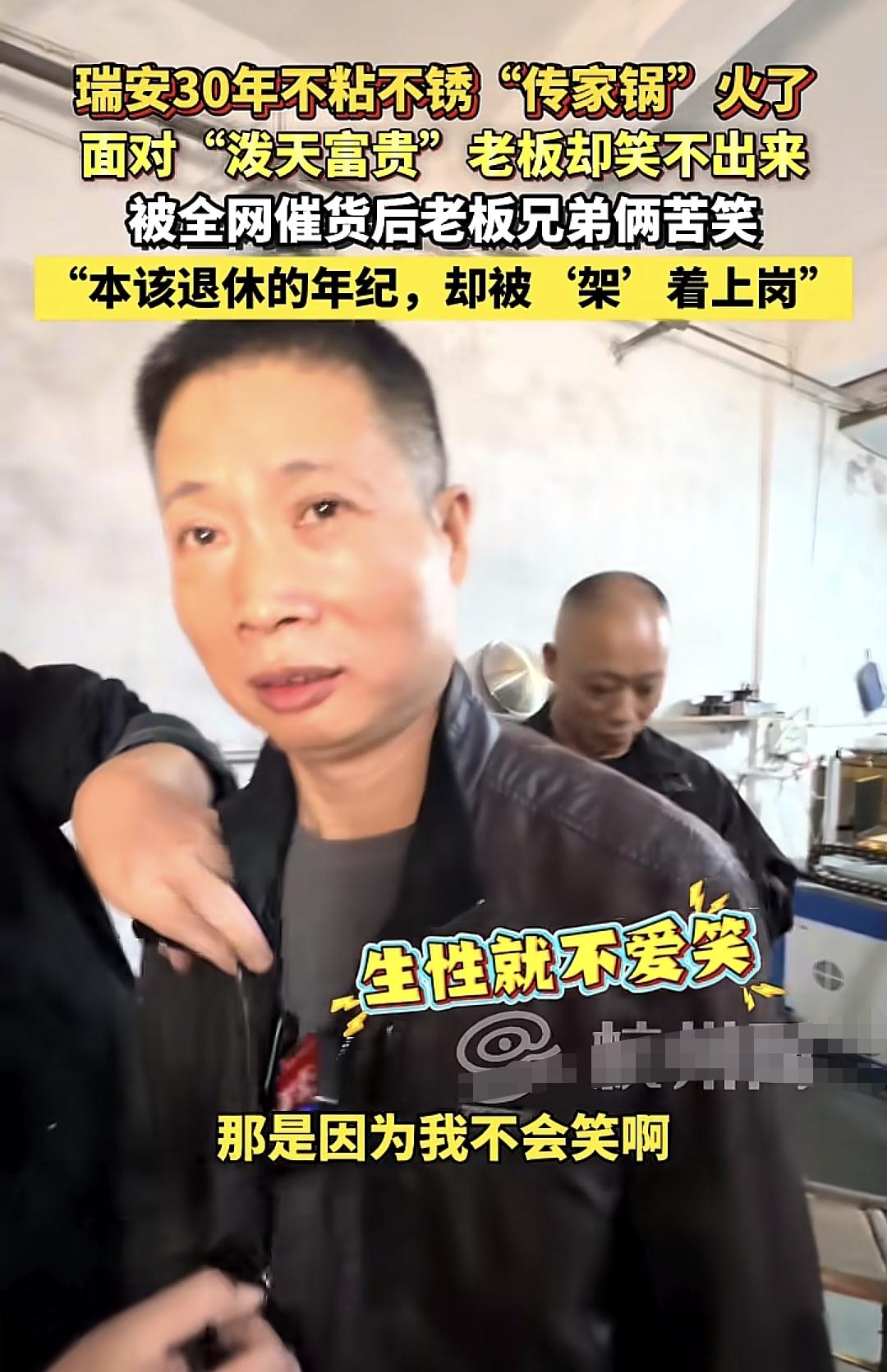 瑞安传家宝老板面对“泼天富贵”却笑不出来了,原本是该退休的年纪了,还得继续干活,主要是现在网暴已经慢慢开始了,这锅还没开始卖呢! 记者问“老板网友都问你怎么不爱笑啊?” 傅老板“ 我这人天生不会笑,我不会笑” 记者“那这两天累不累啊”? 傅“累,比干活还累” 我觉得老板过段时间可能更累,不会开锅的网友肯定会网暴你的锅,不锈钢的本身就是耐用,想不粘锅都是靠自己养锅,就怕到时候买了锅的说粘,老板就要塌房了,太难了! 现在这个老师巴交的老板是骑虎难下了,难怪笑不出来! 瑞安锅 瑞安五星锅 瑞安传奇锅