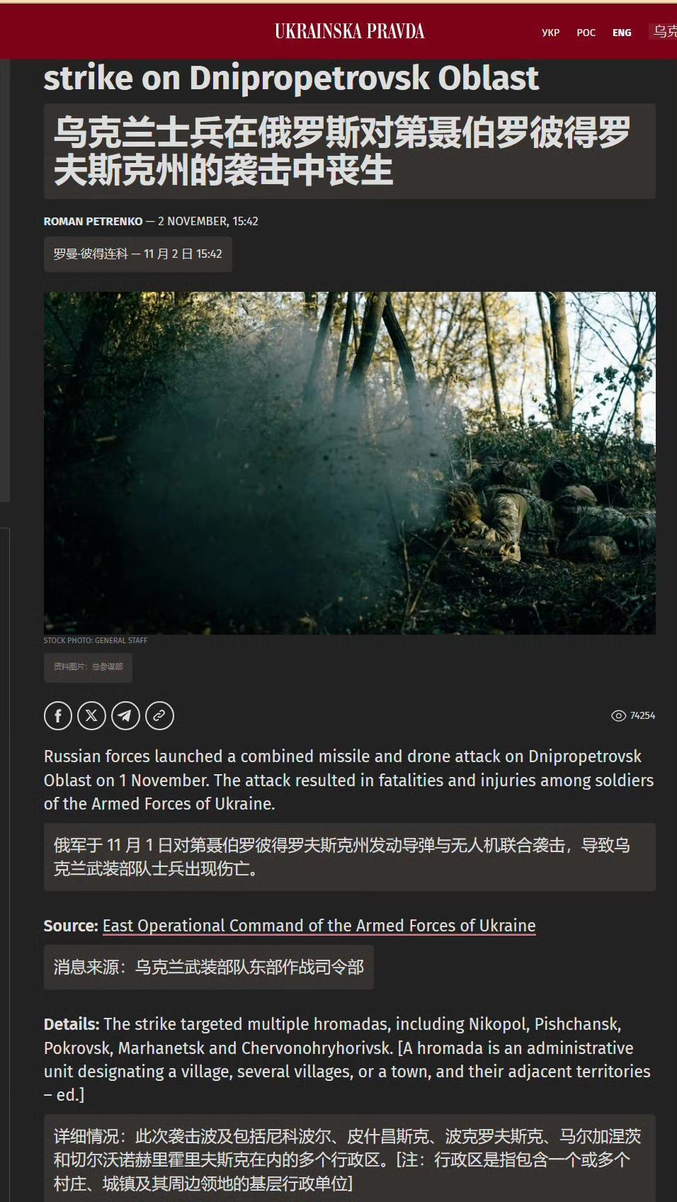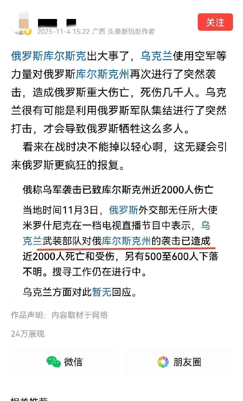 就在刚刚。 一位财经博主突然宣布了:乌军动用空军等力量对俄库尔斯克州来了一次突然袭击,俄军一次性死伤几千人。 先把数字摆清。公开报道显示,这个“几千”是自2024年8月乌军首次打库尔斯克以来的累计伤亡,并不是某一次突然行动造成的即时结果。把阶段统计当成当天战况,容易误导。 时间线上看,最近两天的单次重损发生在乌后方。11月1日,俄军用导弹和无人机对第聂伯罗彼得罗夫斯克州实施打击。TSN电视台记者称,袭击发生时,一支乌军正在露天授勋。 这起事件的地点、时间、活动性质都有报道,画面与细节相对完整。它与所谓库尔斯克“突然一击歼灭数千人”的说法不相符,不能混为一谈。 再看空中力量。乌军F-16目前据乌方和多家媒体公开说法,主要承担后方防空戒备任务。迄今没有权威消息确认其深入俄罗斯本土的库尔斯克州执行打击。 俄方公开通报中,也未出现“单次损失几千”的说法。以现有的无人机、火箭弹、导弹等投送规模,要在一次行动造成这种级别的伤亡,所需条件并不具备。 地面态势同样限制行动。据公开估算,俄军在乌北部苏梅一带建立了约200平方公里的缓冲区,用于压缩乌军活动与通道。乌军若要向北推进,必须先稳住这里。 这意味着,短时间内从苏梅方向扭转态势,再北上至库尔斯克实施大规模突击并维持补给,难度很高。与网传“几个小时内突袭并造成巨量伤亡”的叙述不一致。 对照以往打击样式,乌军在库尔斯克方向多采用无人机、火箭弹、导弹轮番攻击,重点打基础设施、补给点、雷达等目标。这种打法是持续消耗,而不是集中歼灭。 即便出现单点重创,官方发布和主流媒体报道通常会给出位置、时间与现场信息。截至目前,没有与“几千人单次伤亡”相匹配的证据链。 信息源也要看背景。此次发帖者为财经领域账号,关注点与前线报道不同,缺少对部队情况与作战节奏的长期跟踪,误读和夸大更容易出现。 核验此类消息有三步:看来源是否权威,看时间线是否连贯,看现地态势是否支撑。三步过一遍,结论就清楚了。 回到主题,库尔斯克方向仍在拉扯,伤亡在累计,设施在反复受损。把阶段统计包装成一次性重创,会让公众判断跑偏。 信息要硬,表述要准。少被零散消息带偏,多对照官方与主流媒体的公开材料,再下结论。