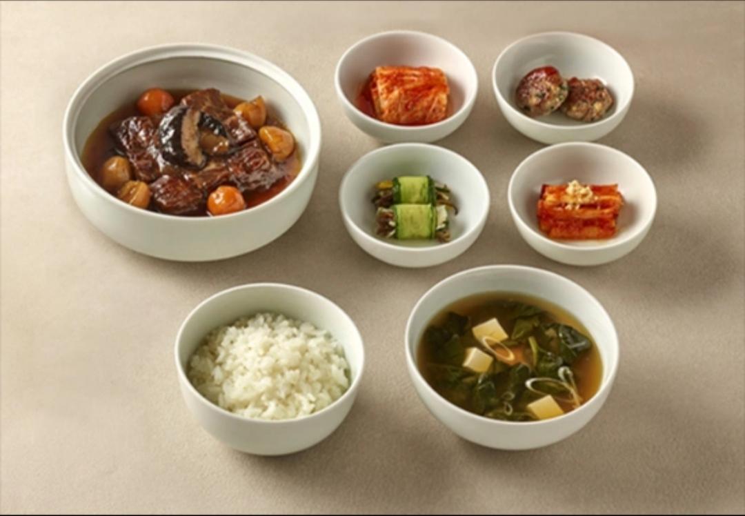 这是特朗普在韩国访问期间吃的韩国国宴,怎么说呢?竟然赶上我的工作餐了你敢信,只是装盘没有这么讲究! 开胃菜是沙拉,以生菜、番茄等新鲜蔬菜搭配千岛酱。(图一) 主菜是韩式诚意拼盘配美国牛肉。选用韩国庆州产的新米,搭配慢炖美国牛小排,佐以传统泡菜、西葫芦和迷你牛肉饼,搭配特朗普钟爱的番茄酱。(图二) 甜点是装饰金箔的布朗尼蛋糕与柑橘水果拼盘。(图三) 这真不怨特朗普回到酒店点美式汉堡吃。