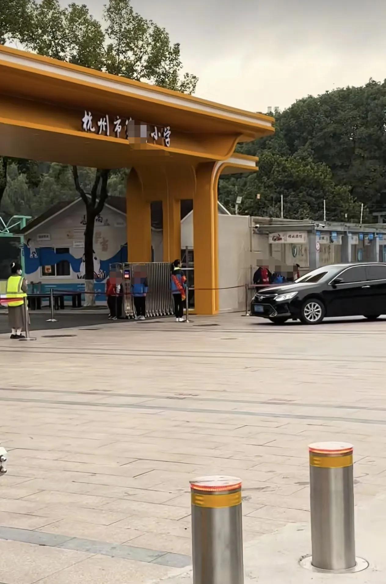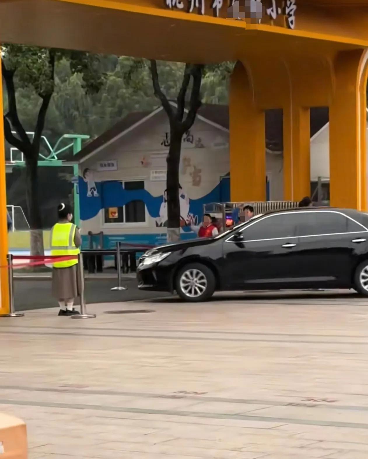 杭州一小学学校大门口,数名小学生站在校门的两侧,向驶入学校的机动车辆行少先队礼,