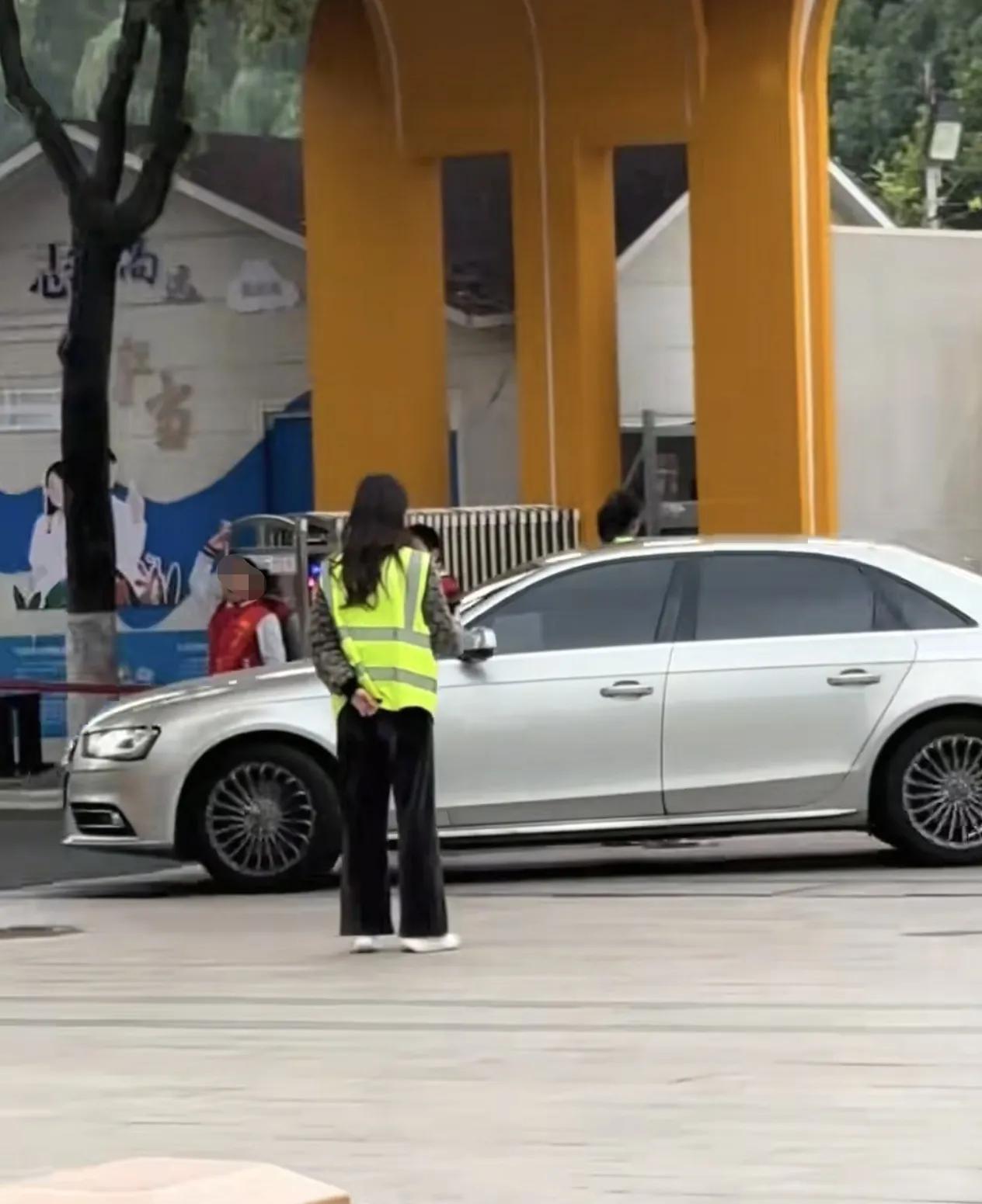 杭州一小学学校大门口,数名小学生站在校门的两侧,向驶入学校的机动车辆行少先队礼,并大声喊:“老师早!”