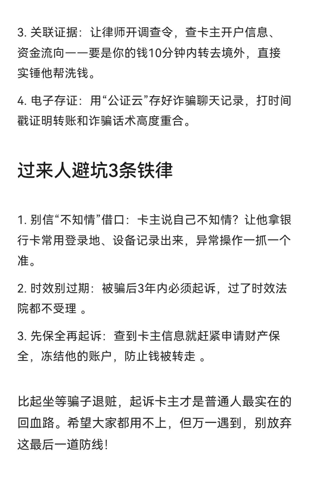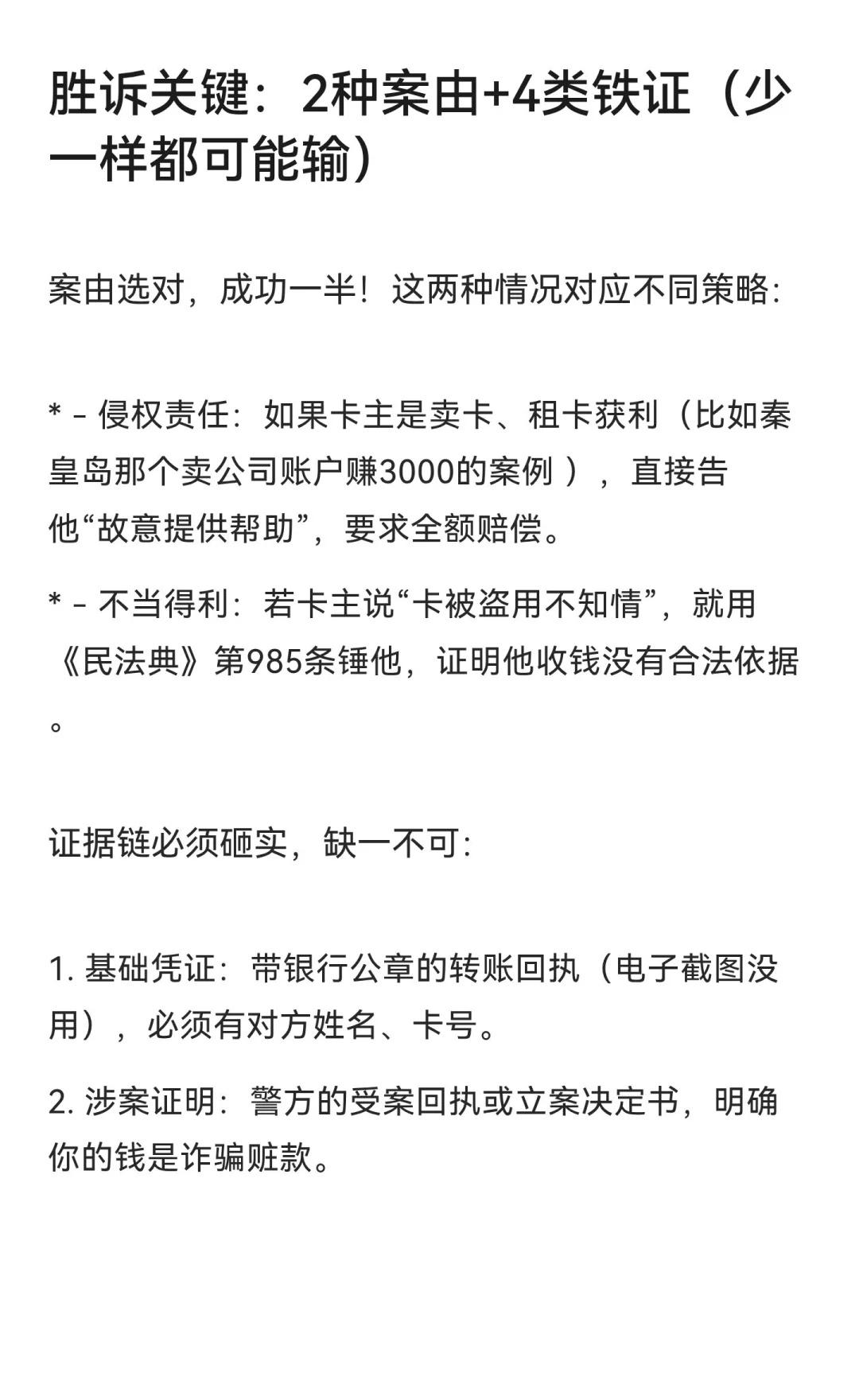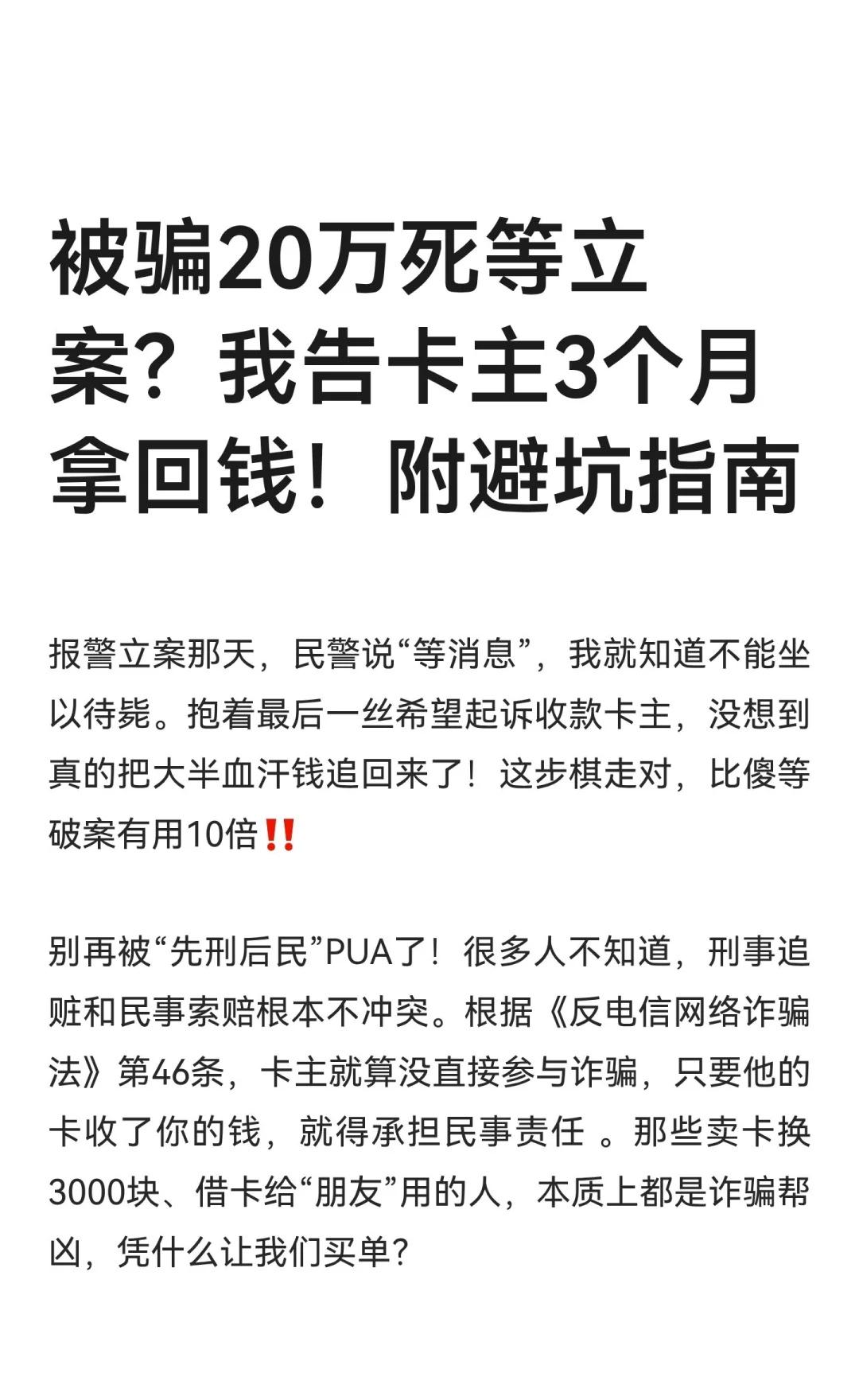 被骗20万死等立案?告卡主3个月拿回钱! 起诉收款卡主是追回诈骗钱款的有效途径。根据《反电信网络诈骗法》,卡主需承担民事责任。胜诉关键在于选对案由和收集充分证据,如转账回执、警方受案回执等。别信“不知情”借口,及时起诉并申请财产保全,比坐等骗子退赃更实在。追回被骗的钱 用法律武器保护自己 远离诈骗陷阱 反网络诈骗 起诉法律服务