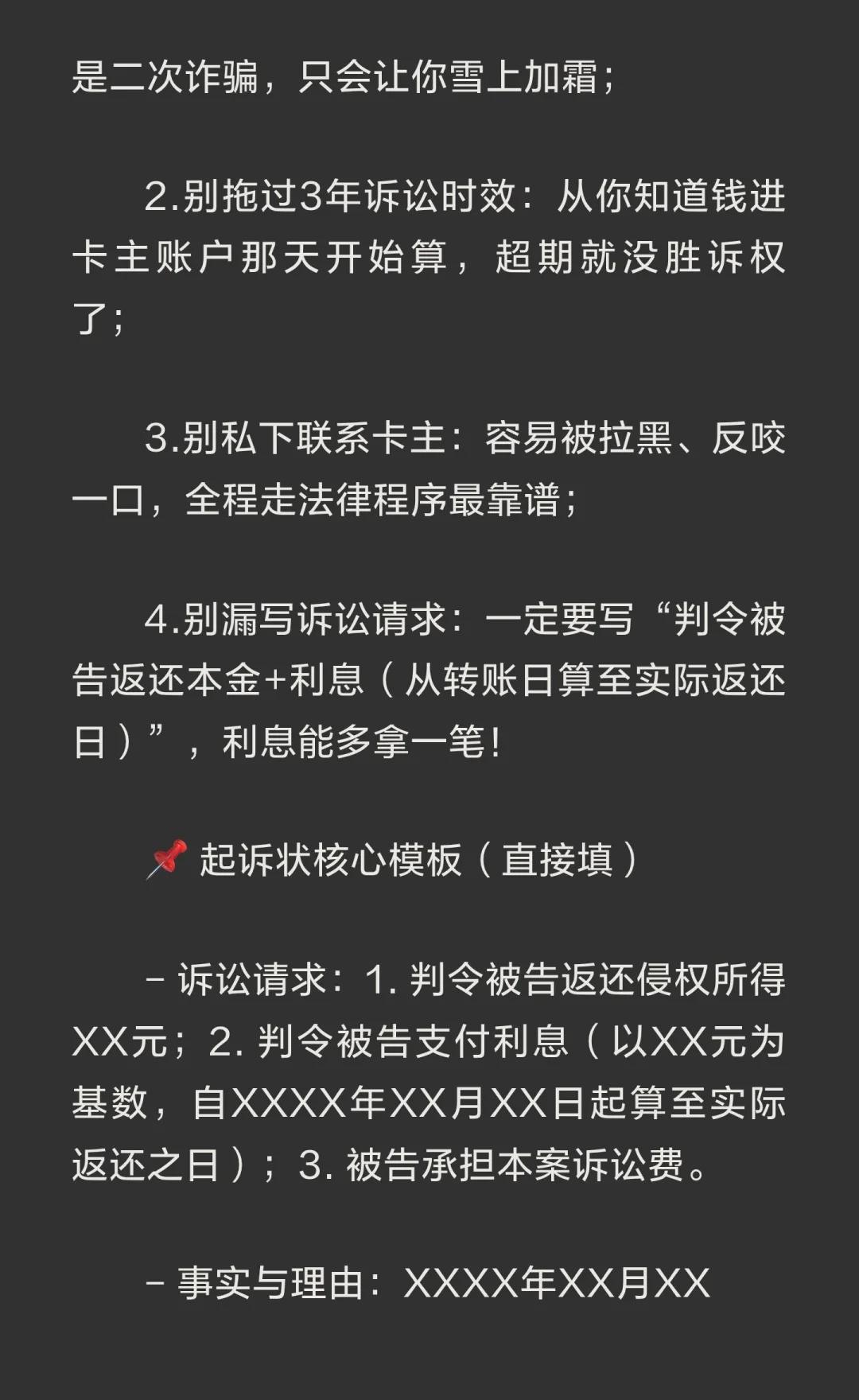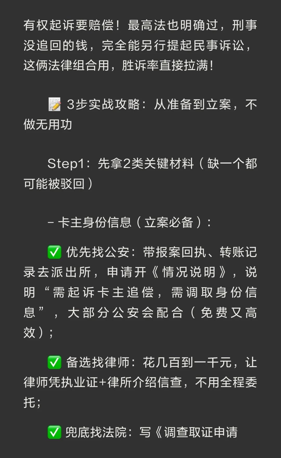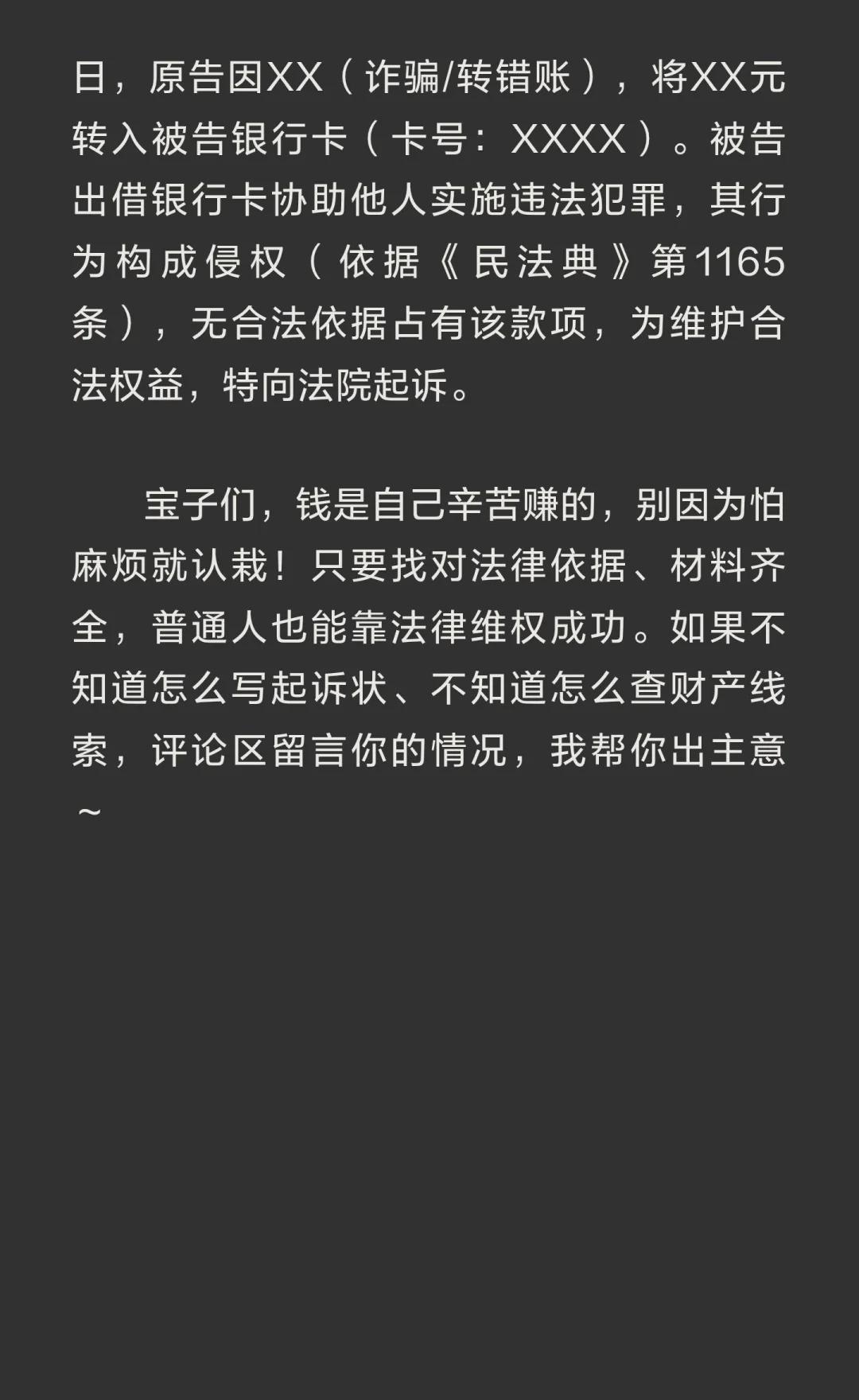 起诉卡主不被驳回!我靠1个关键技巧追回12 被诈骗后,钱进了陌生卡主账户,报警追赃无果,起诉又怕被驳回?我分享实战攻略:精准找对法律依据,胜诉率高。3步实战攻略:准备材料、线上立案、执行阶段。避免踩坑,确保钱款追回。被骗追回 民事起诉 普通人维权 法律常识 反诈骗 追款攻略 线上立案追回被骗的钱