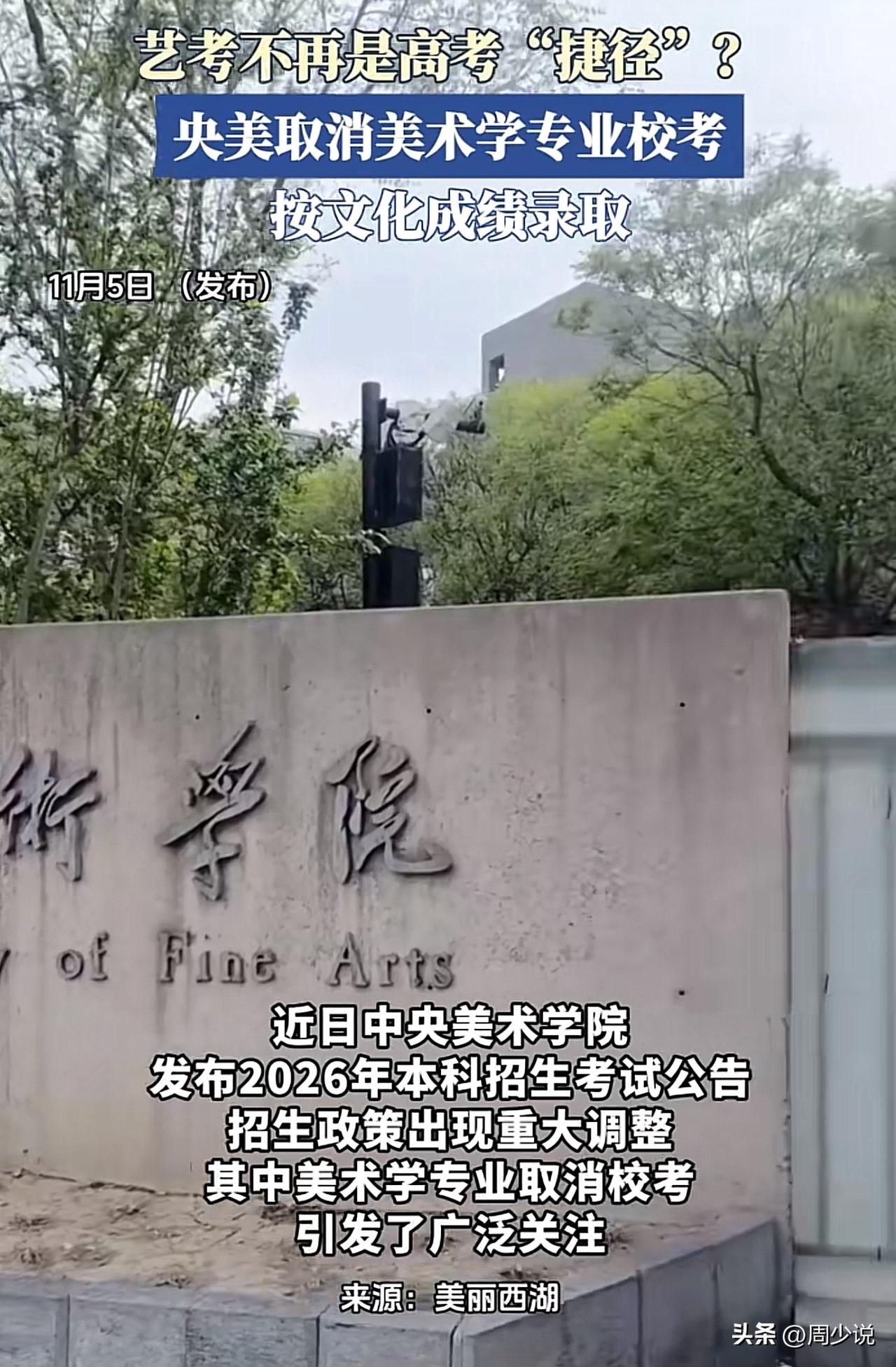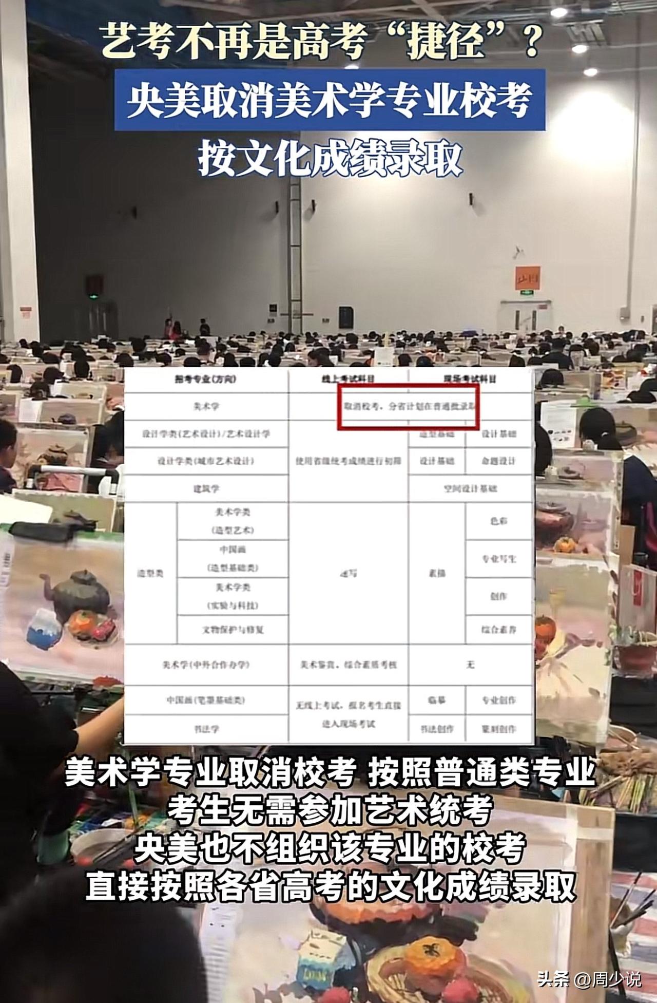 #招生办回应中央美院取消校考#艺术生圈炸锅!中央美术学院取消校考?招生办回应:仅这一个专业,占比仅3%,真相来了! 近日,“央美取消校考”的消息在网络热传,让无数艺术生和家长慌了神。11月5日,中央美术学院招生办正式回应:确实有专业取消校考,但并非全部,仅针对“美术学”专业方向。 根据《中央美术学院2026年本科招生考试公告》,“取消校考,分省计划在普通批录取”的规定,只适用于“美术学”专业,该专业主要偏向美术史论方向,对绘画技能要求较低。 参考2025年招生数据,央美总招生924人,其中“美术学”仅招30人,占比仅3%。这意味着,九成以上报考央美的学生,仍需通过校考这一“独木桥”。 对于央美取消校考,有网友说:“虚惊一场!还以为学美术的不用练基本功了,史论本来就侧重理论,取消校考合理。” 也有网友称:“3%的占比基本没影响,艺考生该刷题刷题、该画画画画,别被谣言带偏!” 还有网友则表示:“史论专业靠文化课和理论知识,取消校考更公平,总不能让写论文的和画素描的比画画吧?” 周少想说央美“取消校考”的谣言之所以引发恐慌,是因为校考是艺术生进入顶尖美院的核心门槛。但真相是,仅占比3%的美术史论专业取消校考,既符合专业培养需求,也能引导学生根据自身优势选择方向。 这也提醒艺术生和家长,面对招生政策变动,要以官方公告为准,切勿轻信传言。对于绝大多数艺术生来说,扎实的专业功底和文化课成绩,仍是考上央美的关键。 对于央美取消校考,大家怎么看呢?#长沙新朋友# #寻美三湘#