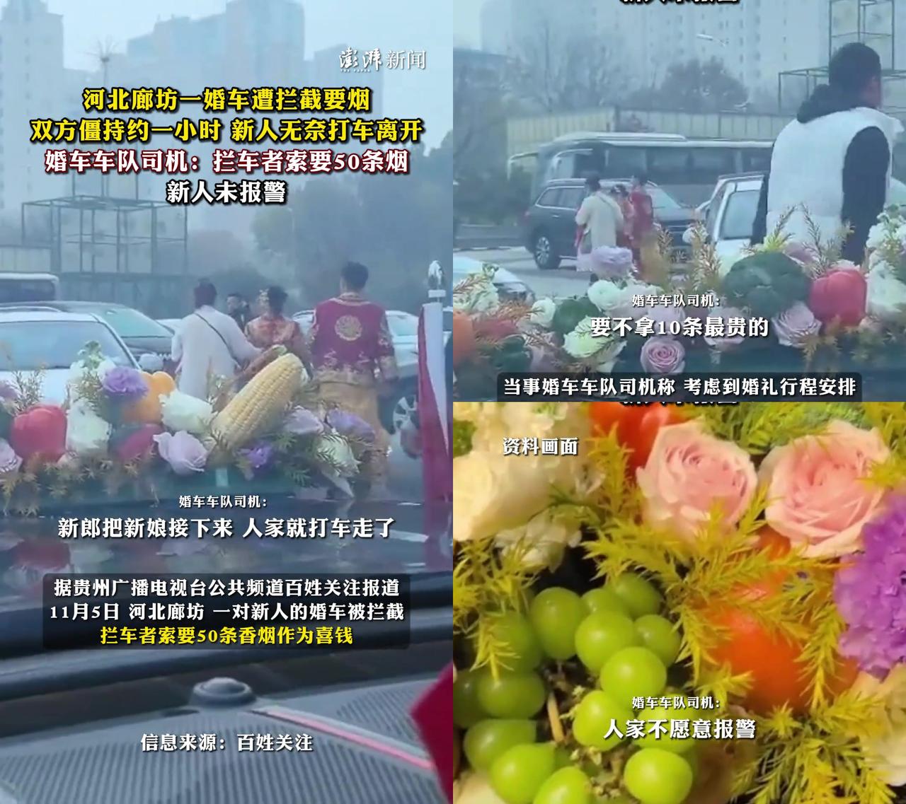 河北一对新人的婚车,居然被拦着要50条烟?! 11月5日廊坊,新人刚接完新娘,就被人堵了,拦车的开口要50条烟,砍到10条最贵的都不行,僵持1小时,直接打车走了,婚车都扔那了。 有人说这是敲诈,50条烟值2万,够判敲诈勒索;也有人说结婚率低不冤,好好的喜事变添堵;还有人怪新人没报警,太软。 原本讨喜气的拦门,怎么就变成明抢了?新人怕耽误吉时忍了,可这忍气吞声,难道不是让敲竹杠的更嚣张吗? 如果是你,会为了婚礼忍了,还是直接报警?
