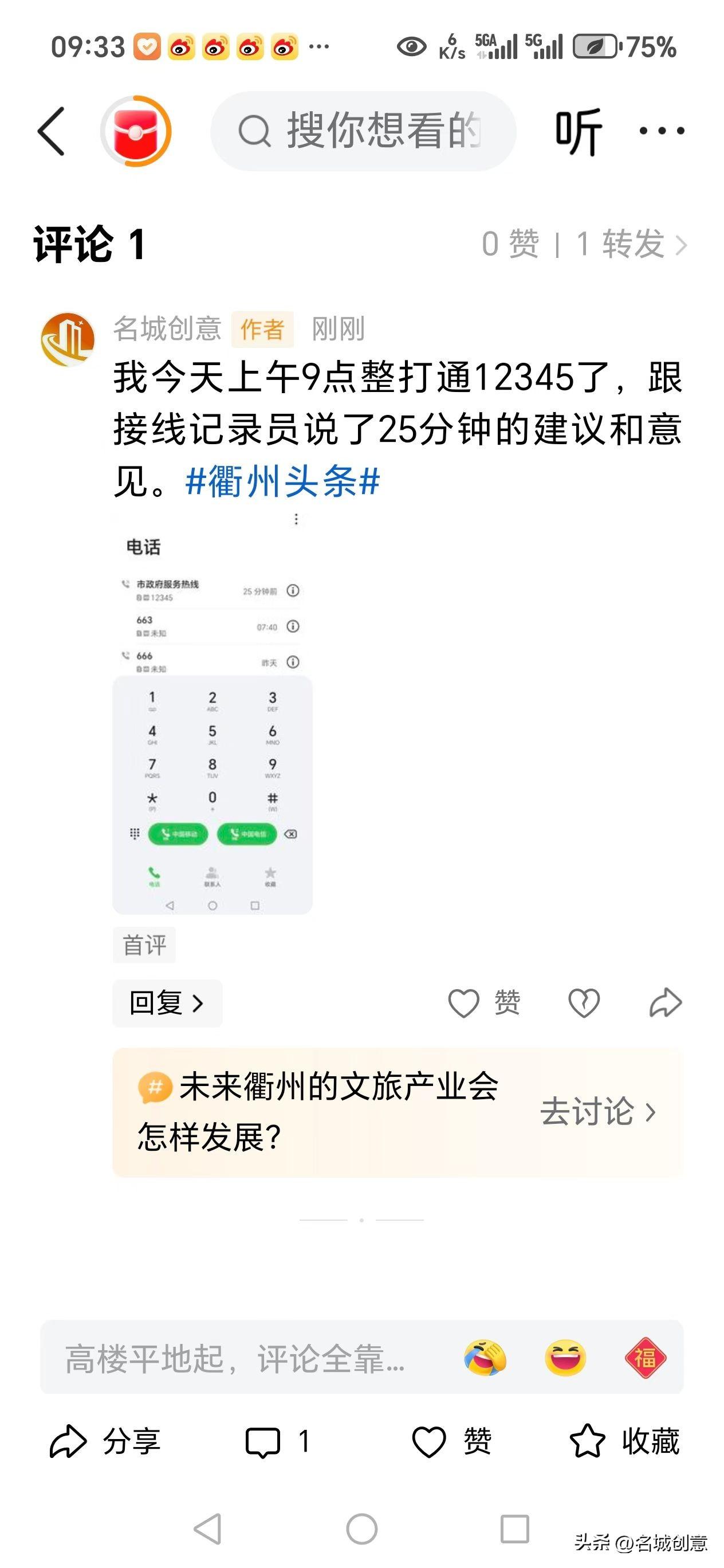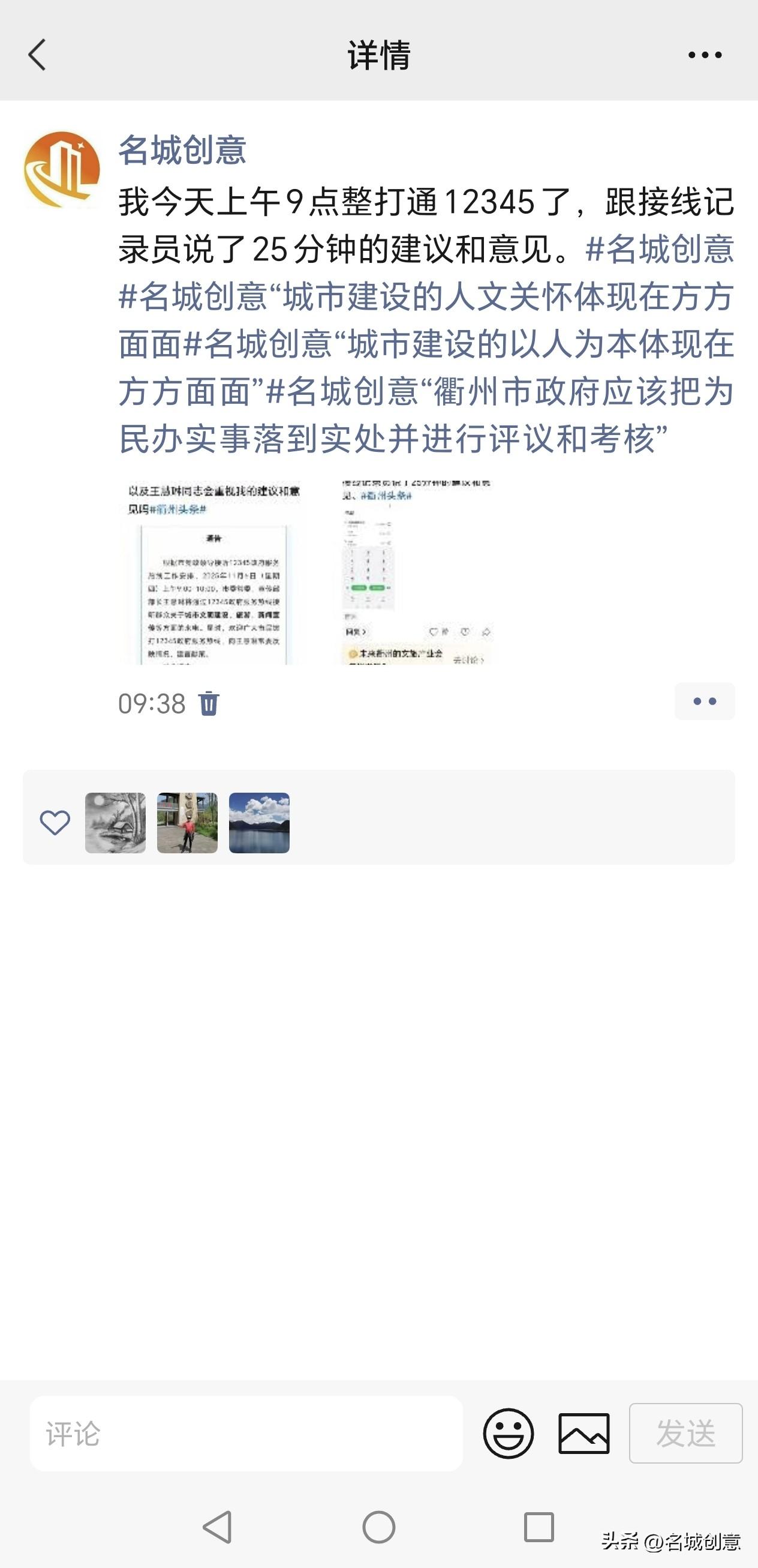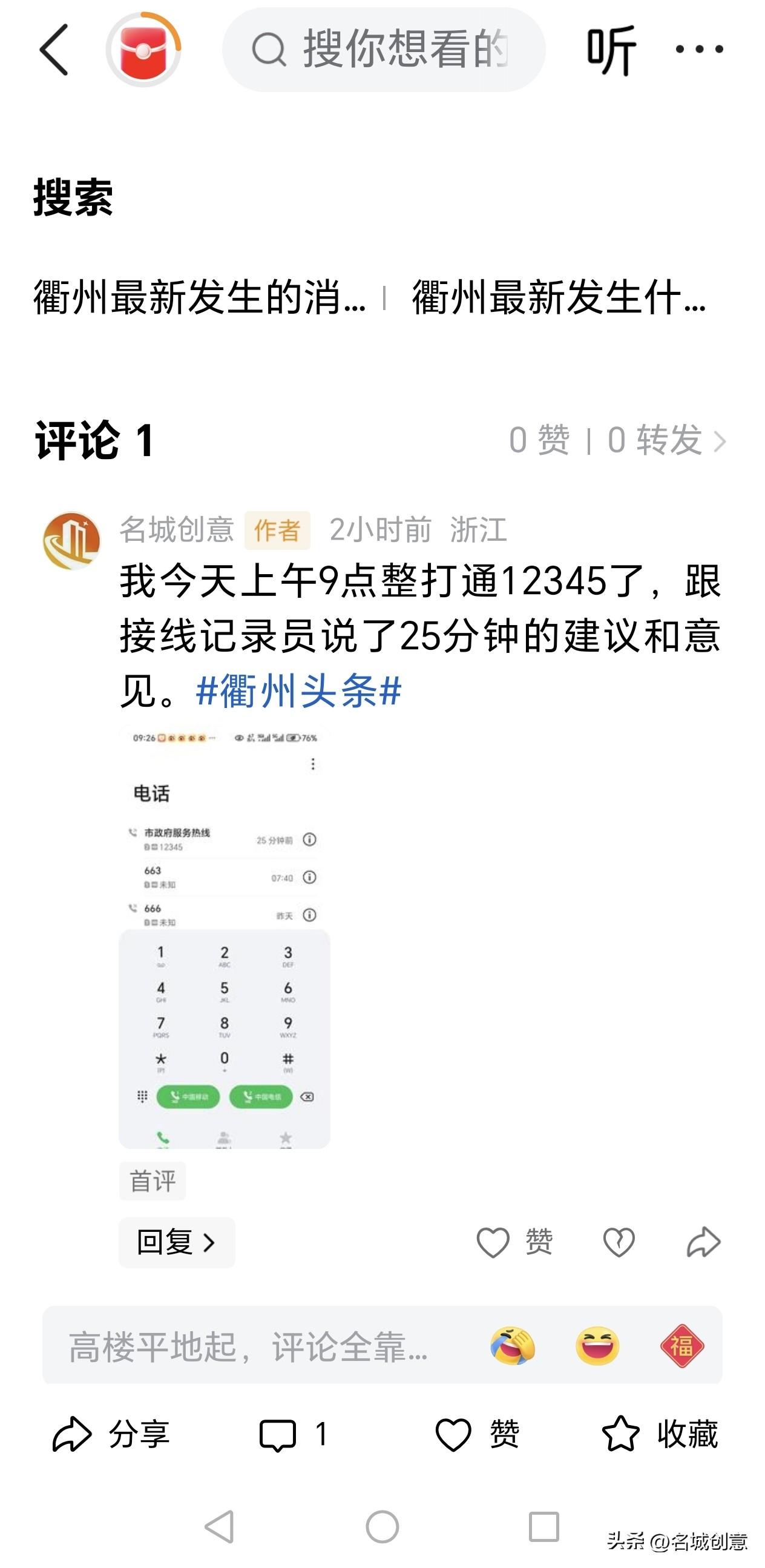 今日头条破天荒地显现了“1展现 5阅读”下面这篇微头条(看截屏①),肯定又是衢州市柯城区的县学塘里的白布怪出来作妖了[捂脸] 没办法啊,当今衢州三怪 遮天蔽日厉害👍得紧,草民我只好发在微信朋友圈,再看你们当今衢州三怪又如何应对? 今天上午9时许我打通12345市长热线,接线员小姐姐说会把我的建议和意见记录下来,交给衢州市委常委、宣传部王慧琳,于是我跟她说了25分钟。(看截屏④) 我的建议是:一、建议由衢州市政府出资,在衢州市柯城区的县学街、马站底等街道沿街设置动态广告灯箱,向外地来衢州旅游、看演唱会和体育比赛的消费群体展示衢州市诸如“聪明鱼爸爸牌聪明鱼”等名特新优产品,一方面为当地知名企业发展助力,另一方面能提高衢州的营商环境和城市美誉度。 二、建议衢州市政府在古城文化旅游区的沿街设置长椅,方便老龄化率已达30.1%、位居浙江省第一名的老人途中休息,也方便外地游客休息,以此提升全国文明城市衢州的休闲风、舒适度、宜居度。 三、建议(我不想说了,看看上述这样的建议也会被衢州市委宣传部下属的网信办予以屏蔽,我真的是相当无语)。 王慧琳部长你领导的网信办都是一些什么人在干呀?他们的工作职责也包括屏蔽市民的建议意见吗?[捂脸]