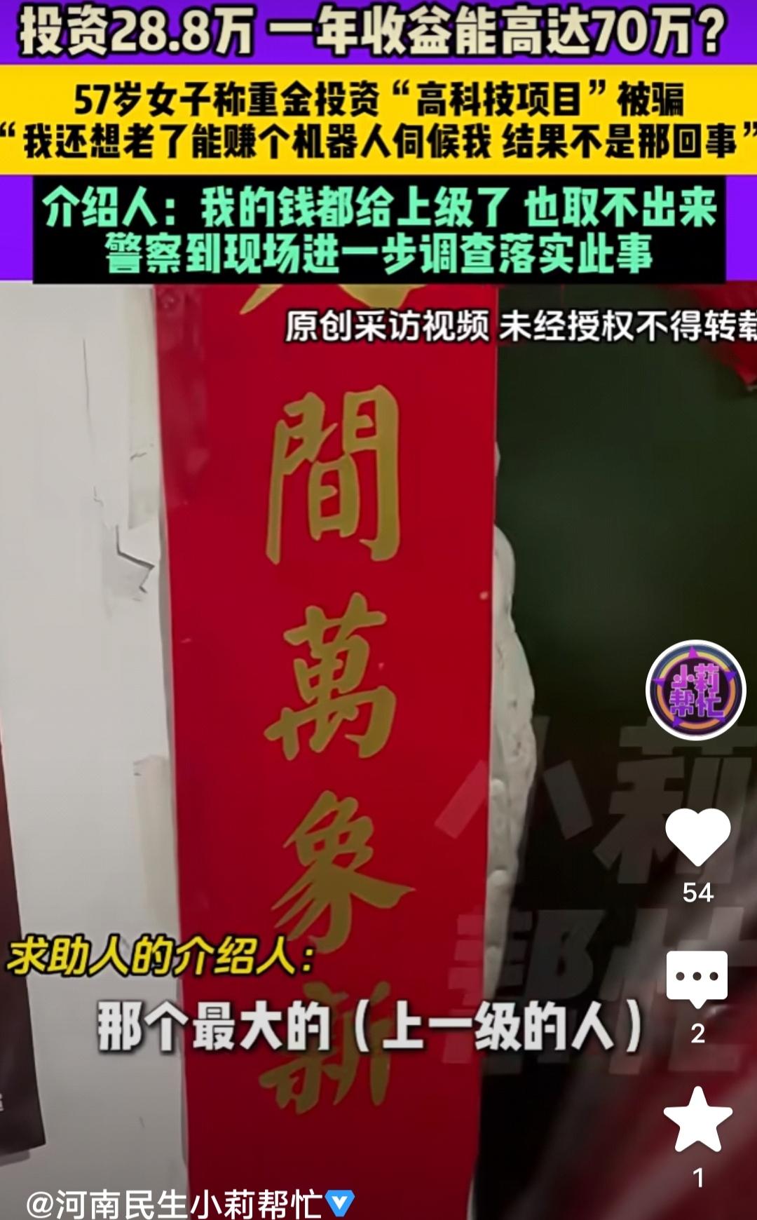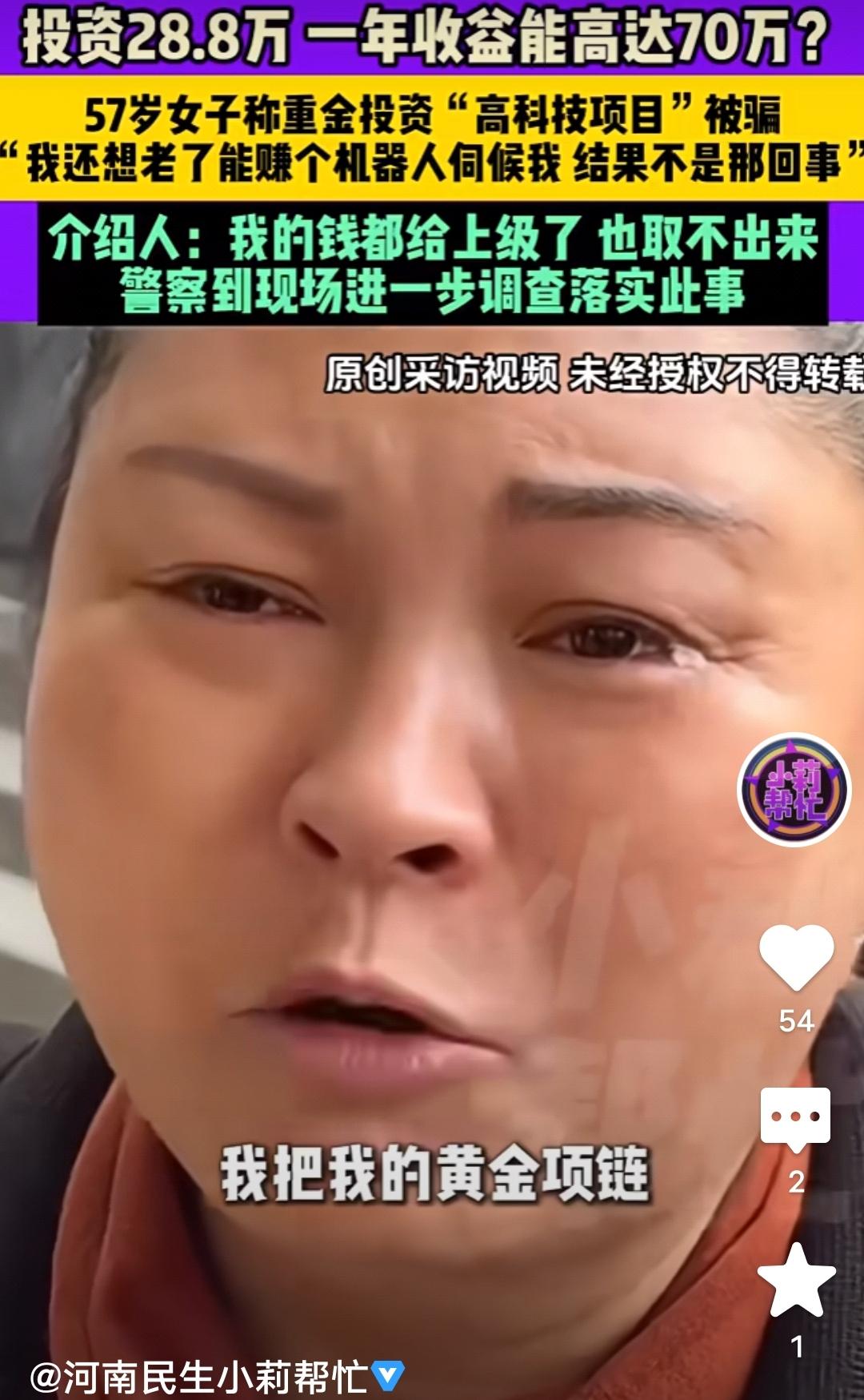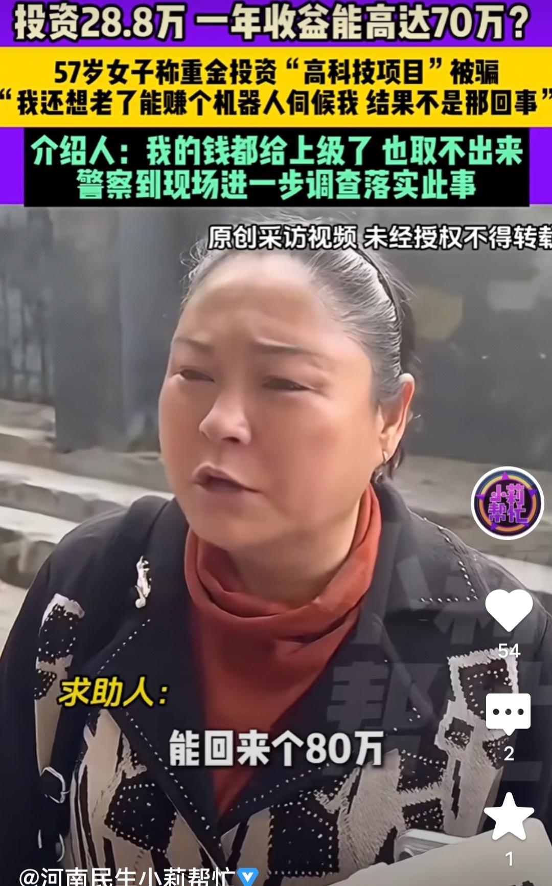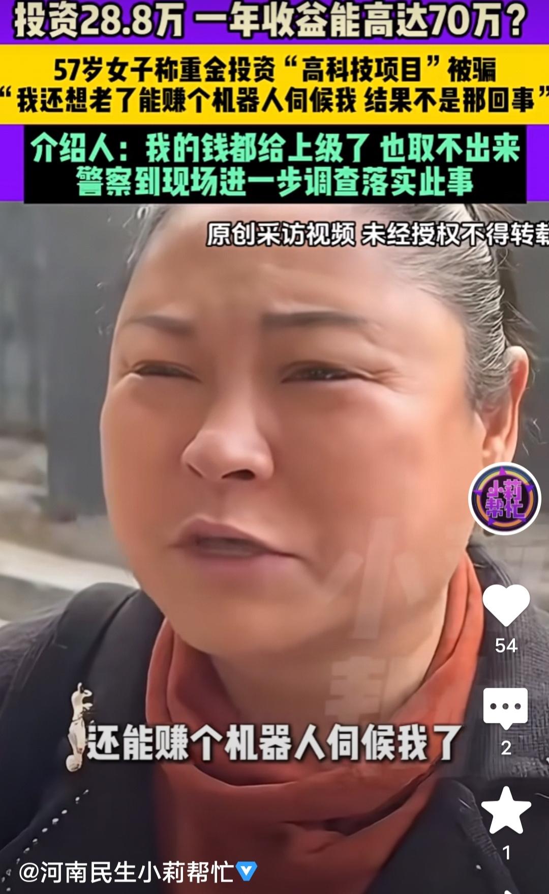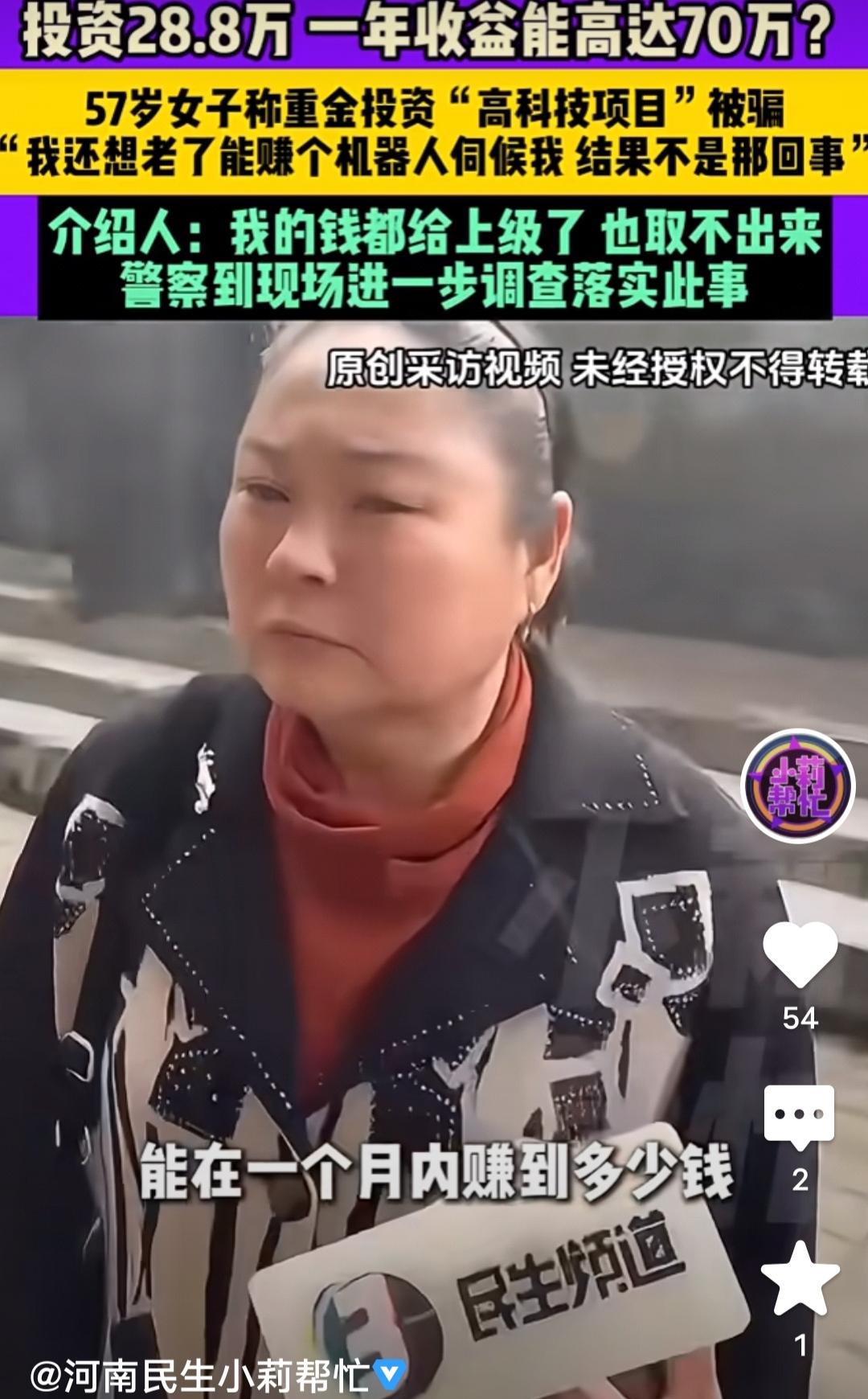 投资28.8万,一年收益能高达80万?老了老了还能挣个机器人伺候我? 友友们,乍一看这句话,大家信吗?我觉得但凡有点脑子的,都觉得这不可能吧!小莉帮忙看到的一个事件,河南一57岁女子称重金投资“高科技项目”被骗,开始她也没投那么多,开始投的两万,但是回来了,后面就让他们去听课,什么星光云,什么Ai,什么老了老了还可以赚个机器人伺候自己,听上去是不是好激动,好安逸?结果最后发现根本不是那回事,后来去找到介绍她投资的人,对方说:我的钱都给最大的上级了,也取不出来,最后警察到现场进一步调查落实这件事。 首先,骗子的骗术也是日新月异的,友友们一定要保持清醒,不要一听到几个流行,或者时新的词就好像觉得是那么回事,就放松警惕了,再说,对方说那么多时兴的专业名词,你听得懂吗?你都听不懂还敢投资?开始给你一点甜头那是骗子一贯套路,早就用烂了,大家要警惕! 永远要记住,任何投资都不可能是暴利的,正常的投资,都有运营成本,人员,场地,等等,一路下来,利润都不可能那么夸张,如果都那么好赚,天下就没有穷人了! 其实说白了,不要有过分的贪念,用常识看待问题,看待投资和机遇,便会减少很多被骗的可能。