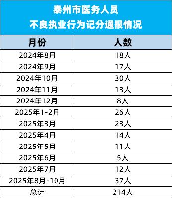 泰州试行医务人员不良执业行为记分管理办法一年多,累计214名医务人员被记分。近期通报显示,37人受处罚,其中4人因伪造病历、违规执业等被记满12分,面临离岗培训、延迟晋升等处理。
